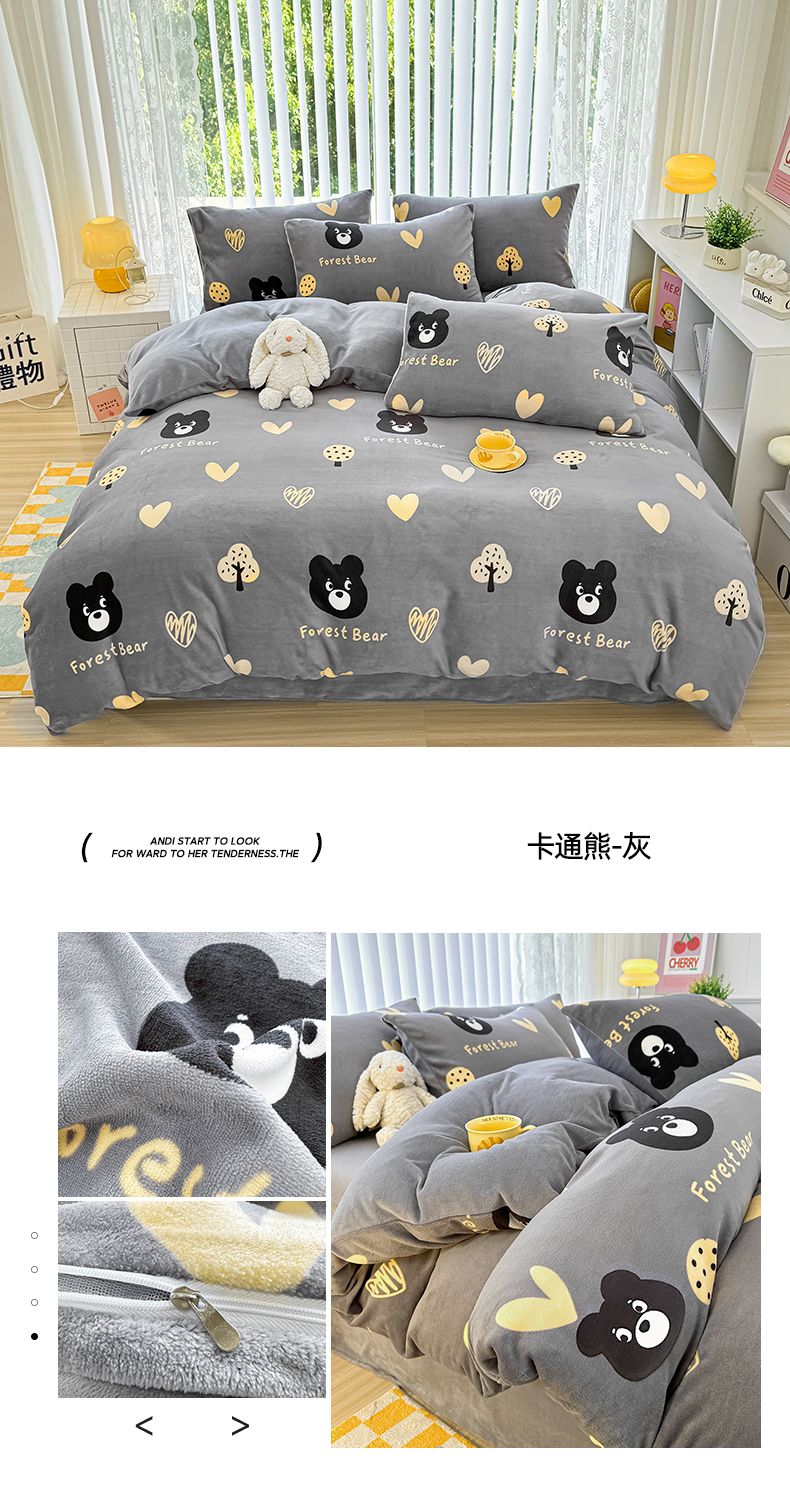 商品名称:觅妮家纺 2025新款全消光200g高克重秋冬加厚印花牛奶绒单被套 卡通熊-灰