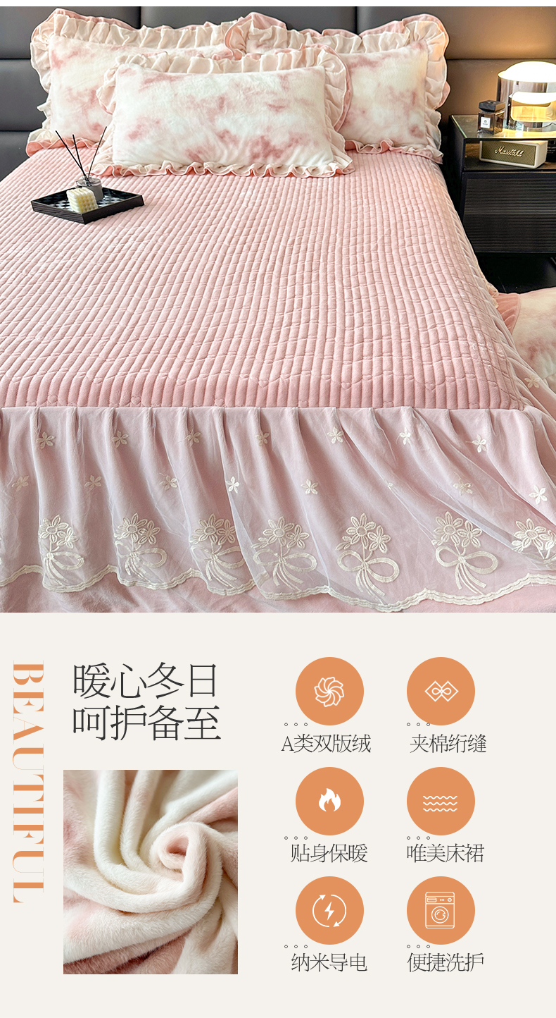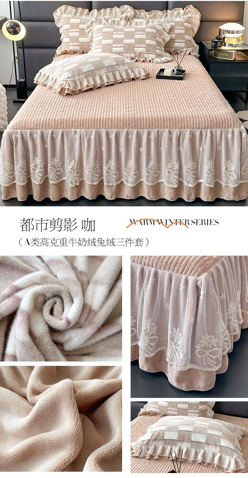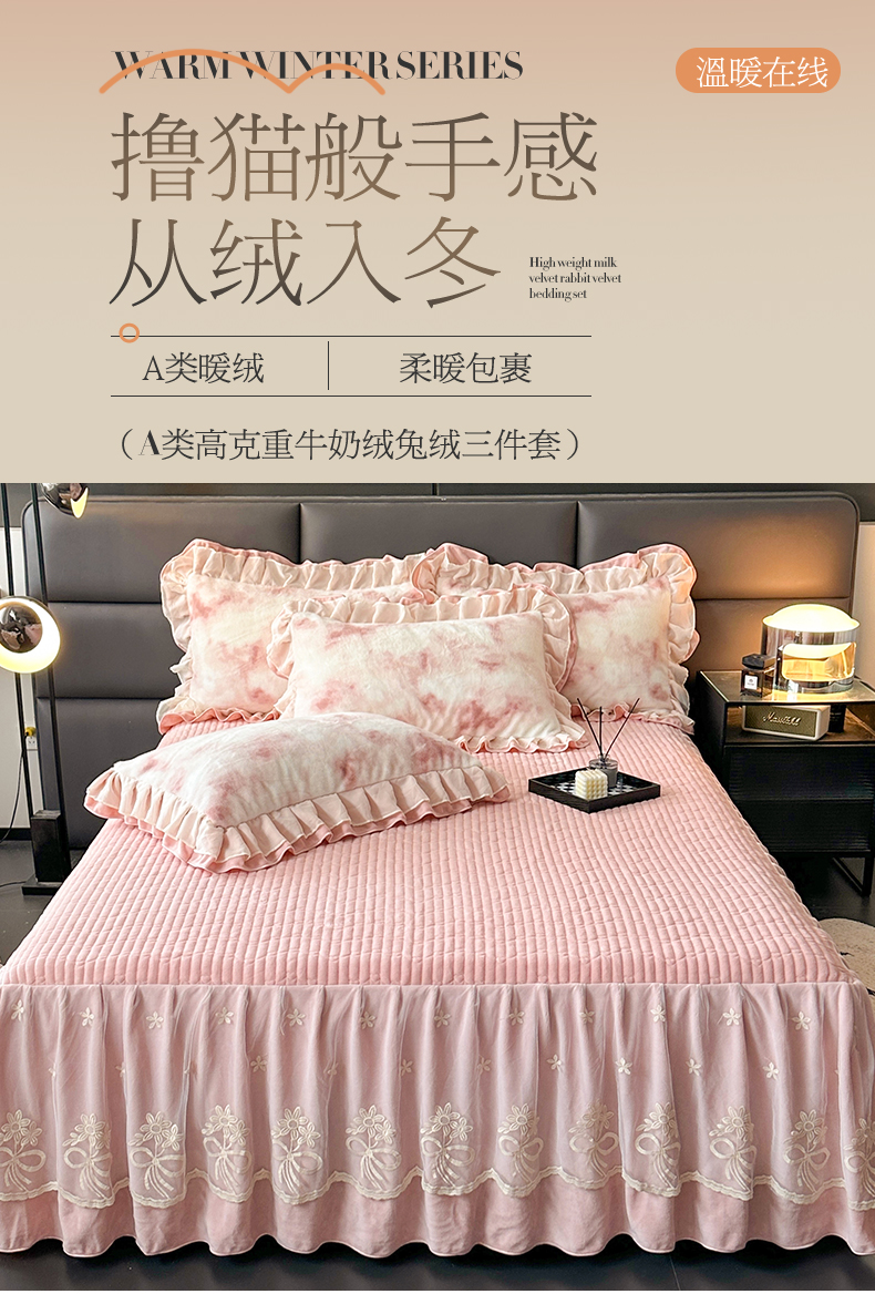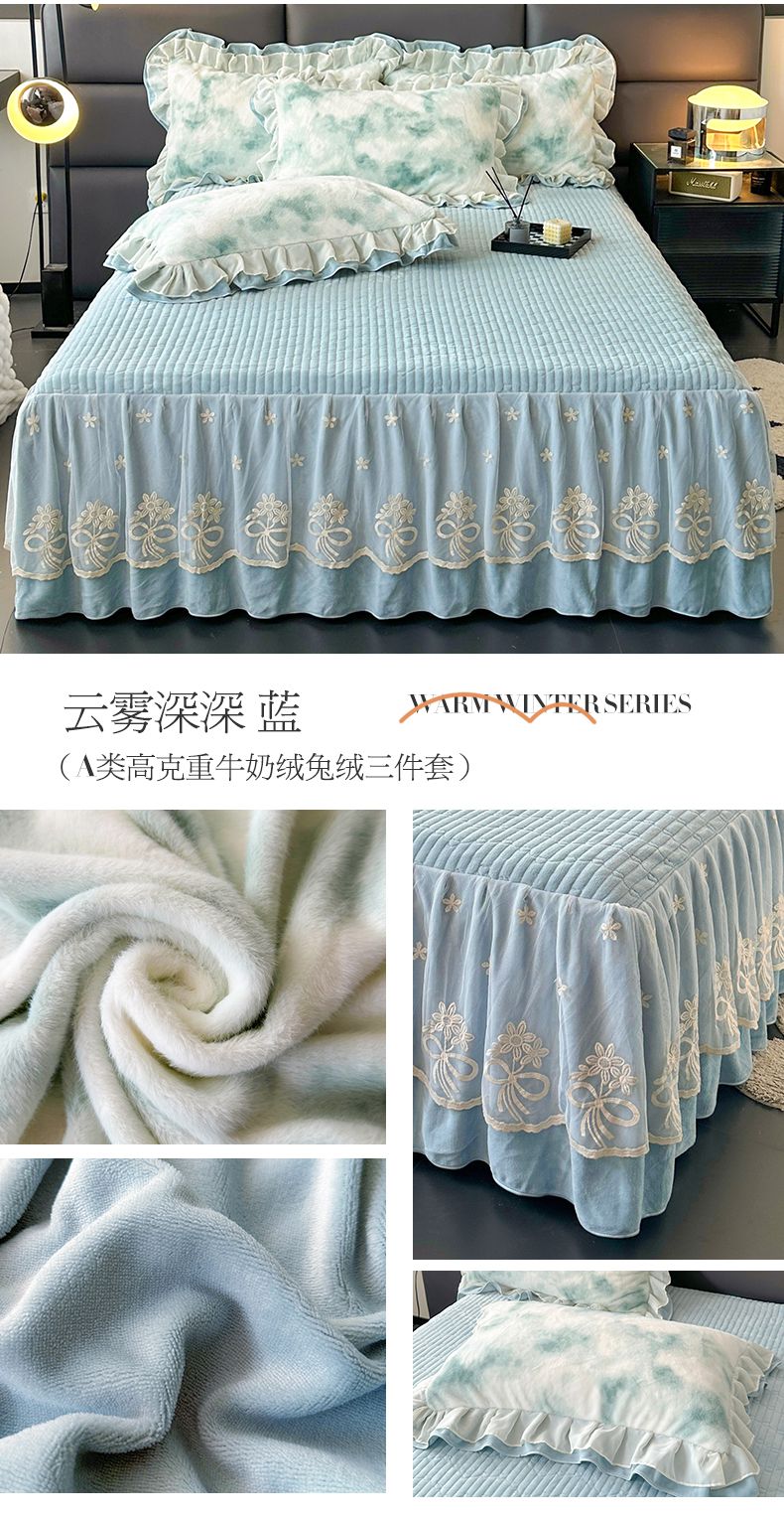 当前位置: 91家纺网 > 商品网购 > 床品套件 > 三件套 > 宜凡家纺 2024新款高克重牛奶绒兔绒床裙三件套 云雾深深 蓝