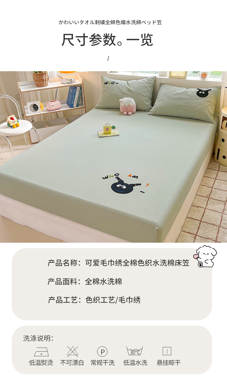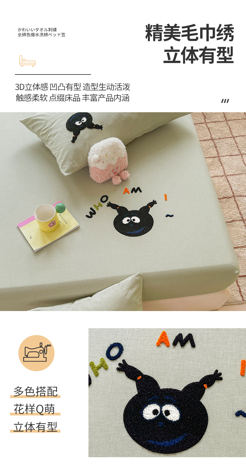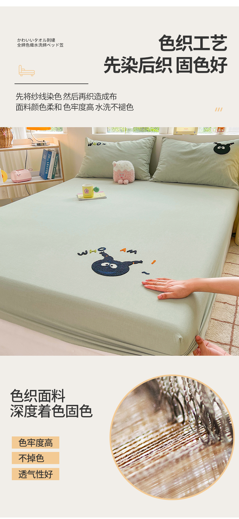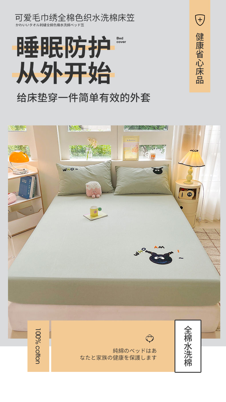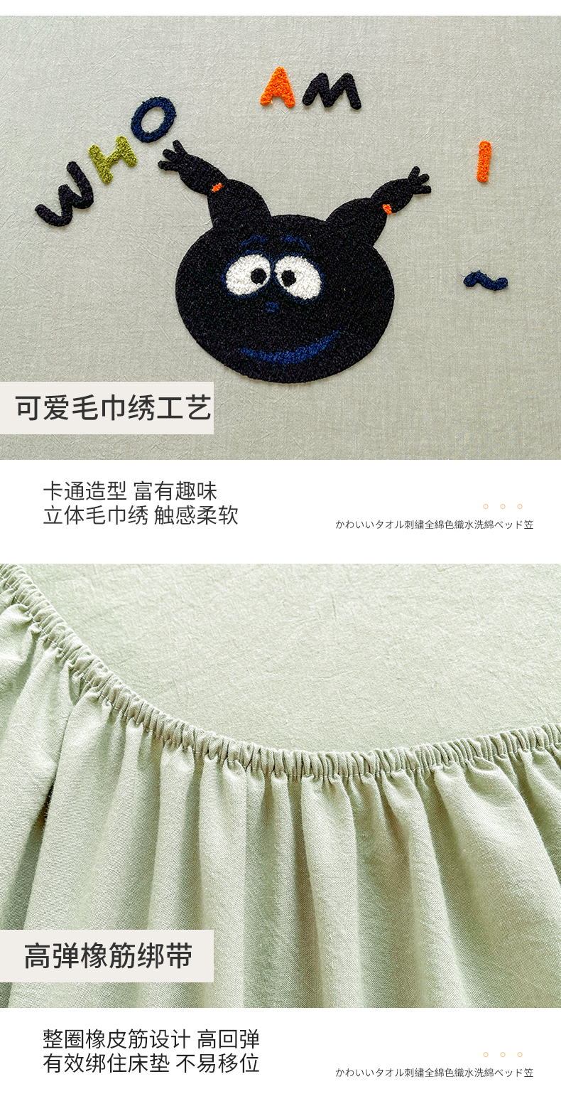 商品名称:3C 2024新款全棉色织水洗棉可爱毛巾绣床笠 黑乖乖-绿