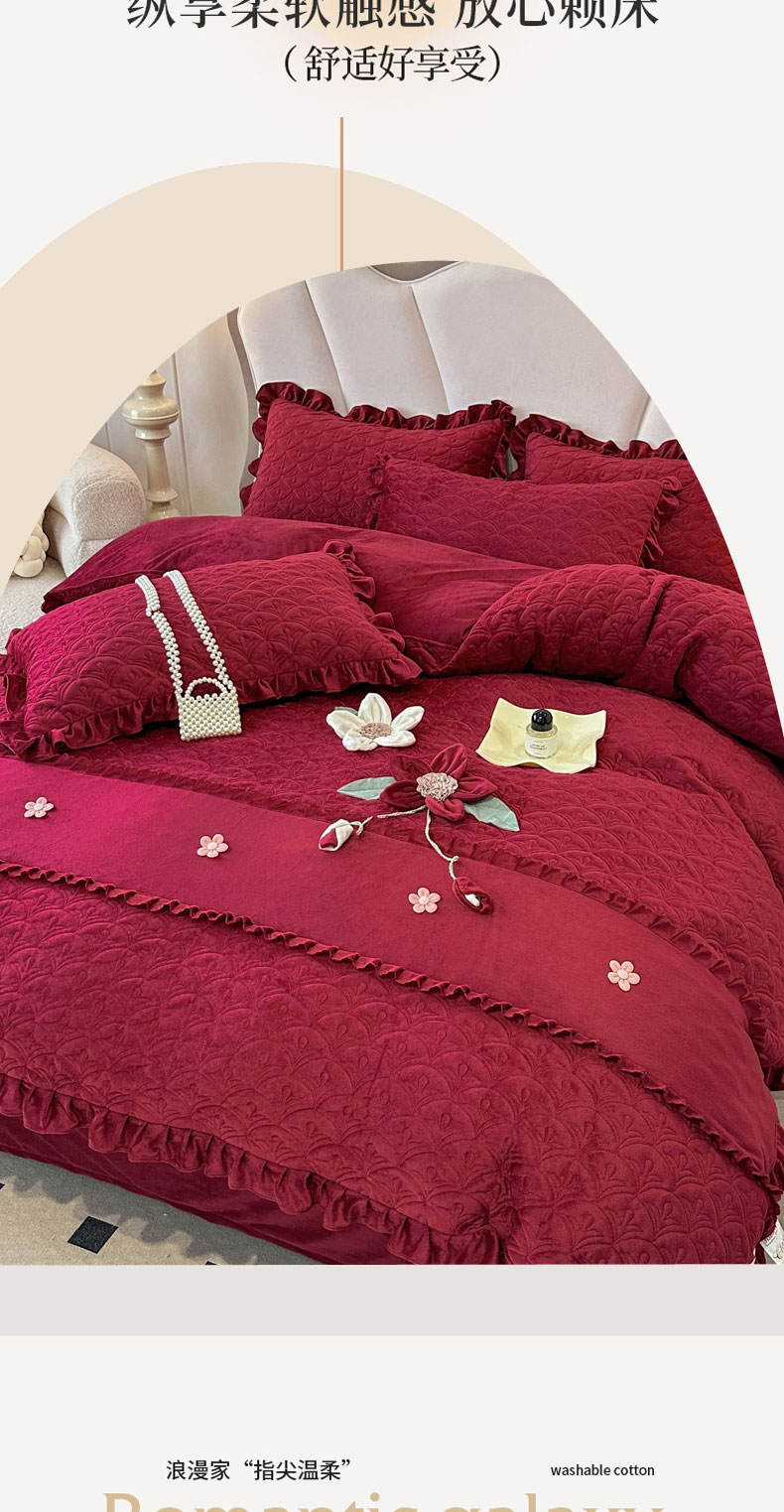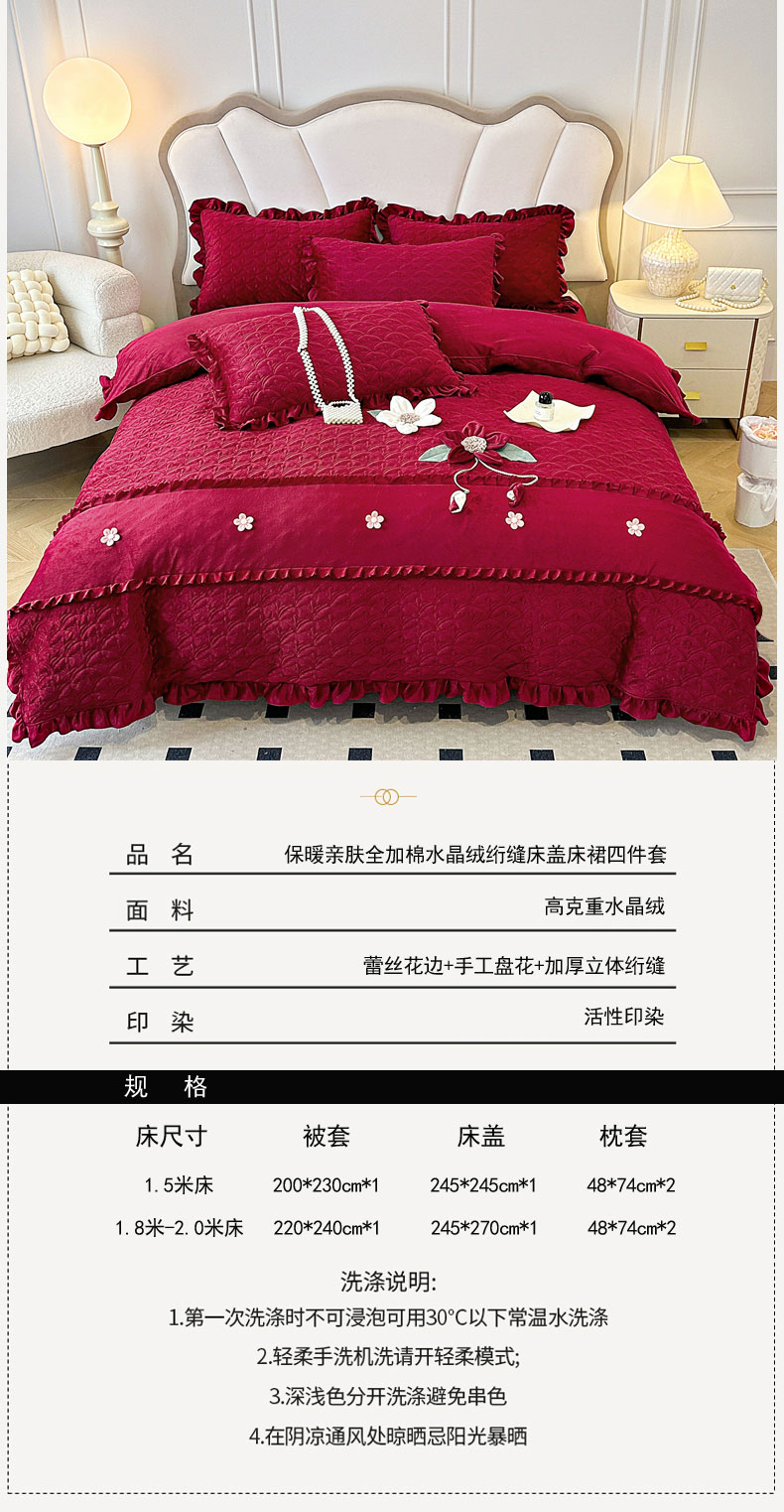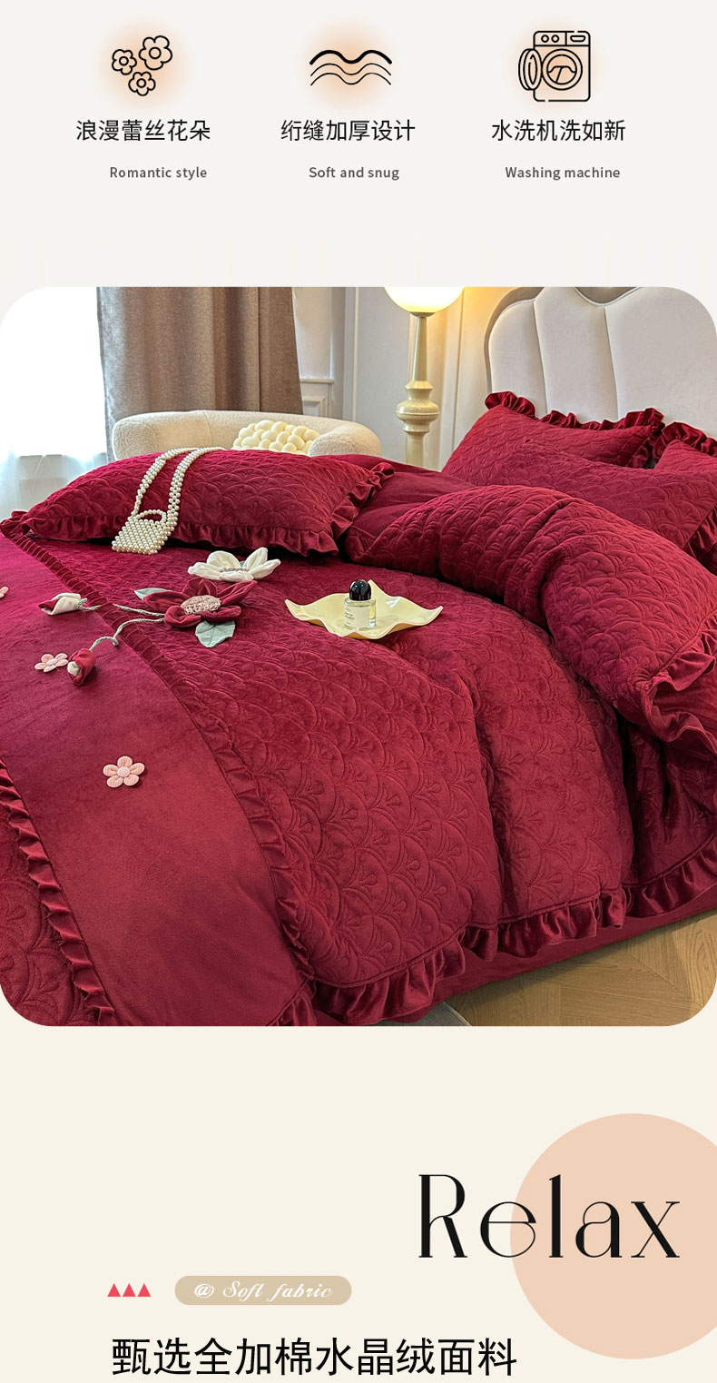 商品名称:兴美佳家纺 2024新款水晶绒全加棉床盖四件套-冬之恋 冬之恋-酒红