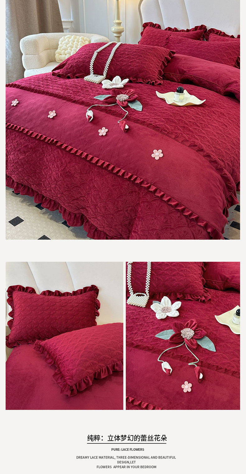 兴美佳家纺 2024新款水晶绒全加棉床盖四件套-冬之恋 冬之恋-酒红