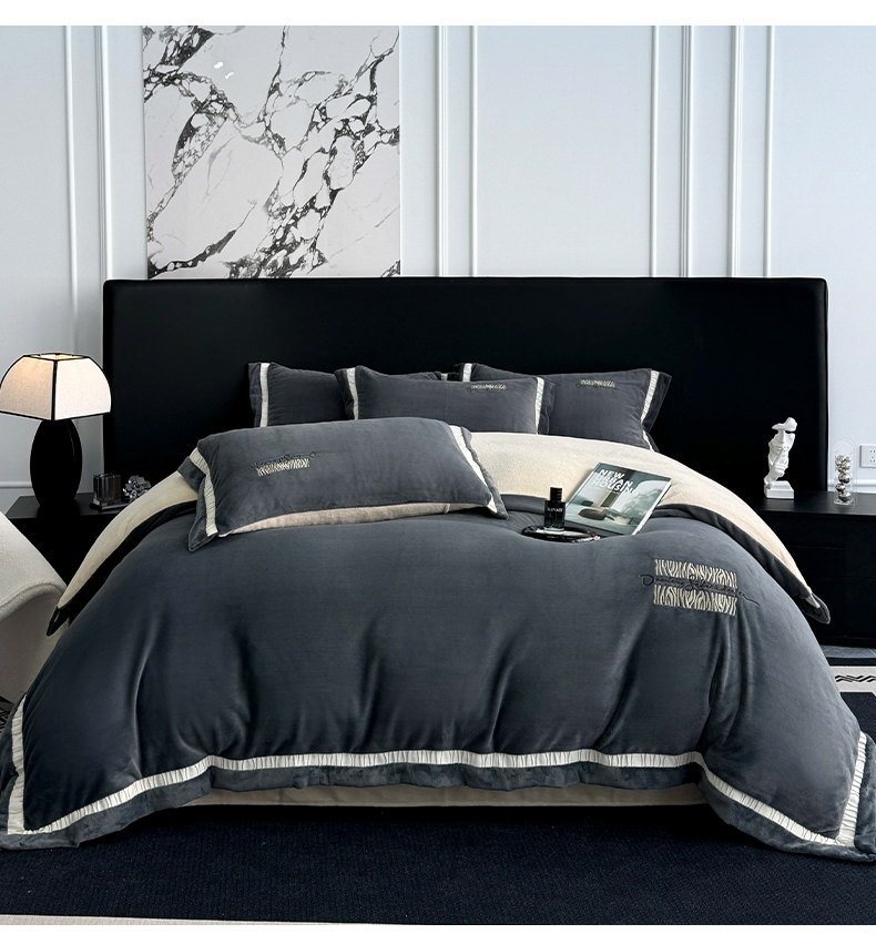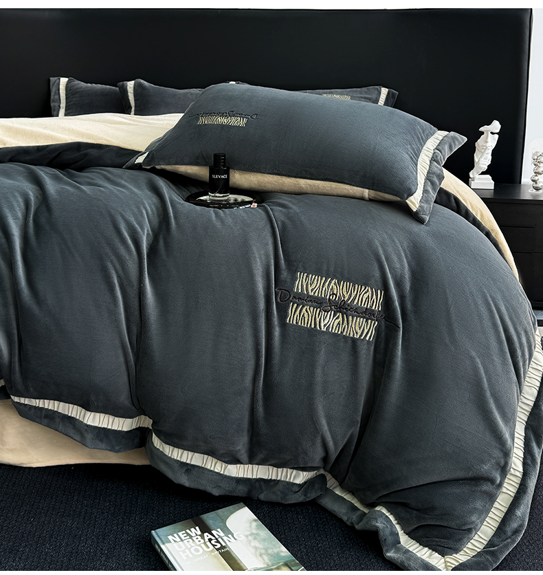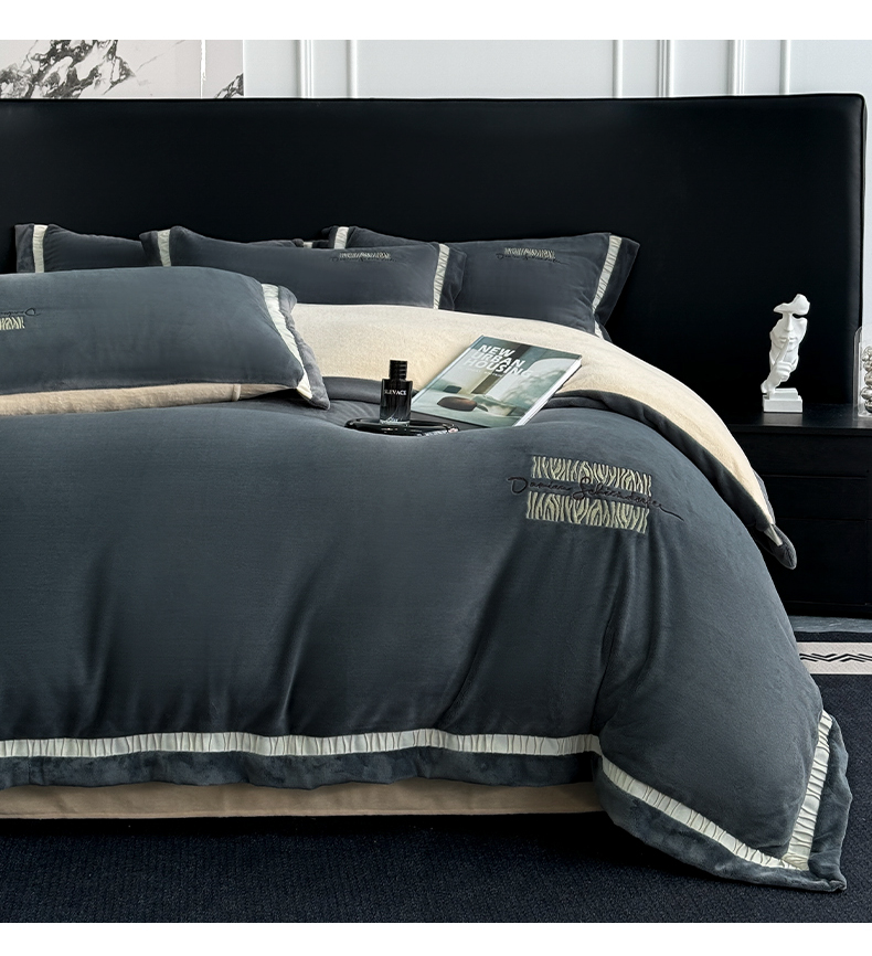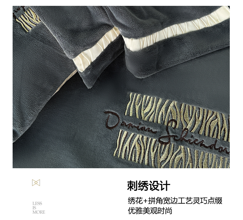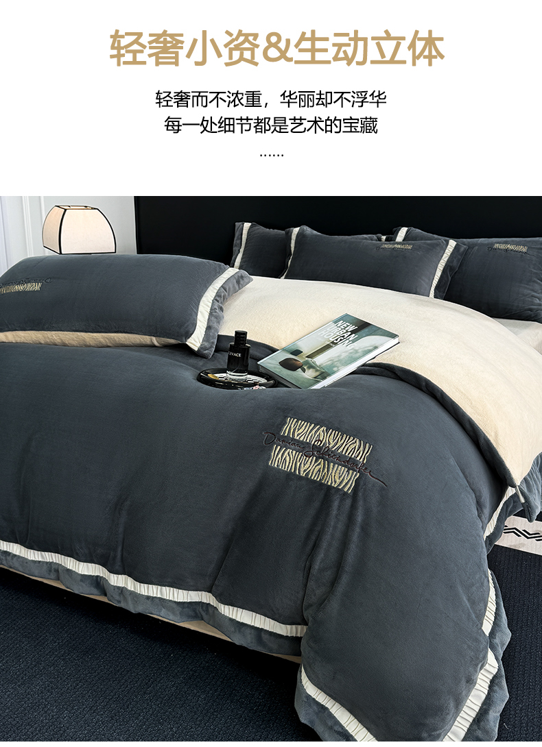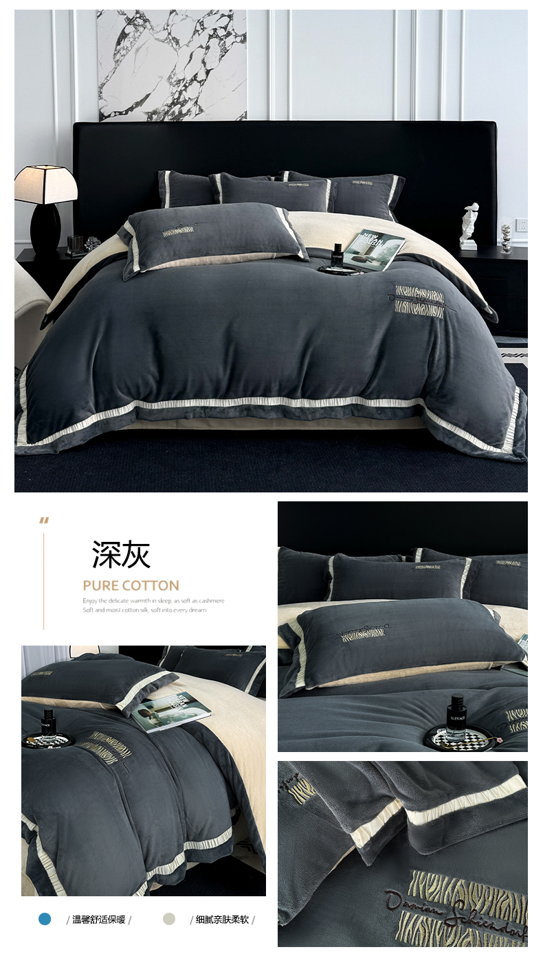 商品名称:子曰 2024新款高克重牛奶绒大拼角刺绣轻奢工艺款四件套-罗马假日 深灰