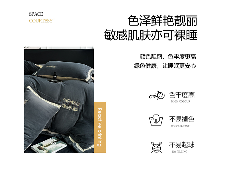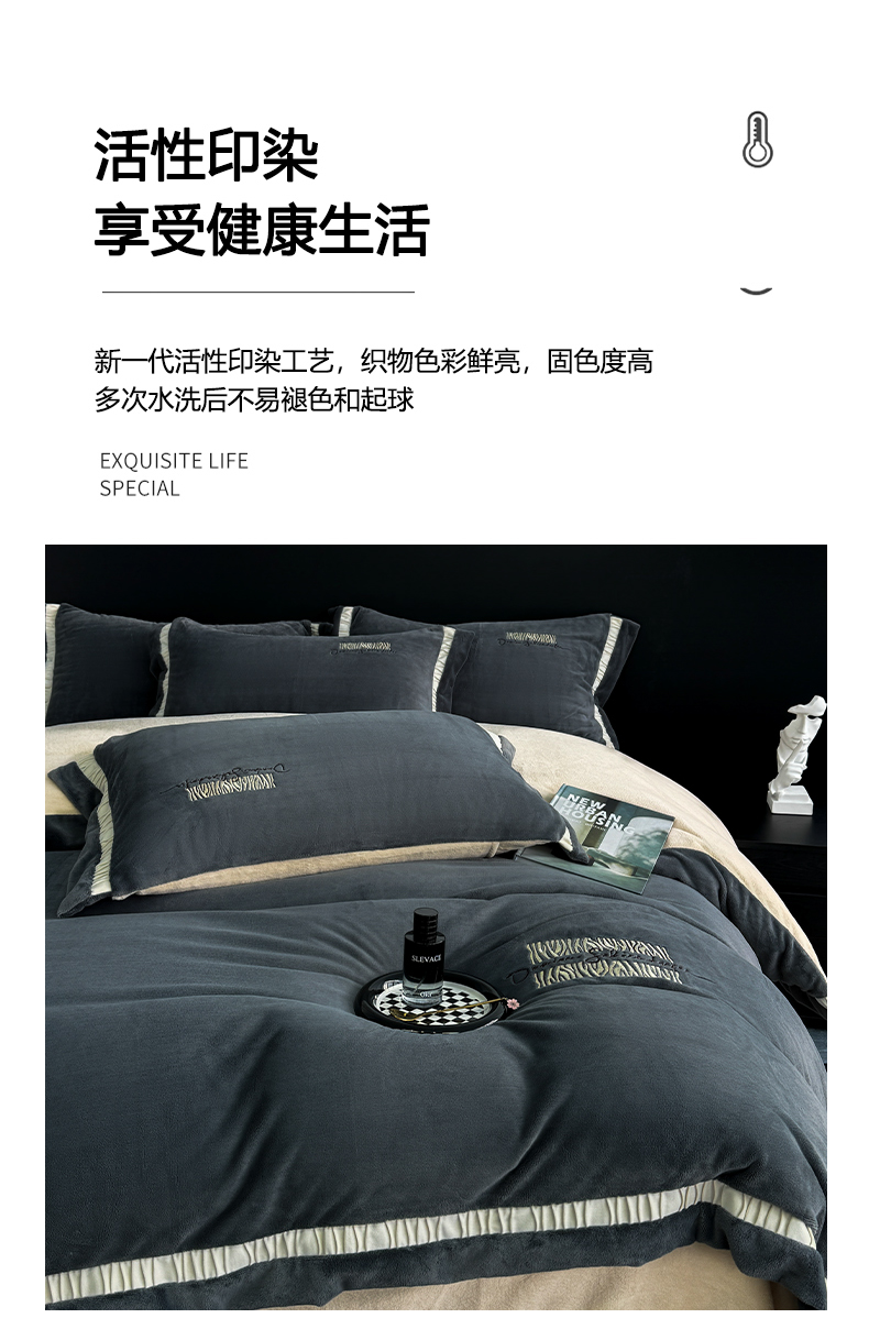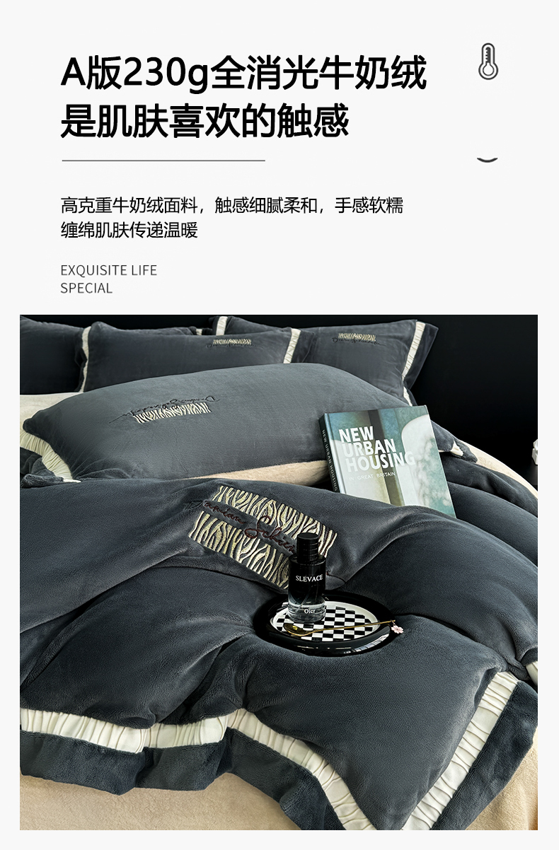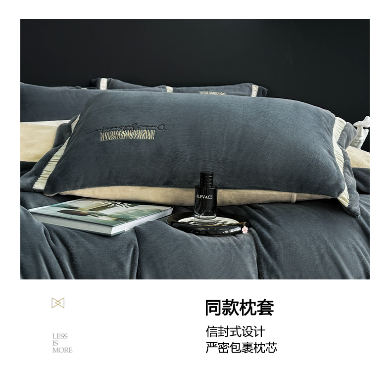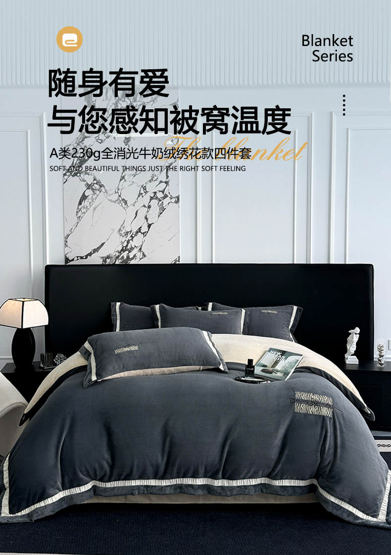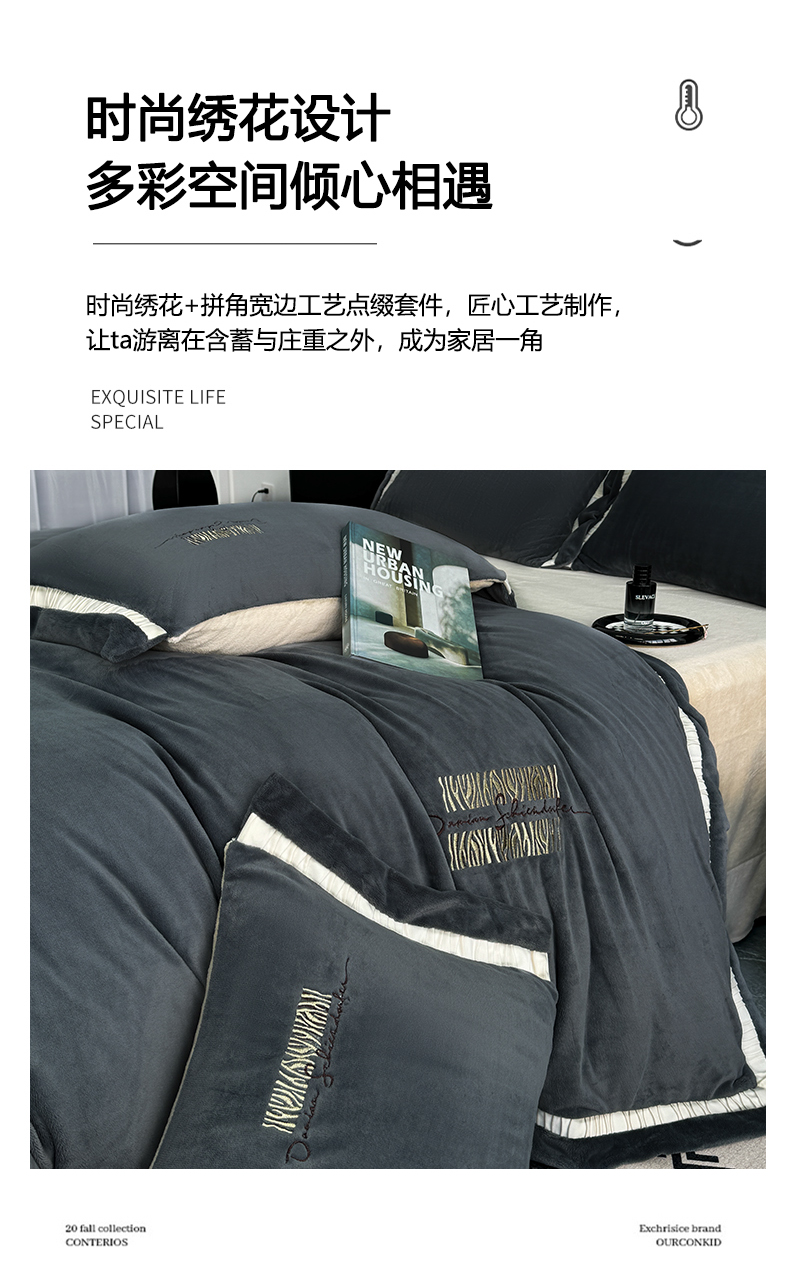 商品名称:子曰 2024新款高克重牛奶绒大拼角刺绣轻奢工艺款四件套-罗马假日 深灰