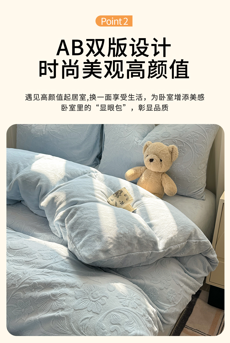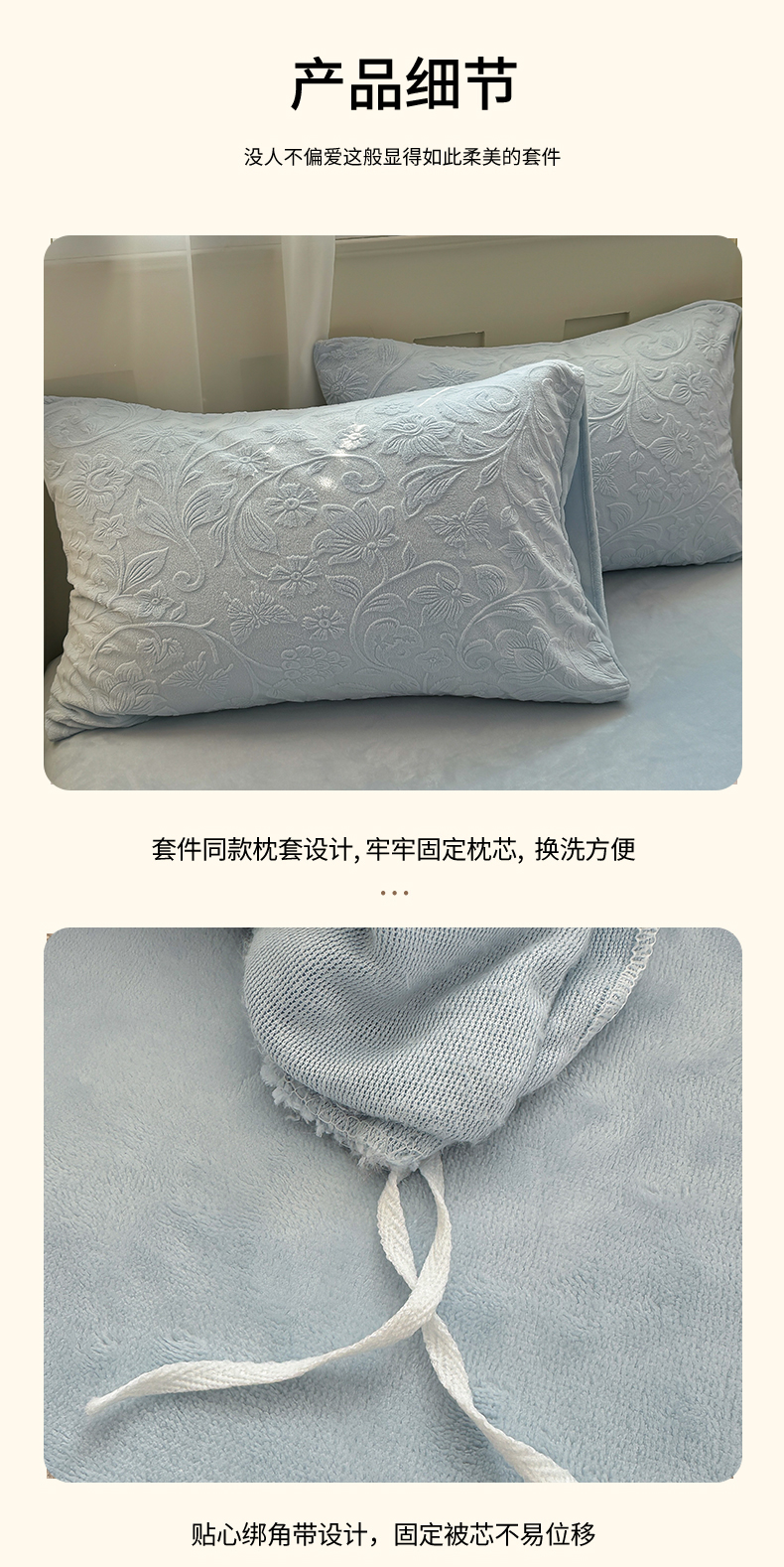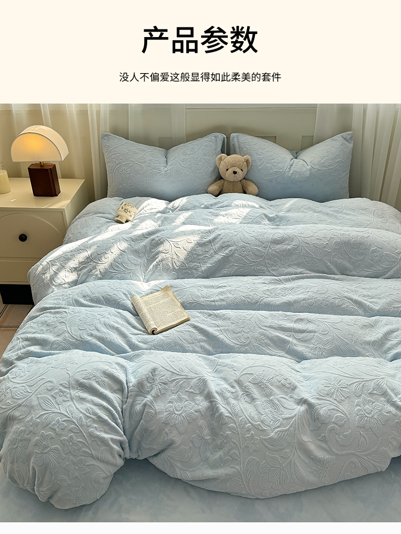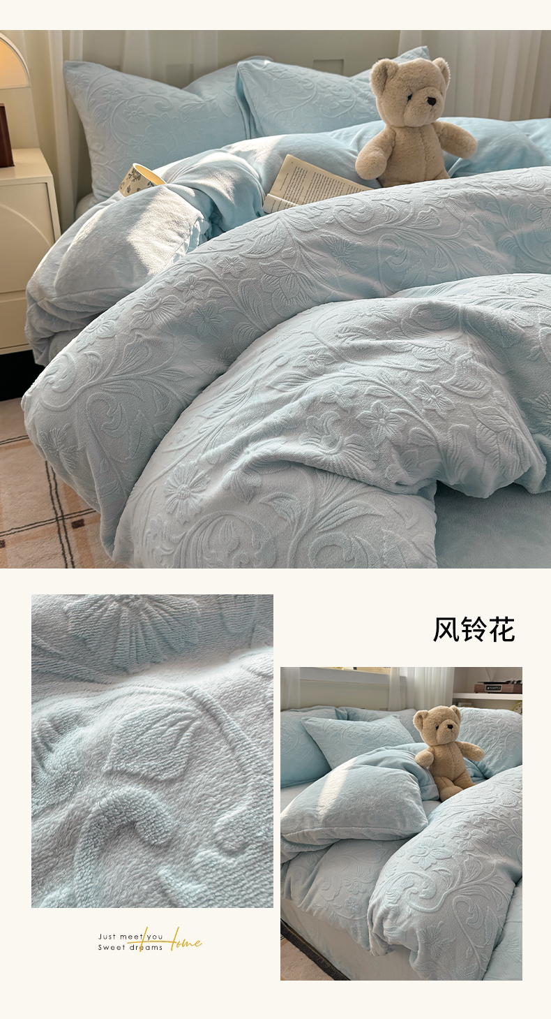 当前位置: 91家纺网 > 商品网购 > 床品套件 > 四件套 > 牛奶绒四件套 > 繁花家居 2024新款雕花绒牛奶绒静谧烂花系列四件套 风铃花
