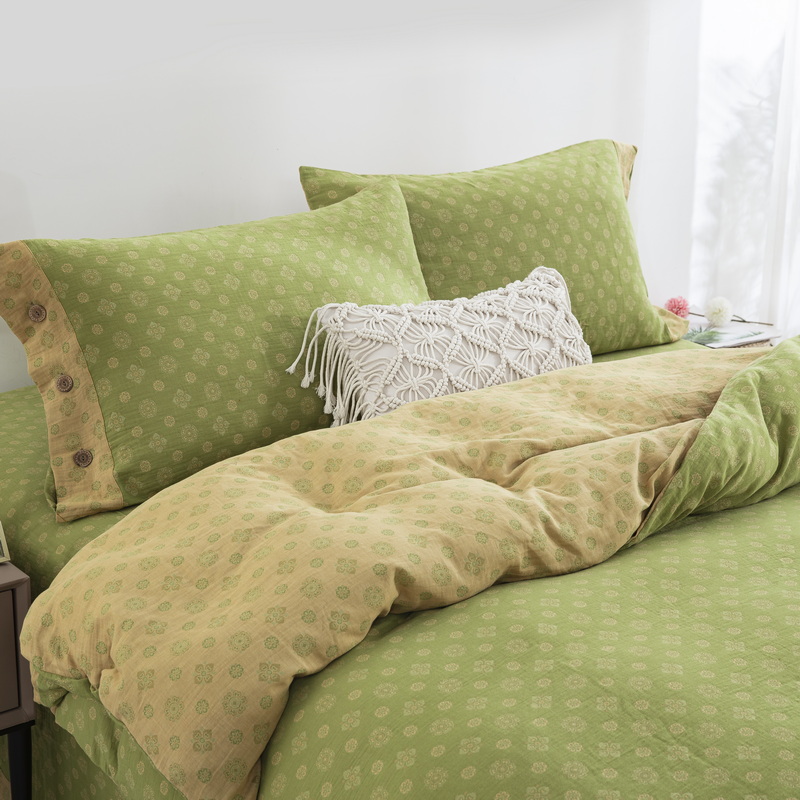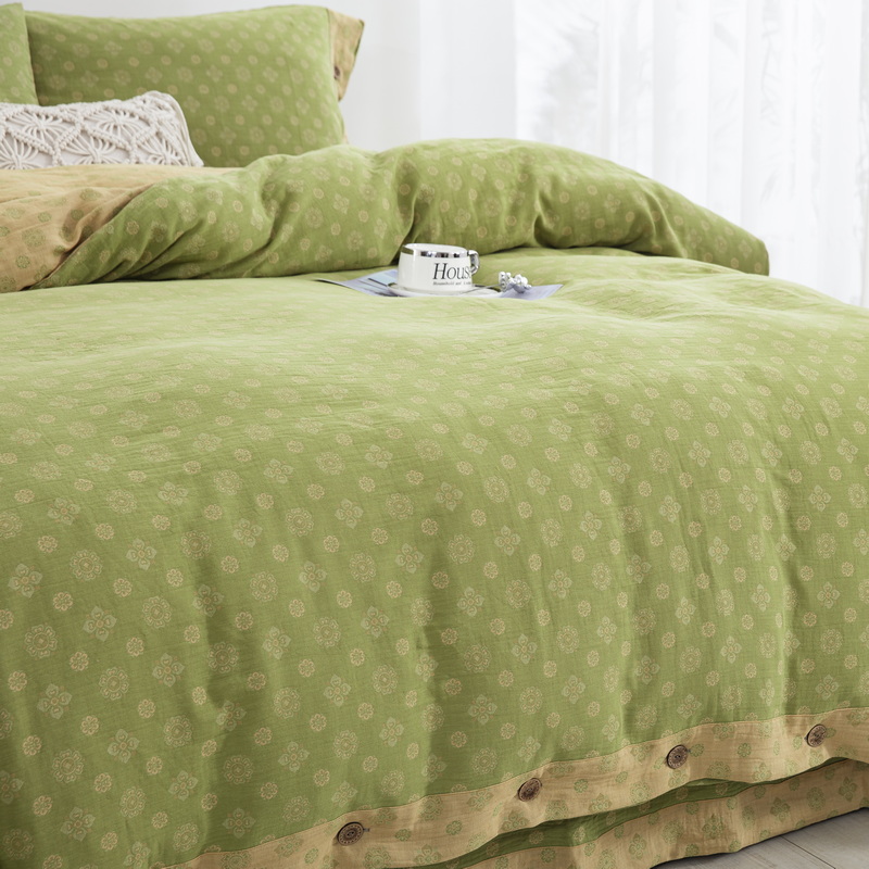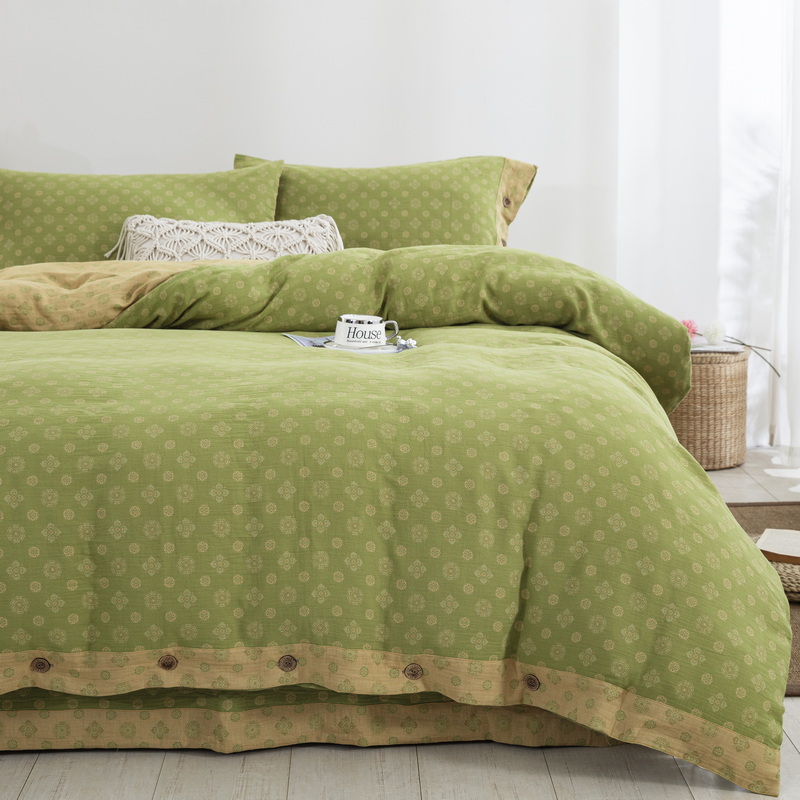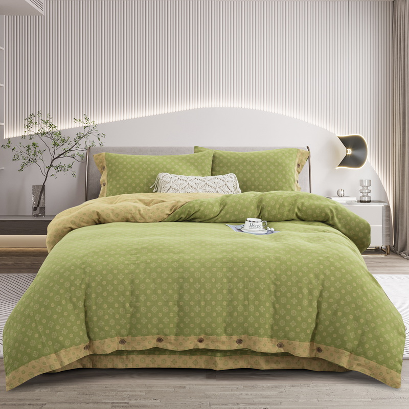 鲁爱 2025新款全棉色织双层纱纽扣款四件套 幸福星-绿
