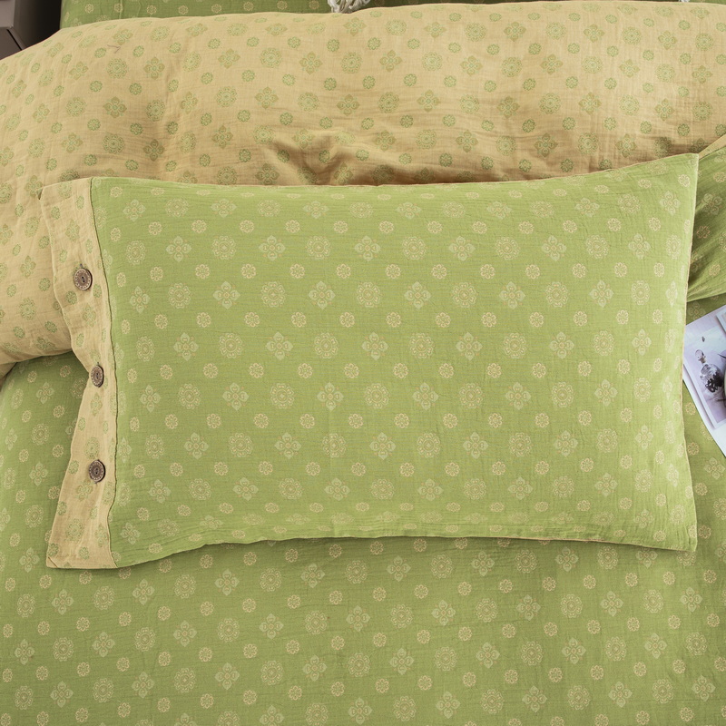 商品名称:鲁爱 2025新款全棉色织双层纱纽扣款四件套 幸福星-绿