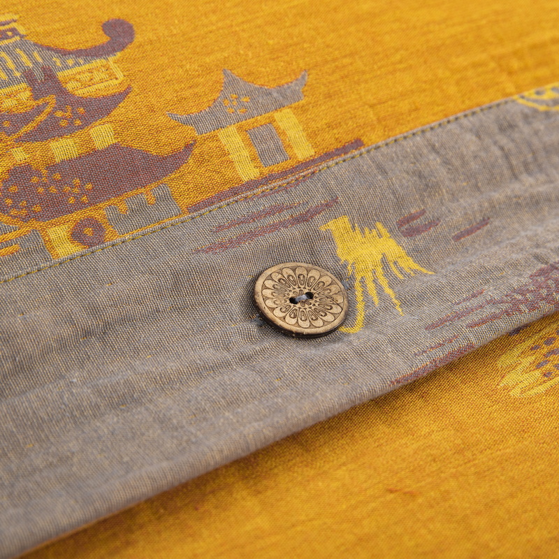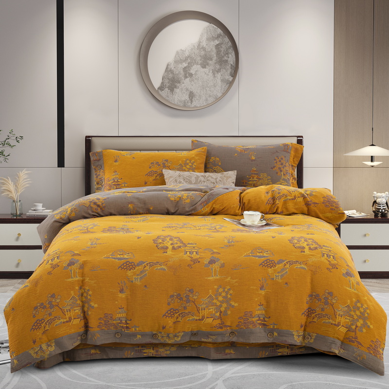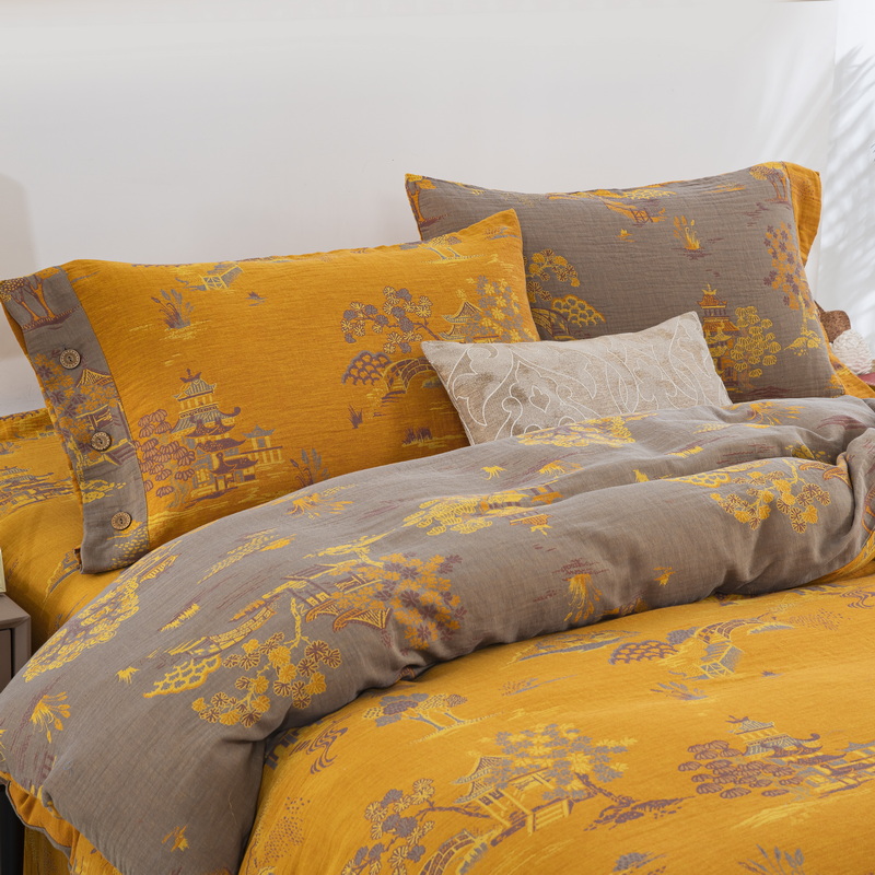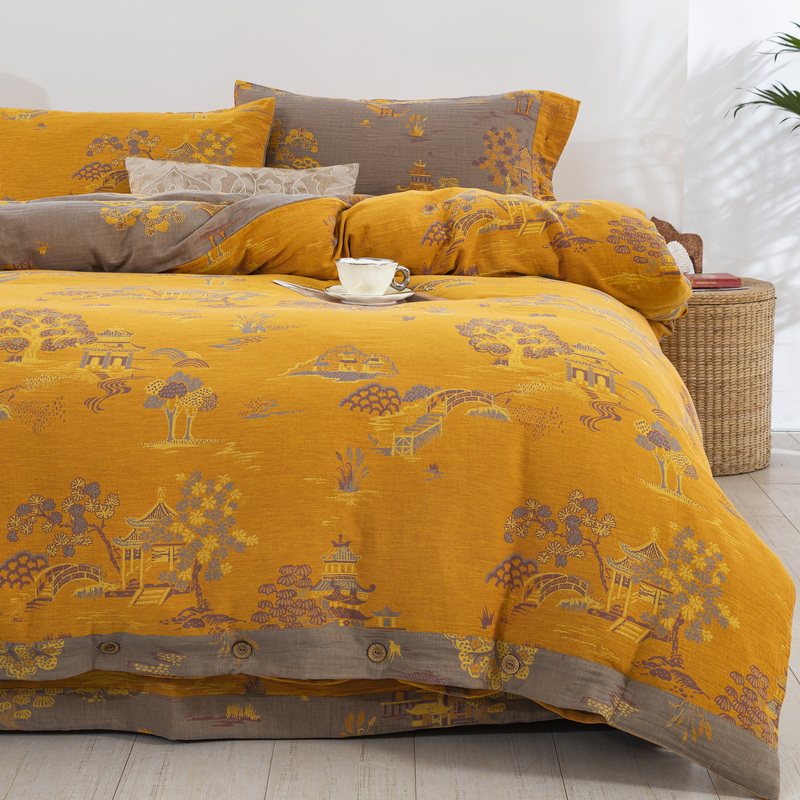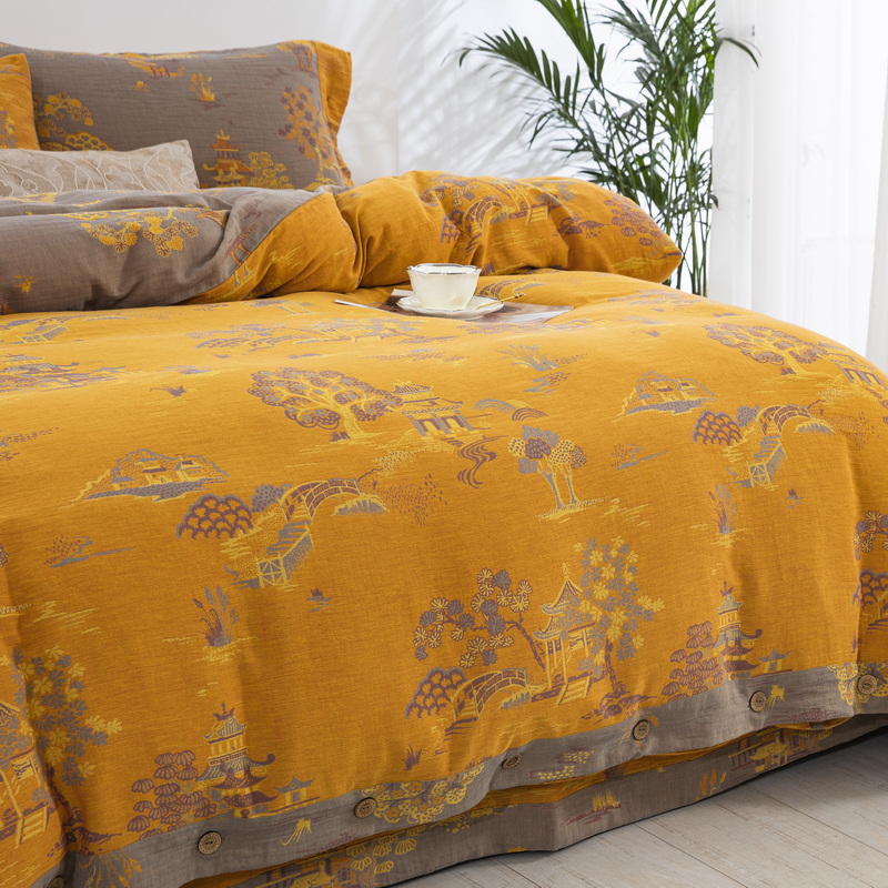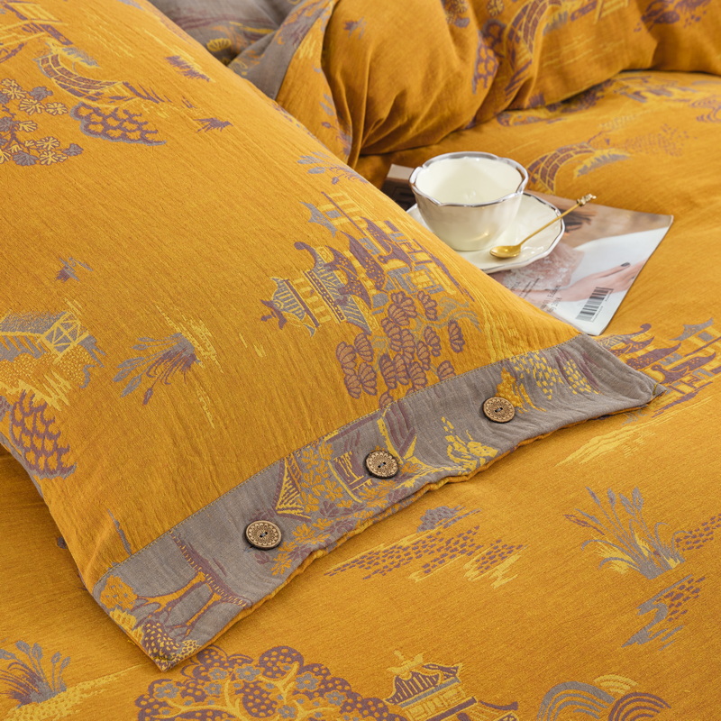 鲁爱 2025新款全棉色织双层纱纽扣款四件套 逸彩之林-黄