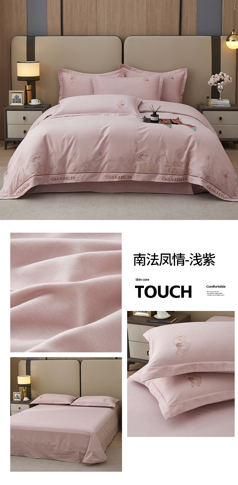 商品名称:金纱玉纺家纺 2024新款纯色加厚绣花工艺四件套 南法凤情-浅紫