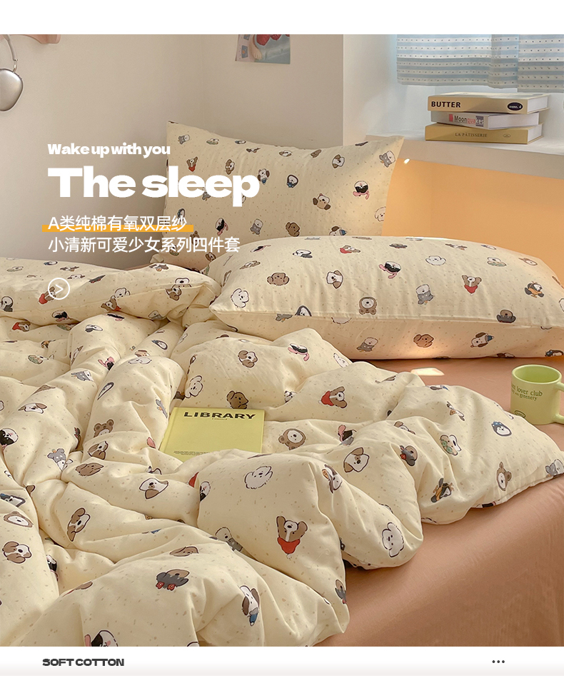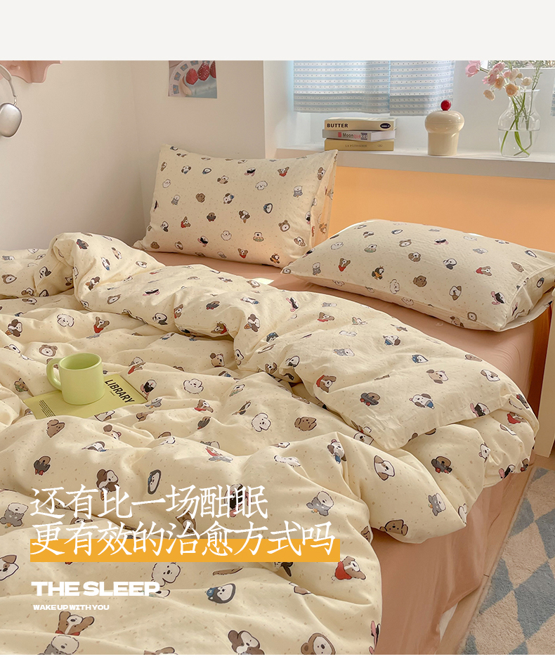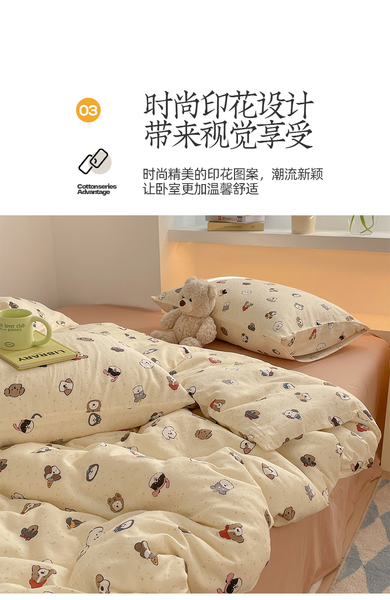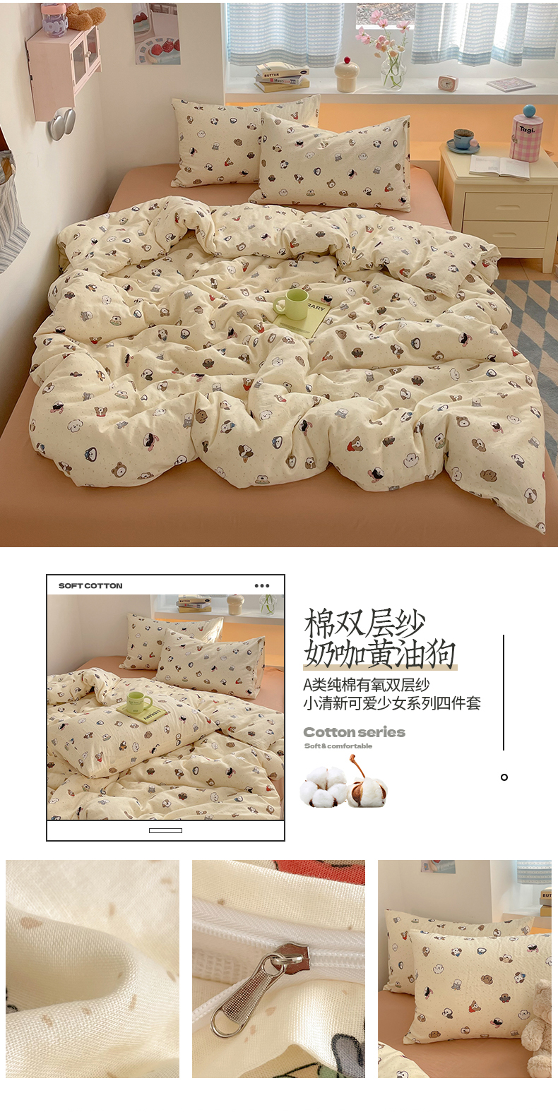 当前位置: 91家纺网 > 商品网购 > 床品套件 > 四件套 > 全棉普通四件套 > 桃子家居2025新款A类纯棉有氧双层纱小清新可爱少女系列四件套 棉双层纱-奶咖黄油狗