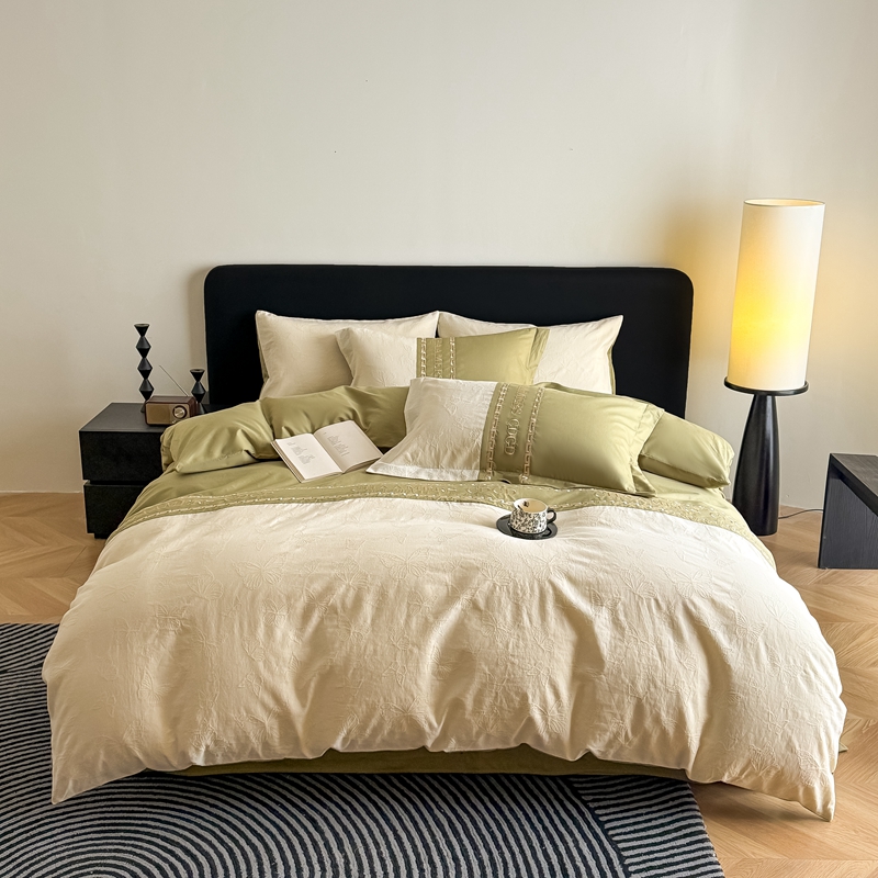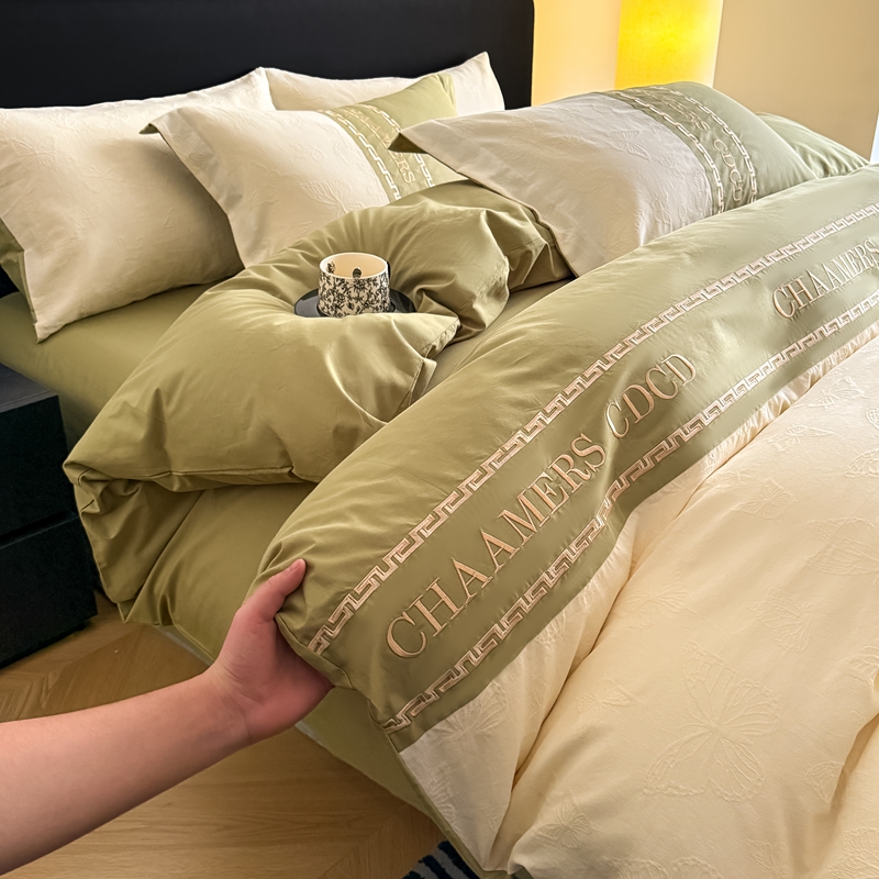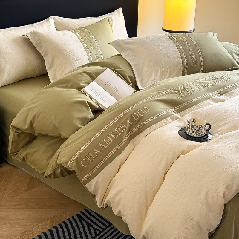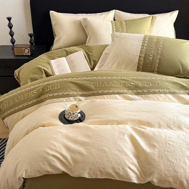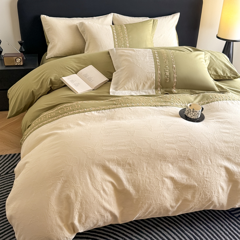 当前位置: 91家纺网 > 商品网购 > 床品套件 > 四件套 > 提花四件套 > 水云缦 2025新款全棉三层纱色织大提花四件套绣花拼接款 拼接绣花款-蝶舞-米白
