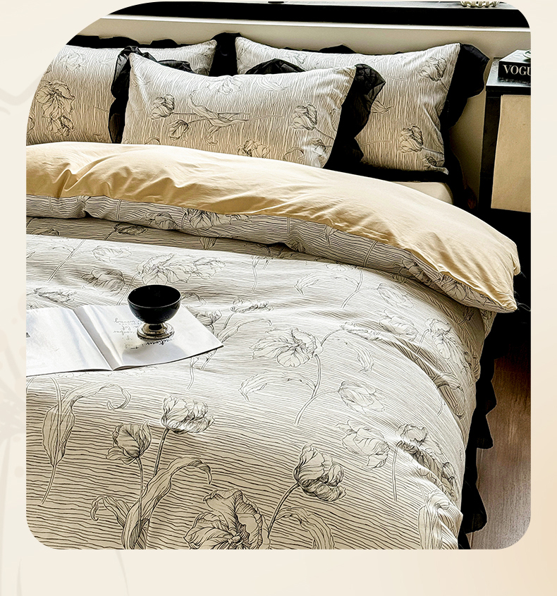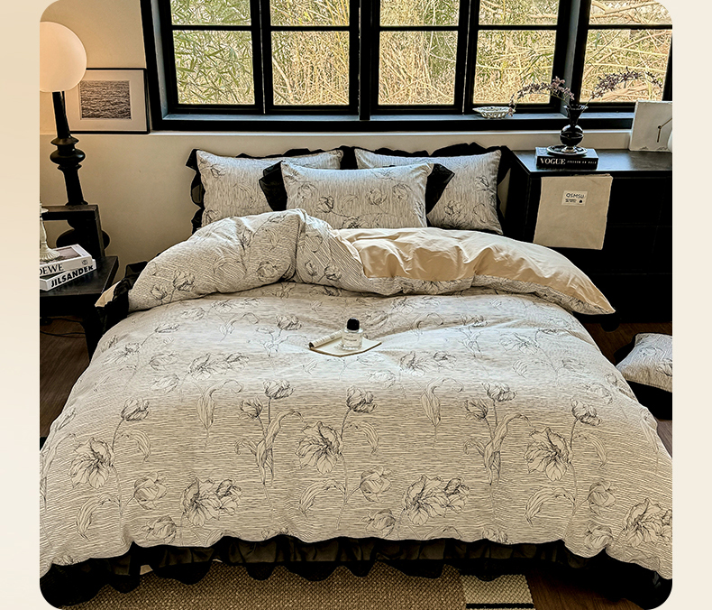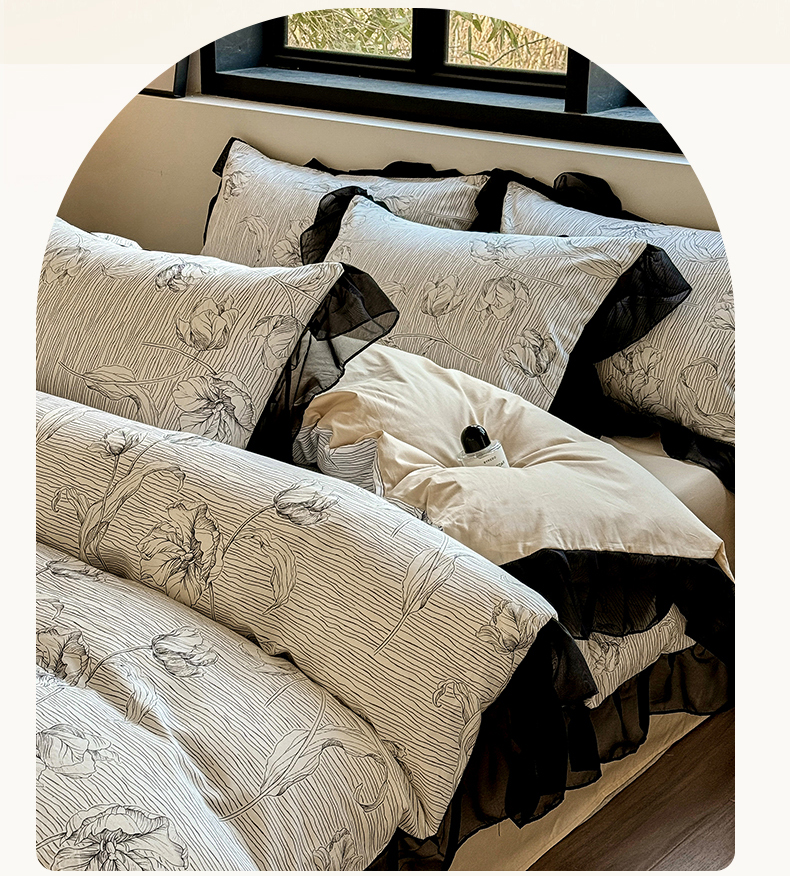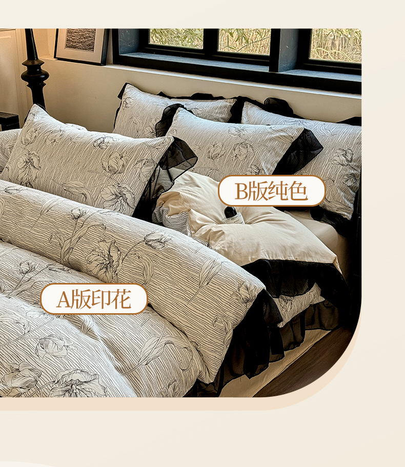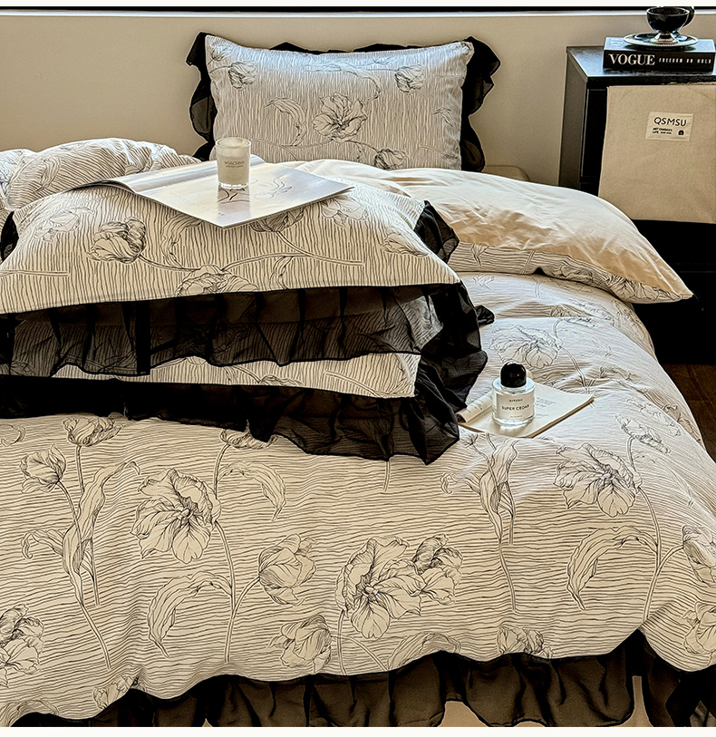 床品套件 > 宅家居 2025新款爆款轻法式赫本风复古印花13372纯棉四件套韩式黑色花边40支全棉三件套 夏荷