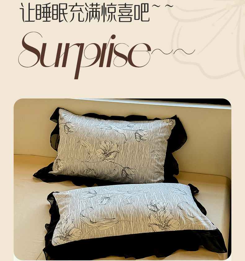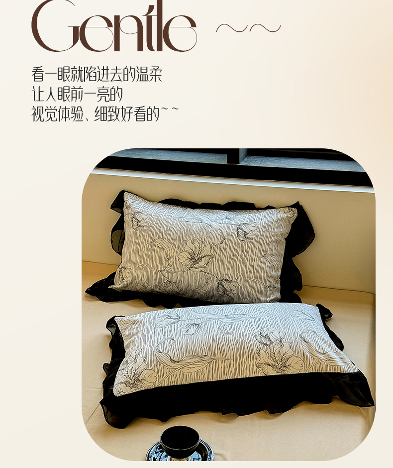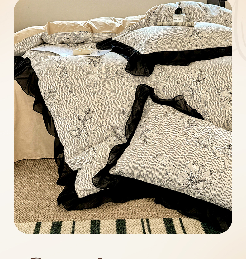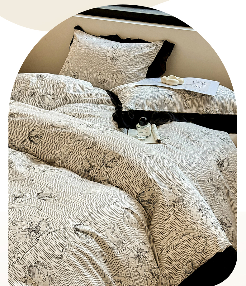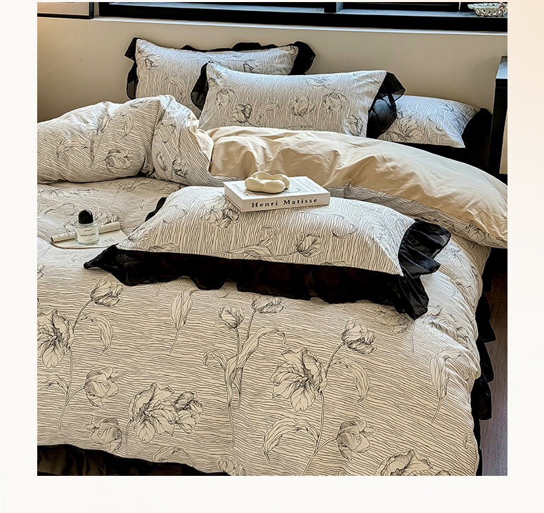 床品套件 > 宅家居 2025新款爆款轻法式赫本风复古印花13372纯棉四件套韩式黑色花边40支全棉三件套 夏荷