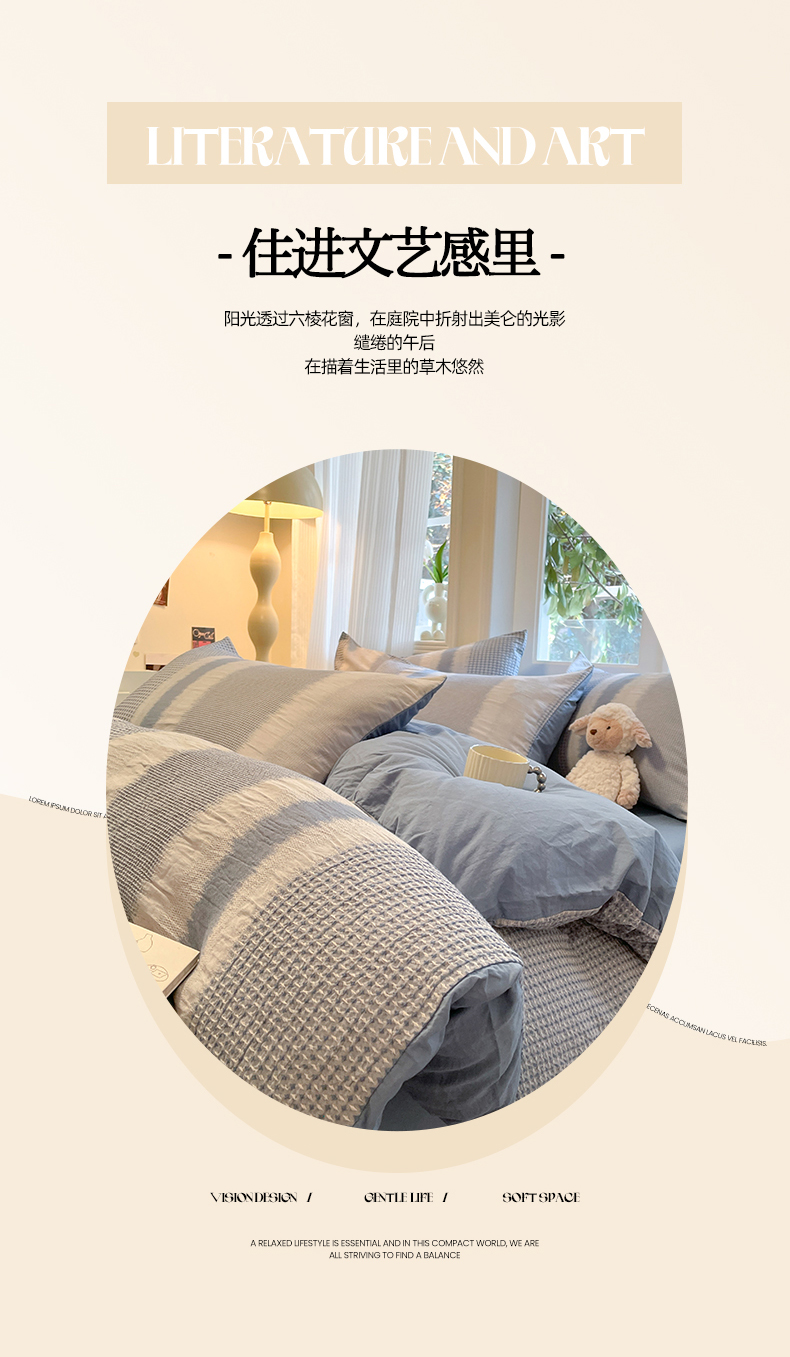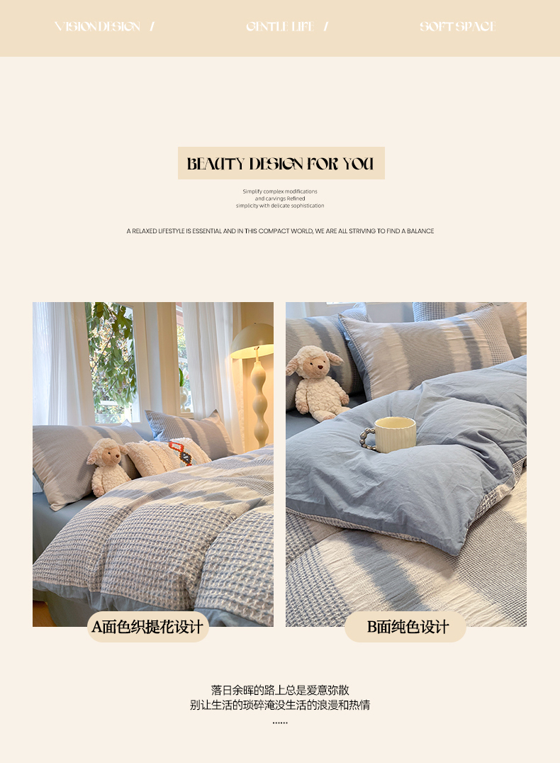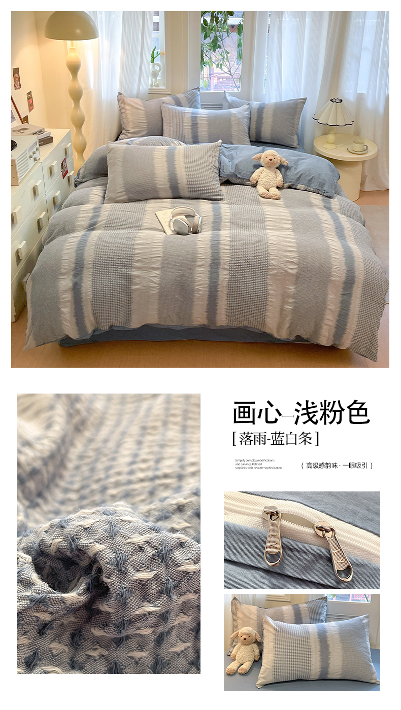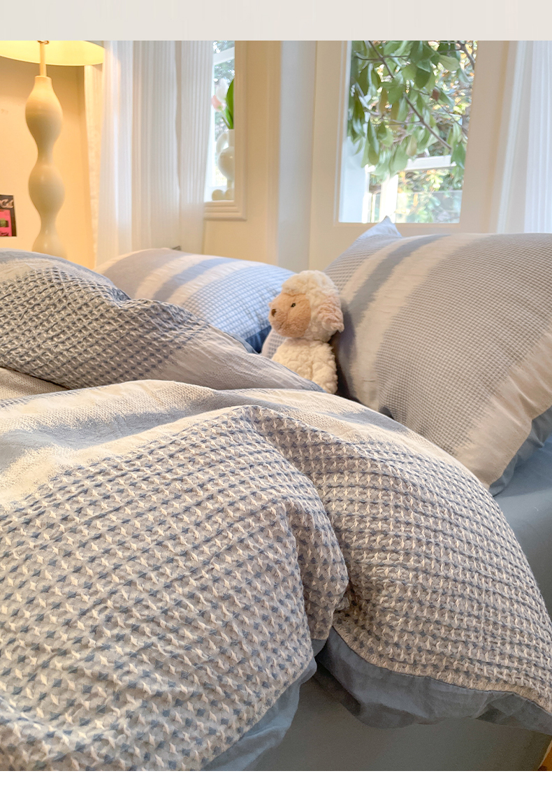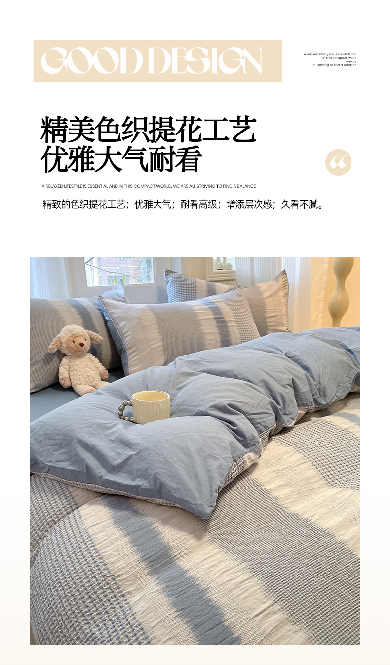 莱茵家居 2025春夏新款A类色织华夫格提花全棉四件套 落雨-蓝白条