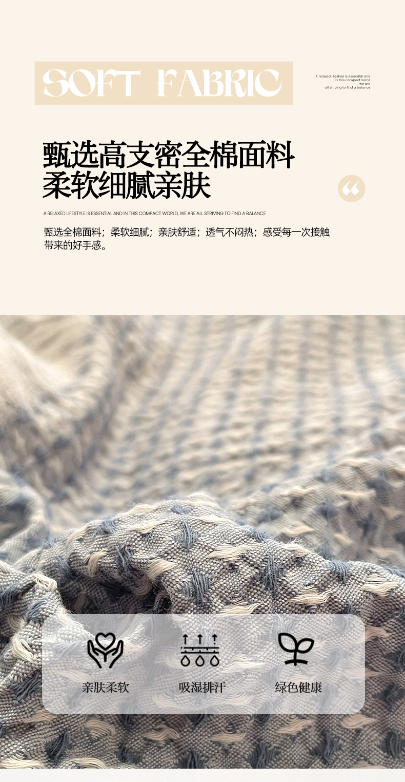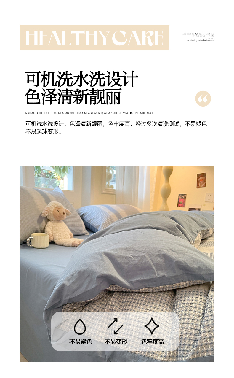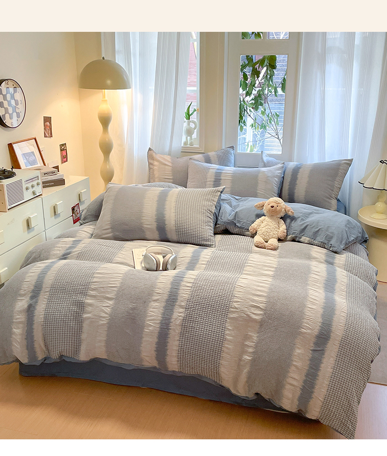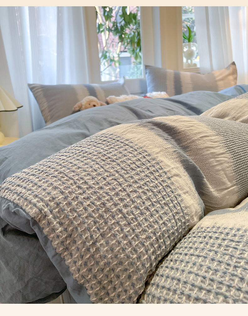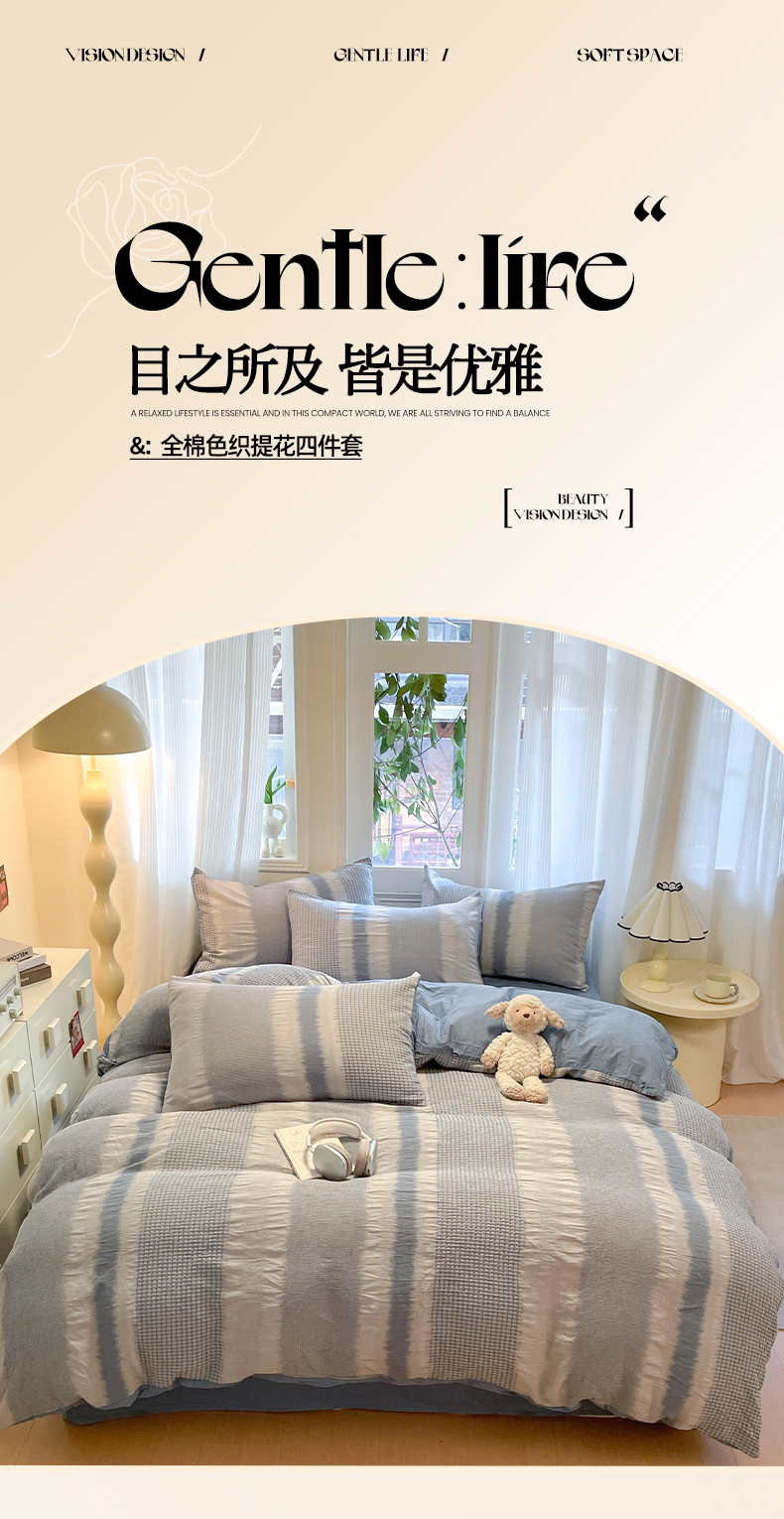 莱茵家居 2025春夏新款A类色织华夫格提花全棉四件套 落雨-蓝白条