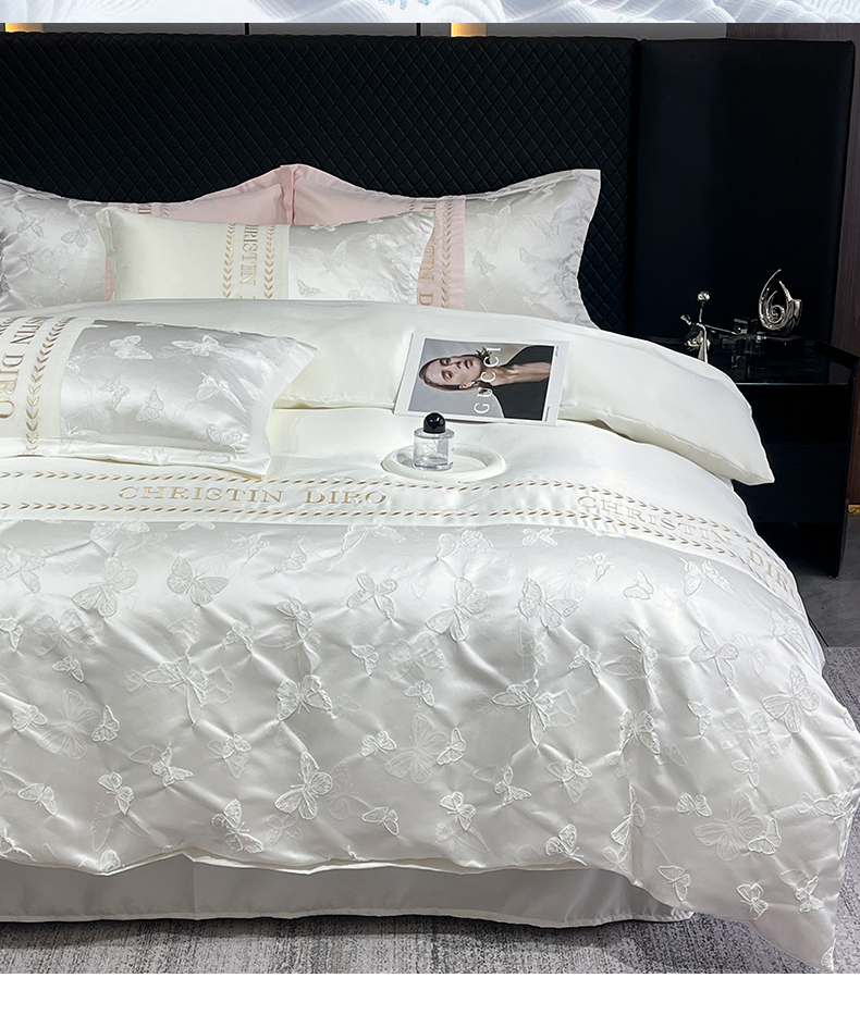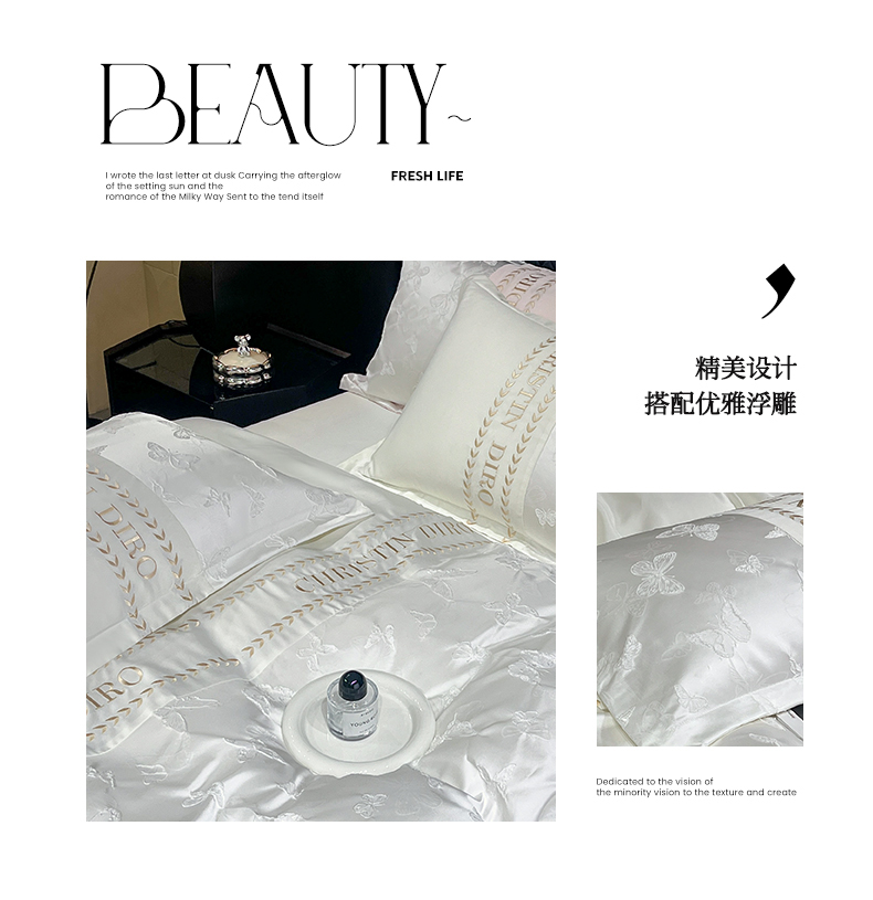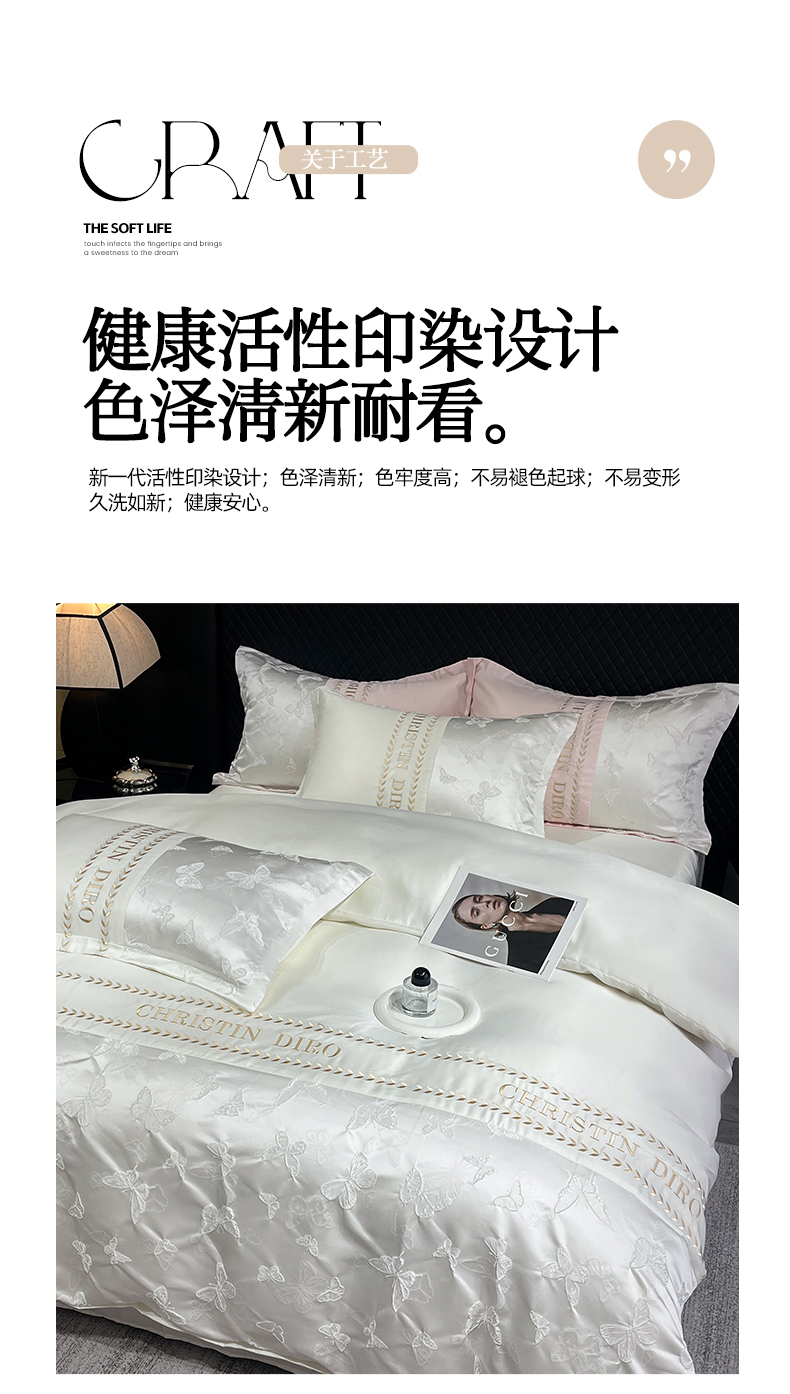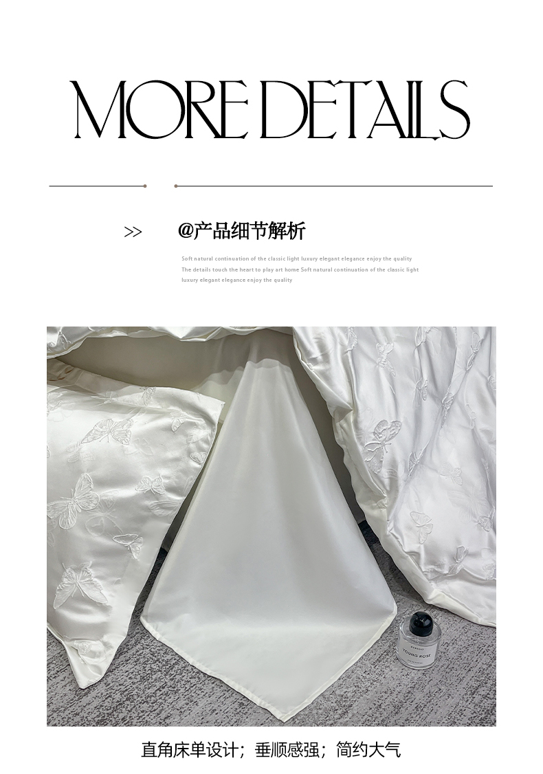商品名称:艾米家居 2025新款轻奢浮雕系列水洗真丝凉感丝四件套 珍珠白蝴蝶花