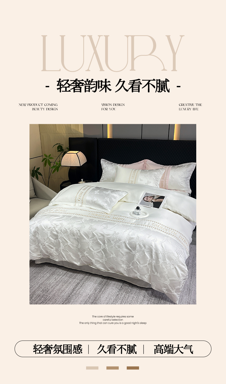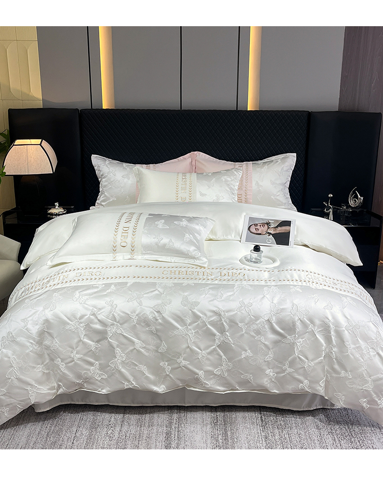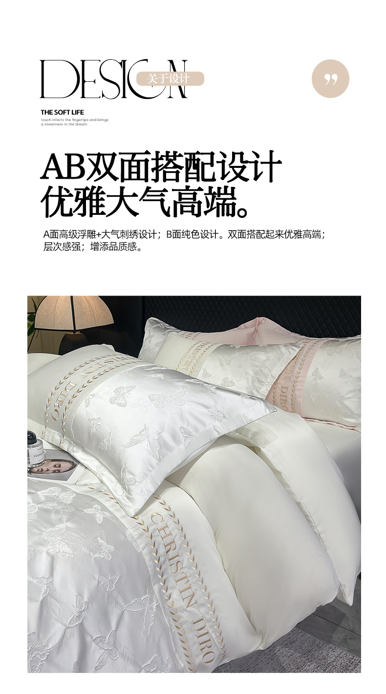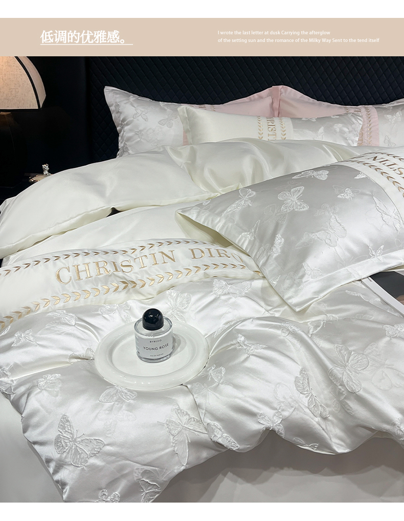 商品名称:艾米家居 2025新款轻奢浮雕系列水洗真丝凉感丝四件套 珍珠白蝴蝶花