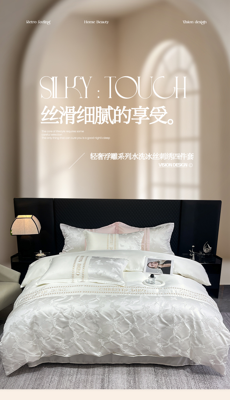 艾米家居 2025新款轻奢浮雕系列水洗真丝凉感丝四件套 珍珠白蝴蝶花