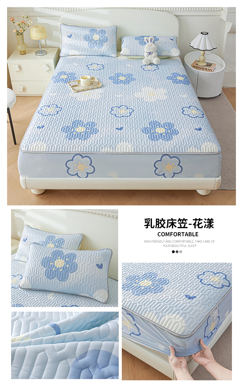 商品名称:雯豆2025夏季新品0.4乳胶凉席床笠款三件套凉感丝印花纯色床罩 乳胶床笠-花漾
