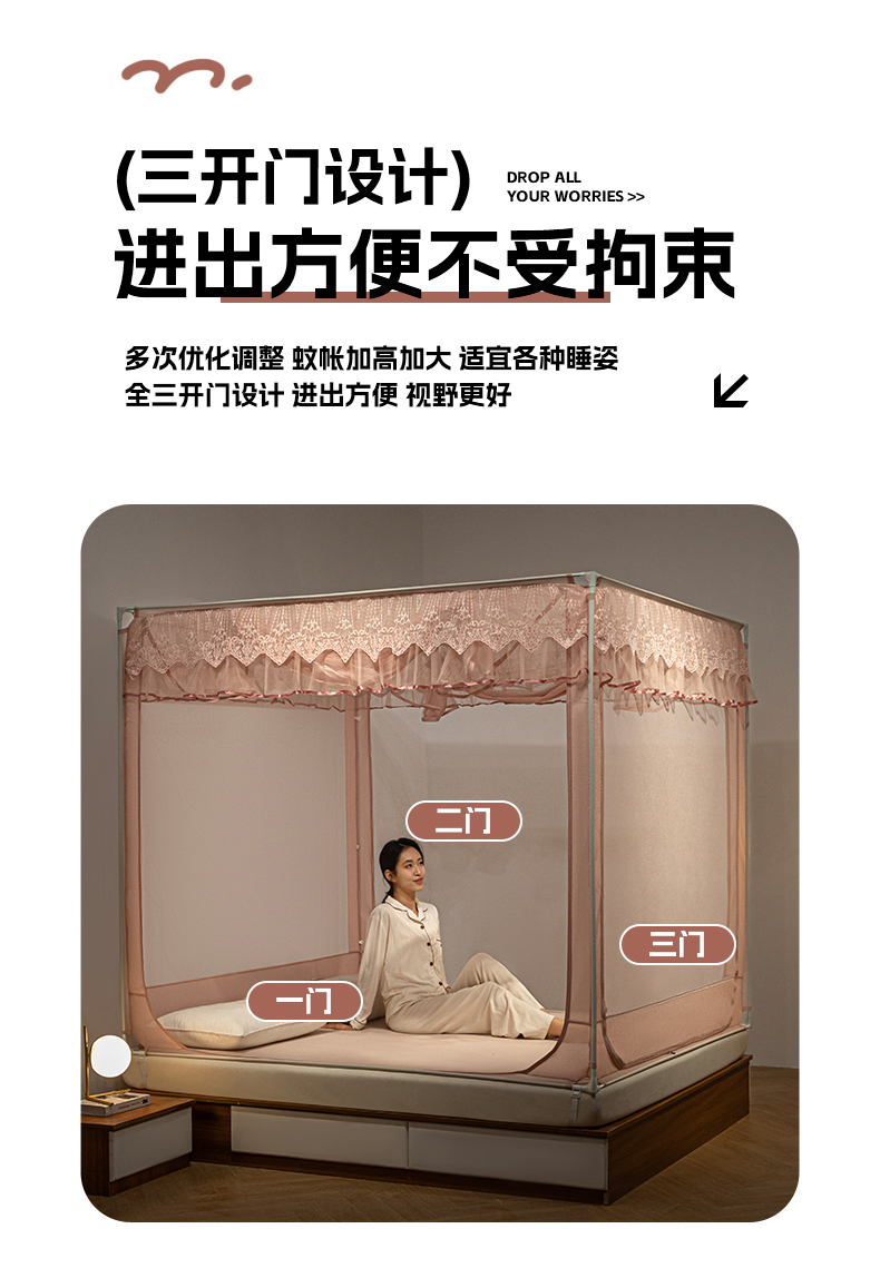(总)飞轮海蚊帐 2023新款三开门落地遮光蚊帐-L-93,高级灰,芥末绿,奶油黄,香槟