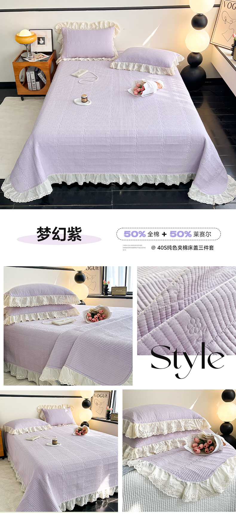 沐纯家居 2025新款棉小乐花边床盖三件套 淡雅灰