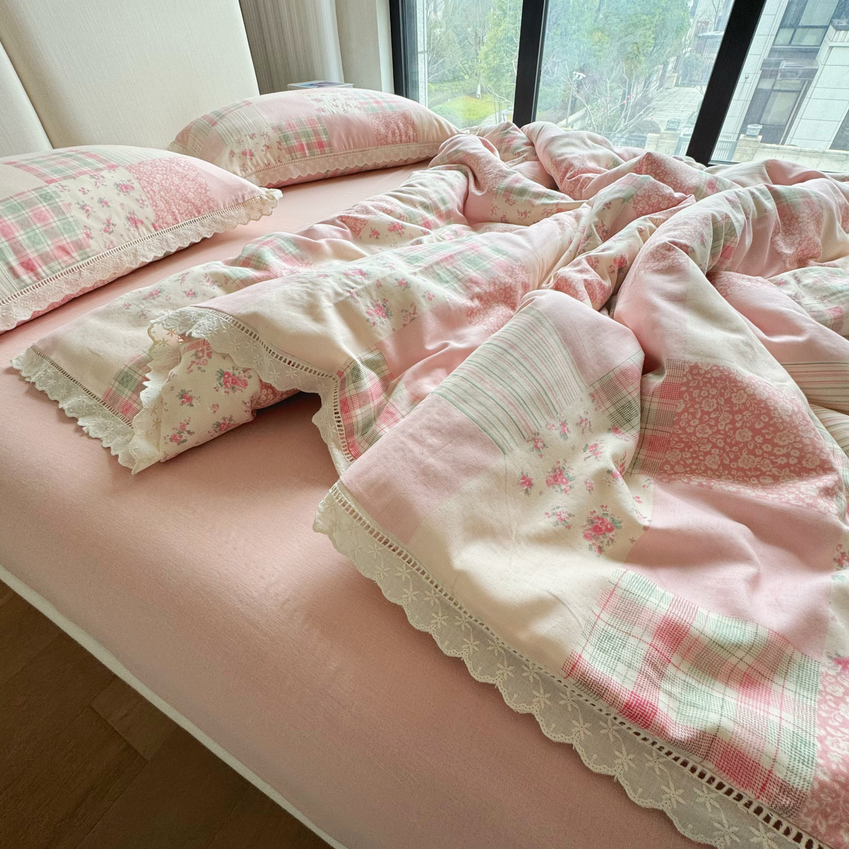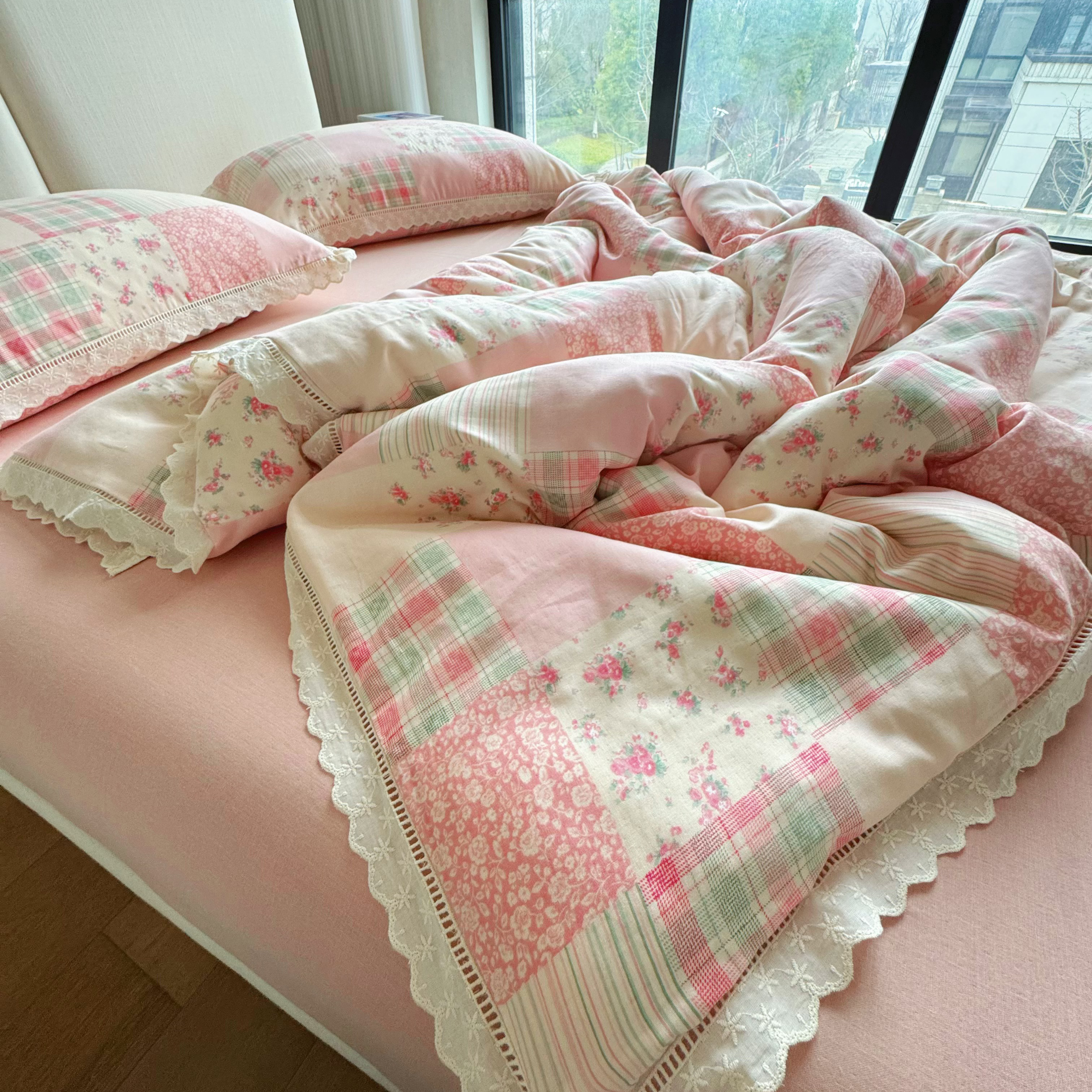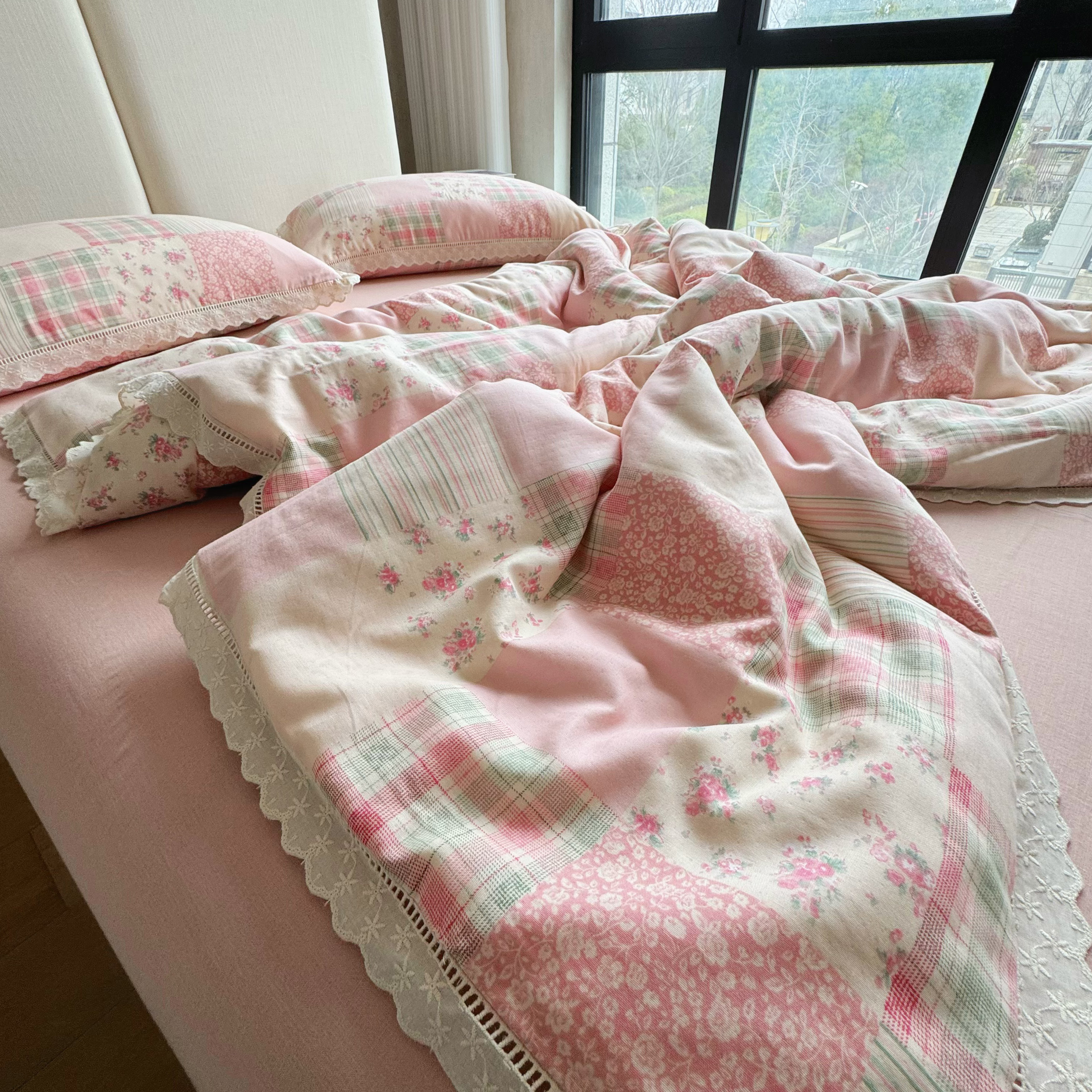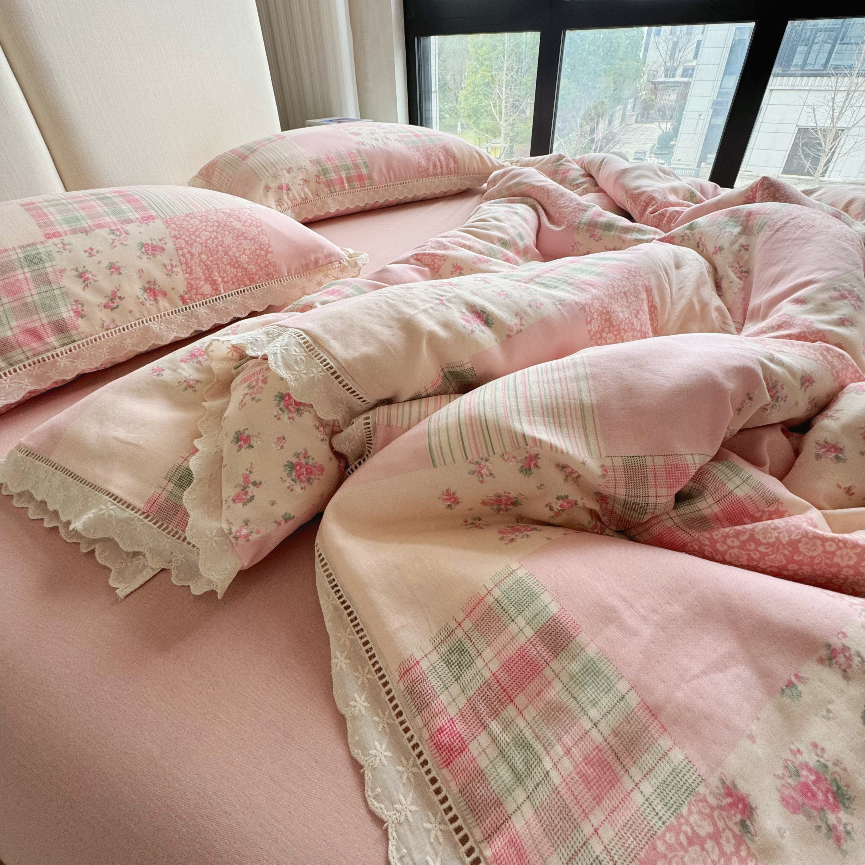 8+8 2025新款全棉A类母婴级抗菌有氧全棉双层纱亲肤全棉小清新印花三件套四件套 简约款-极简主义粉,简约款-极简主义粉