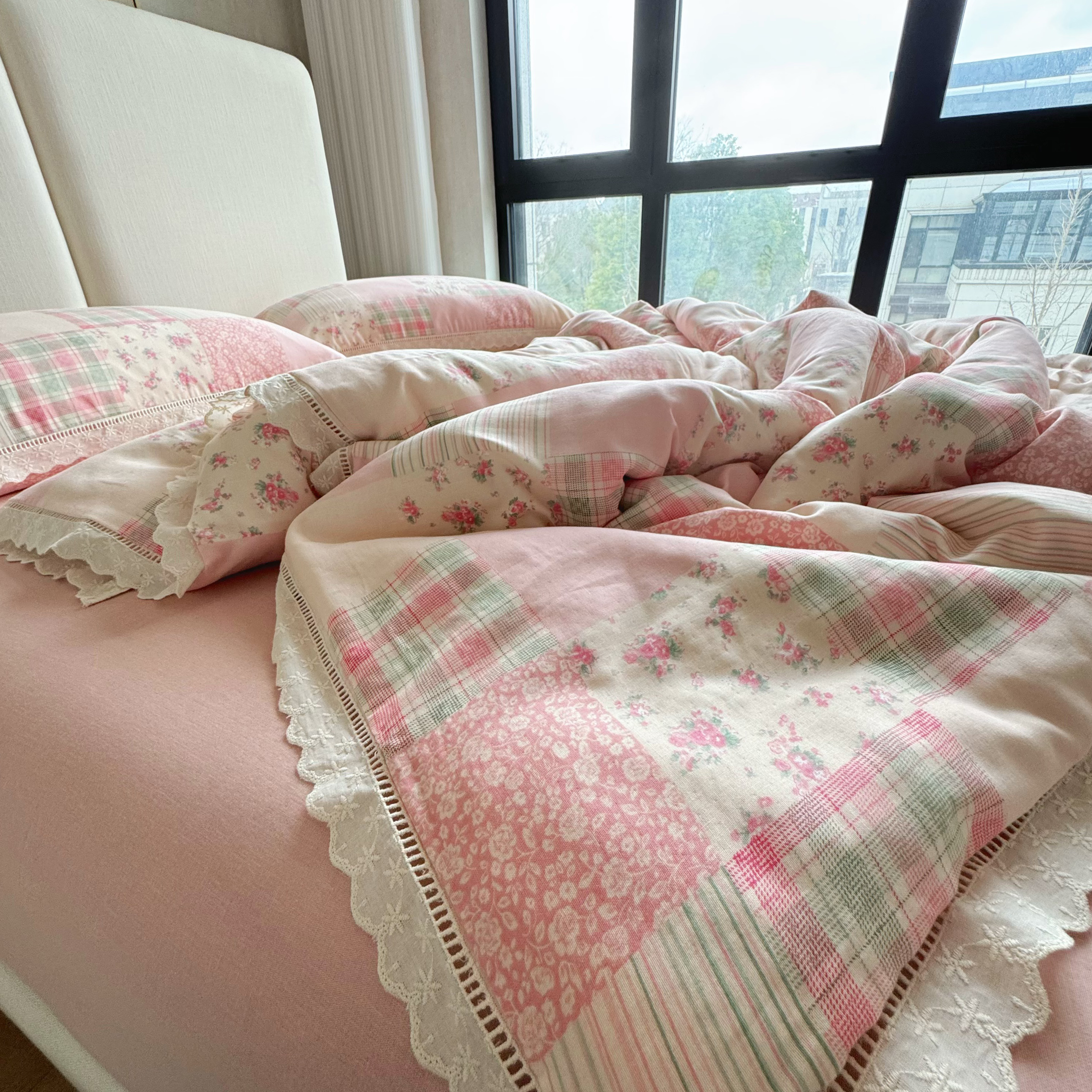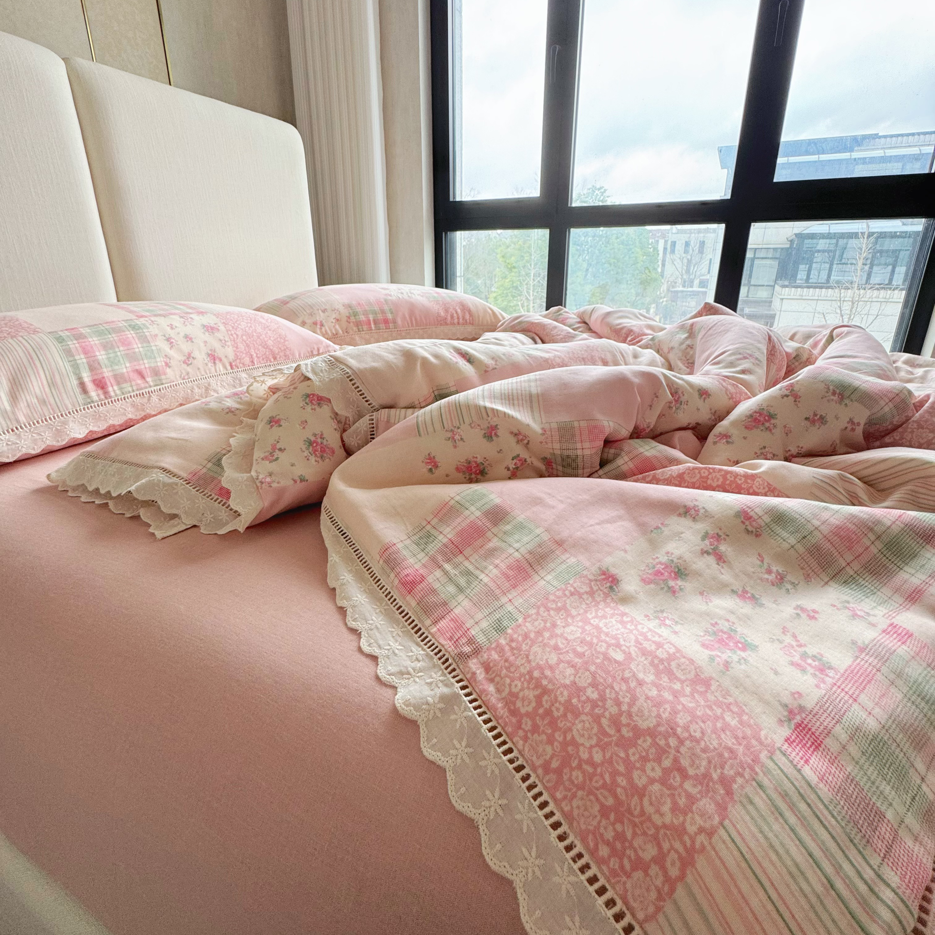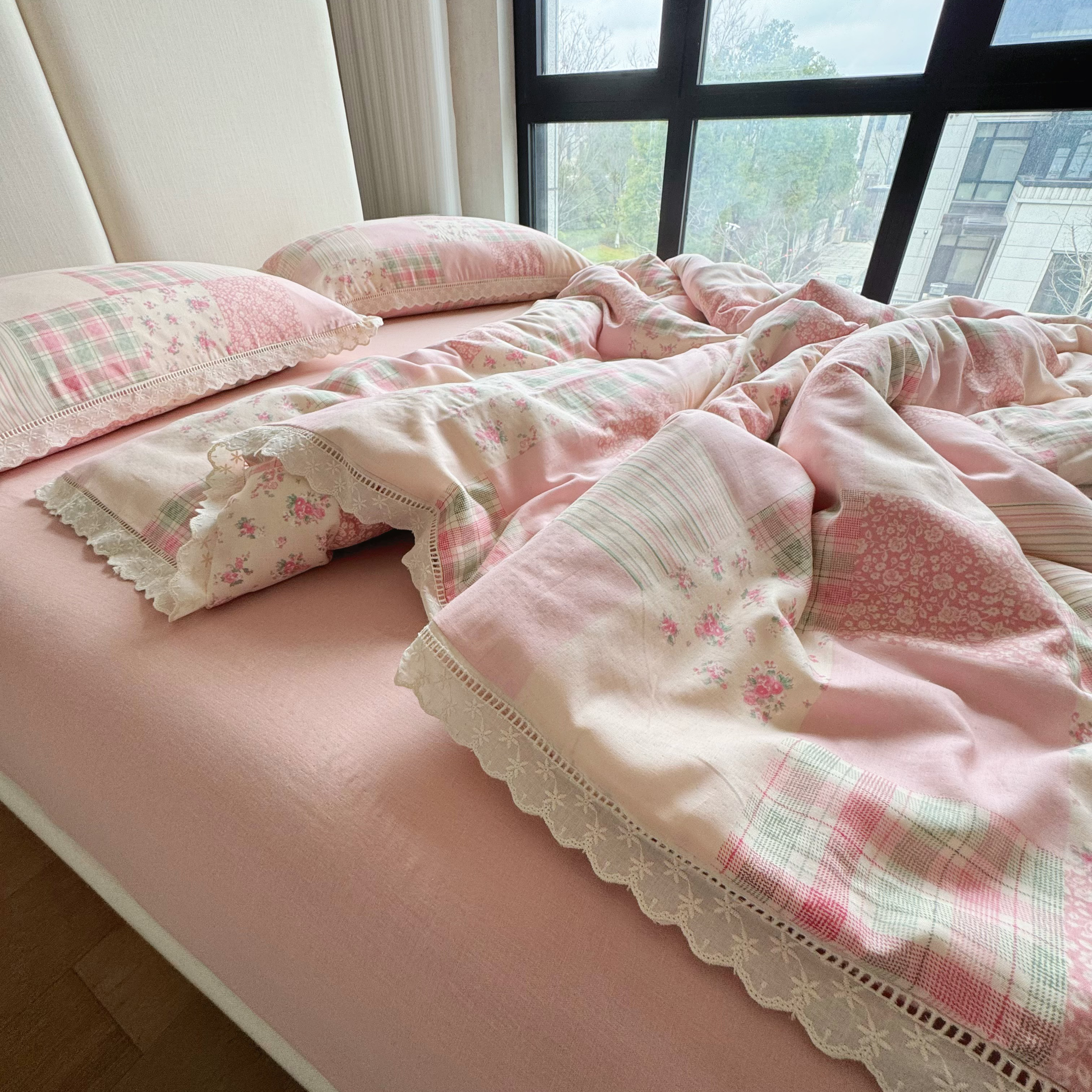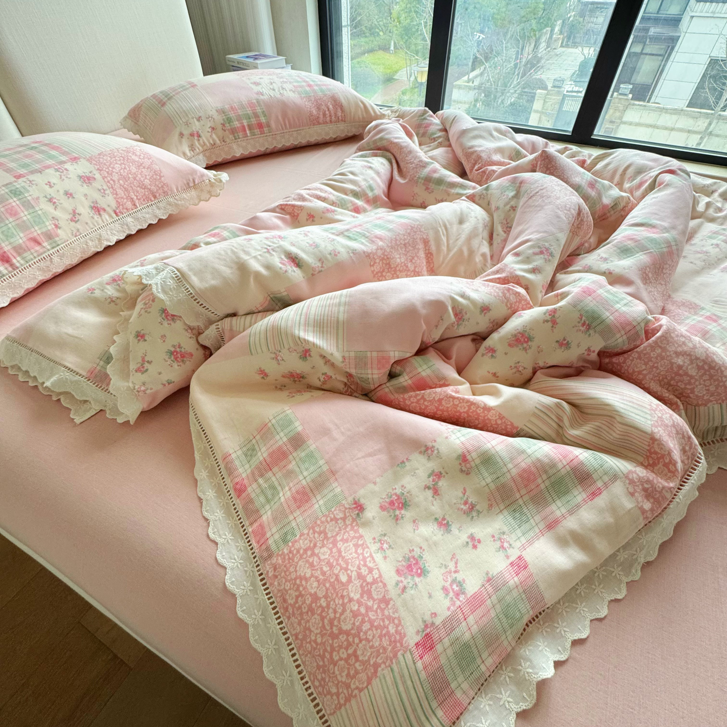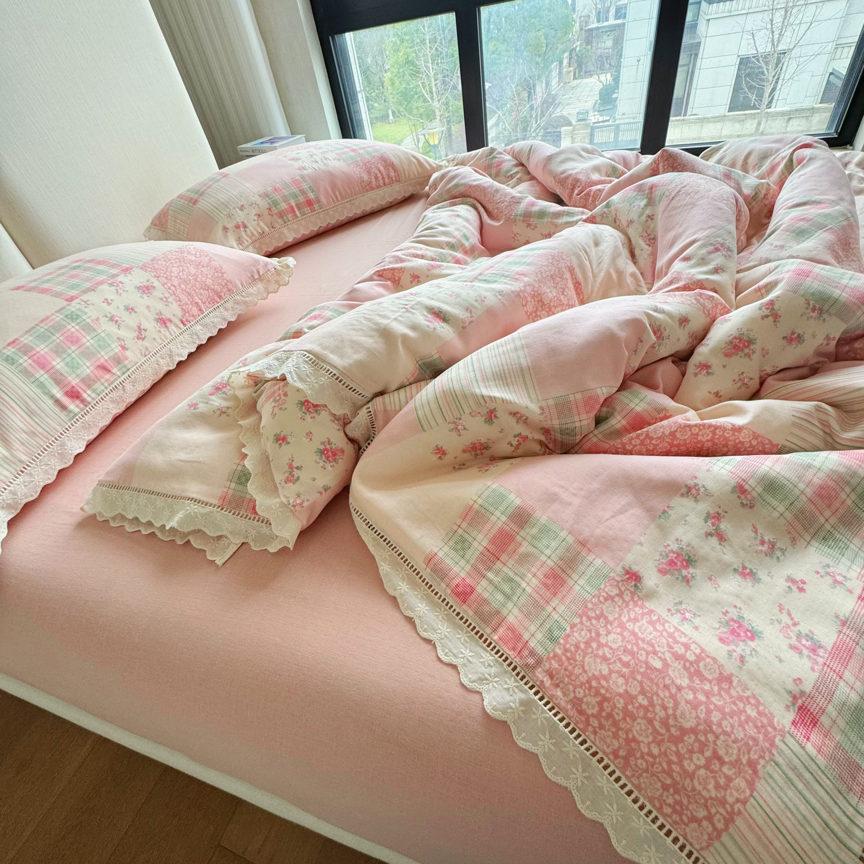 8+8 2025新款全棉A类母婴级抗菌有氧全棉双层纱亲肤全棉小清新印花三件套四件套 简约款-极简主义粉,简约款-极简主义粉