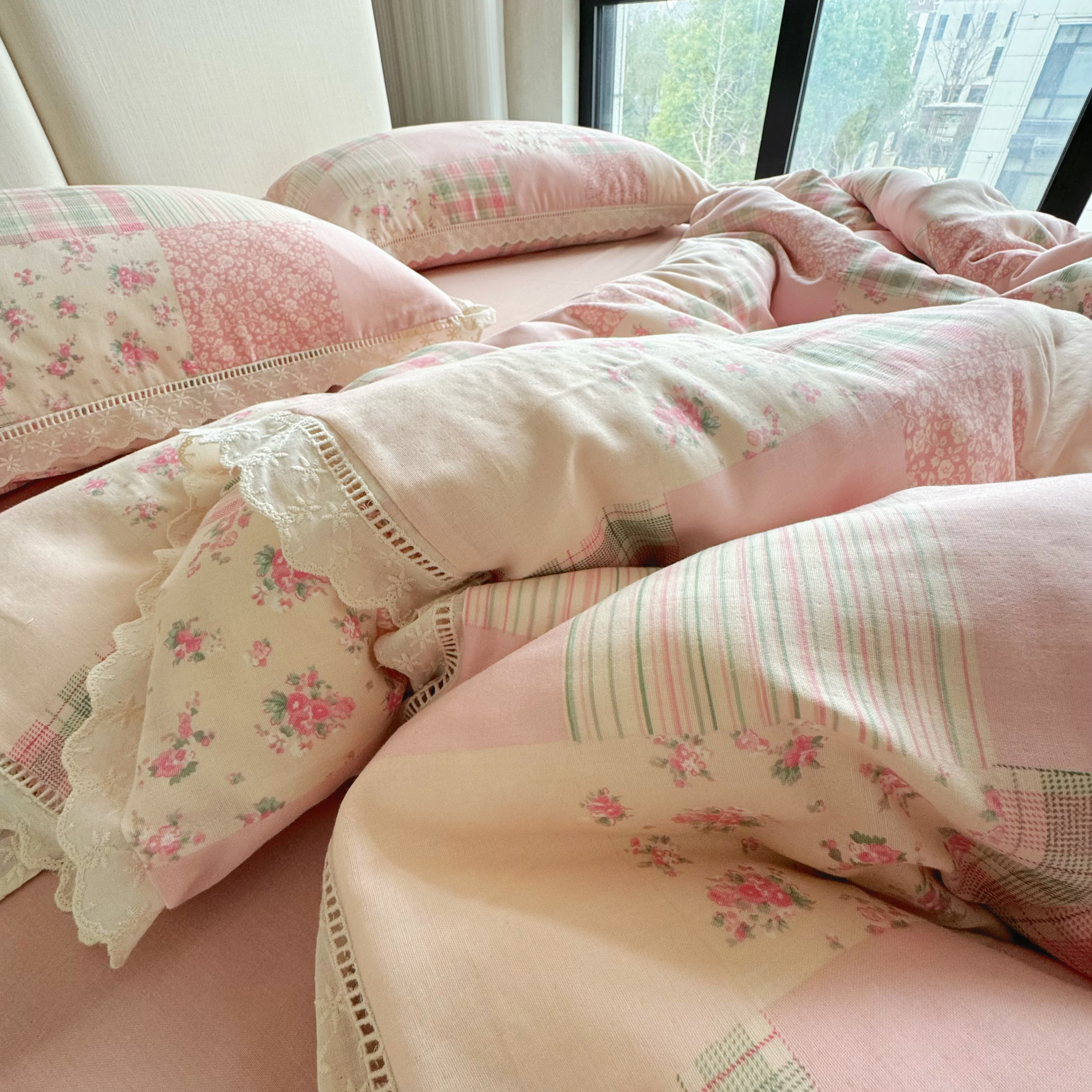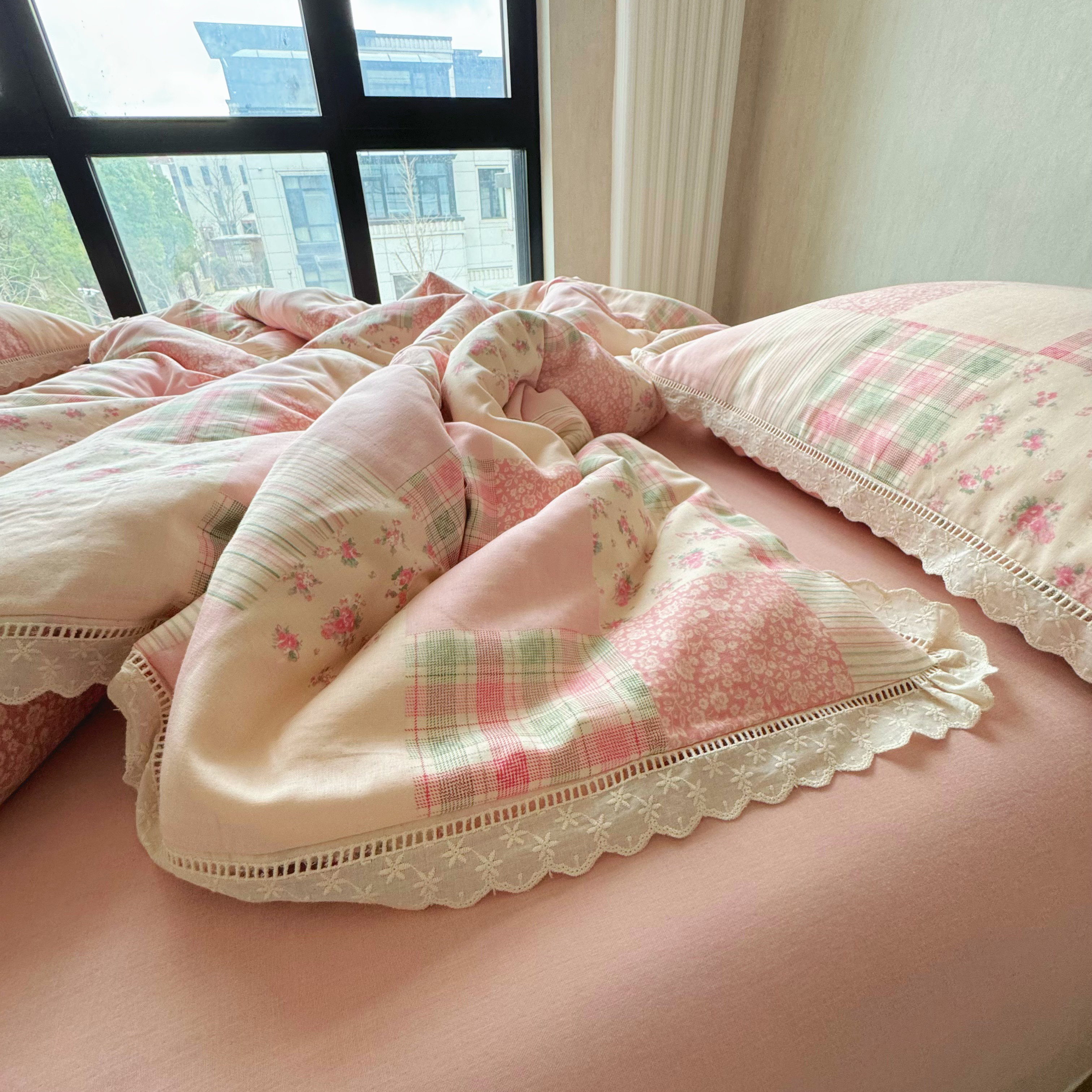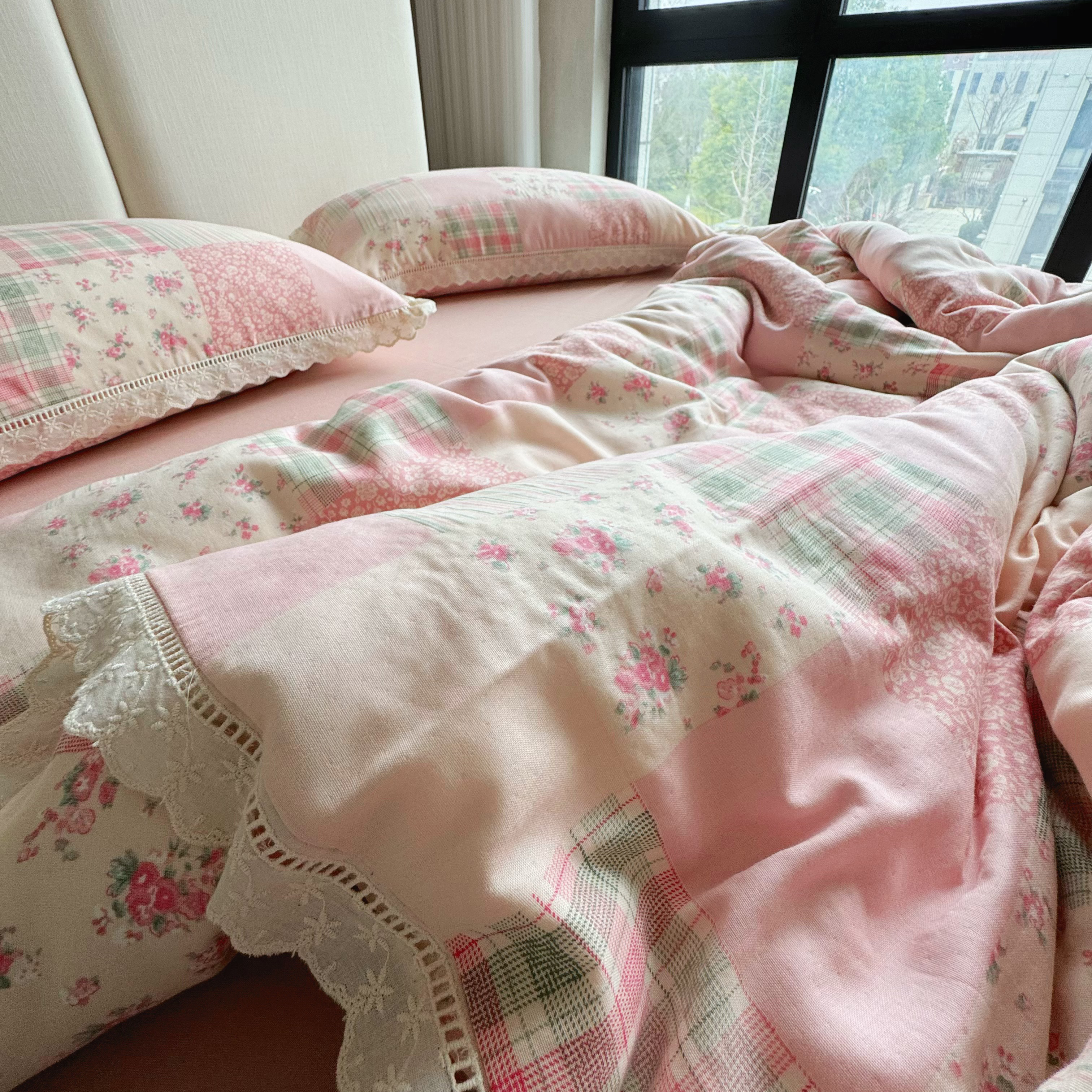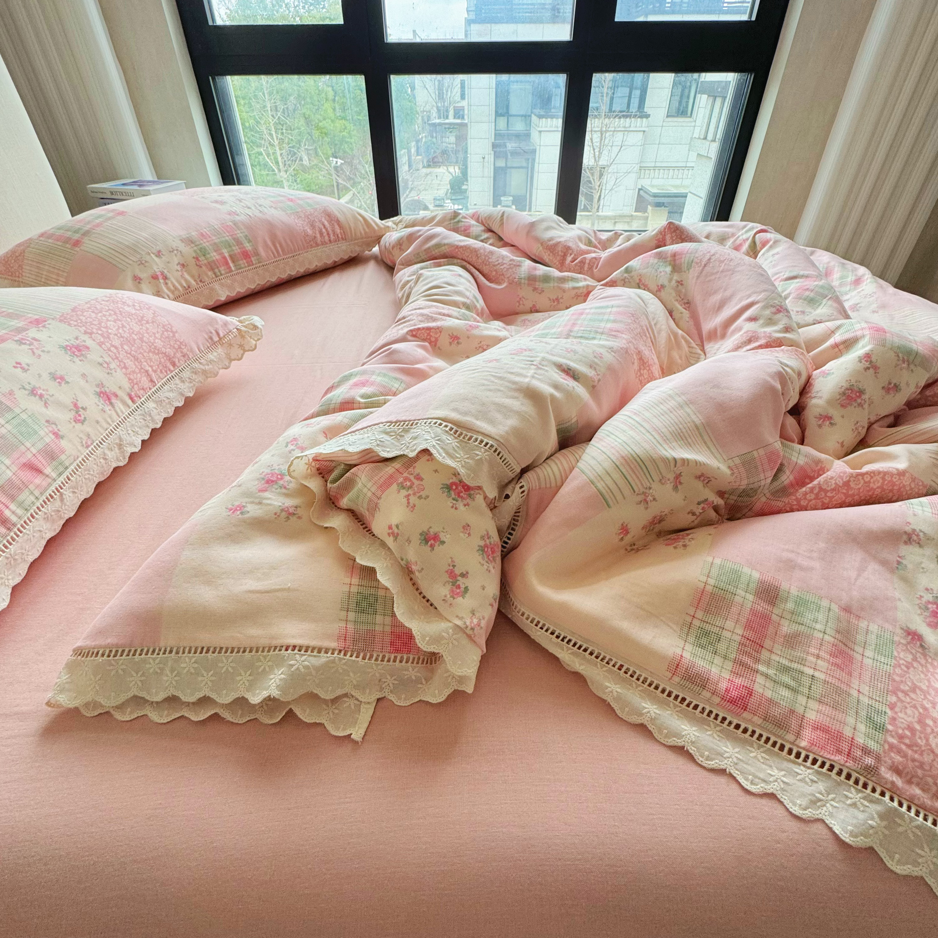 8+8 (花型持续更新中)2025新款全棉双层纱镂空花边/皱皱花边四件套 田野少女