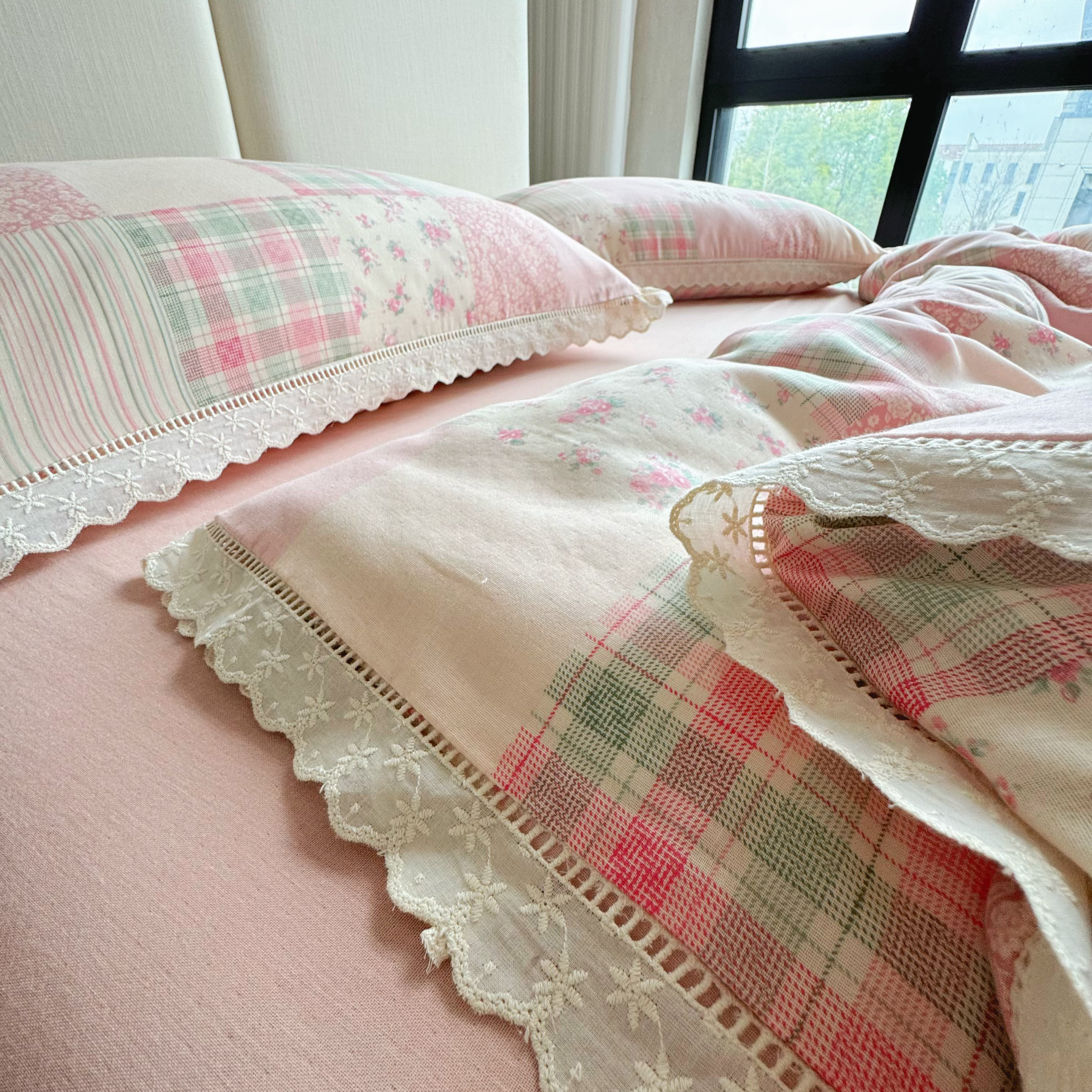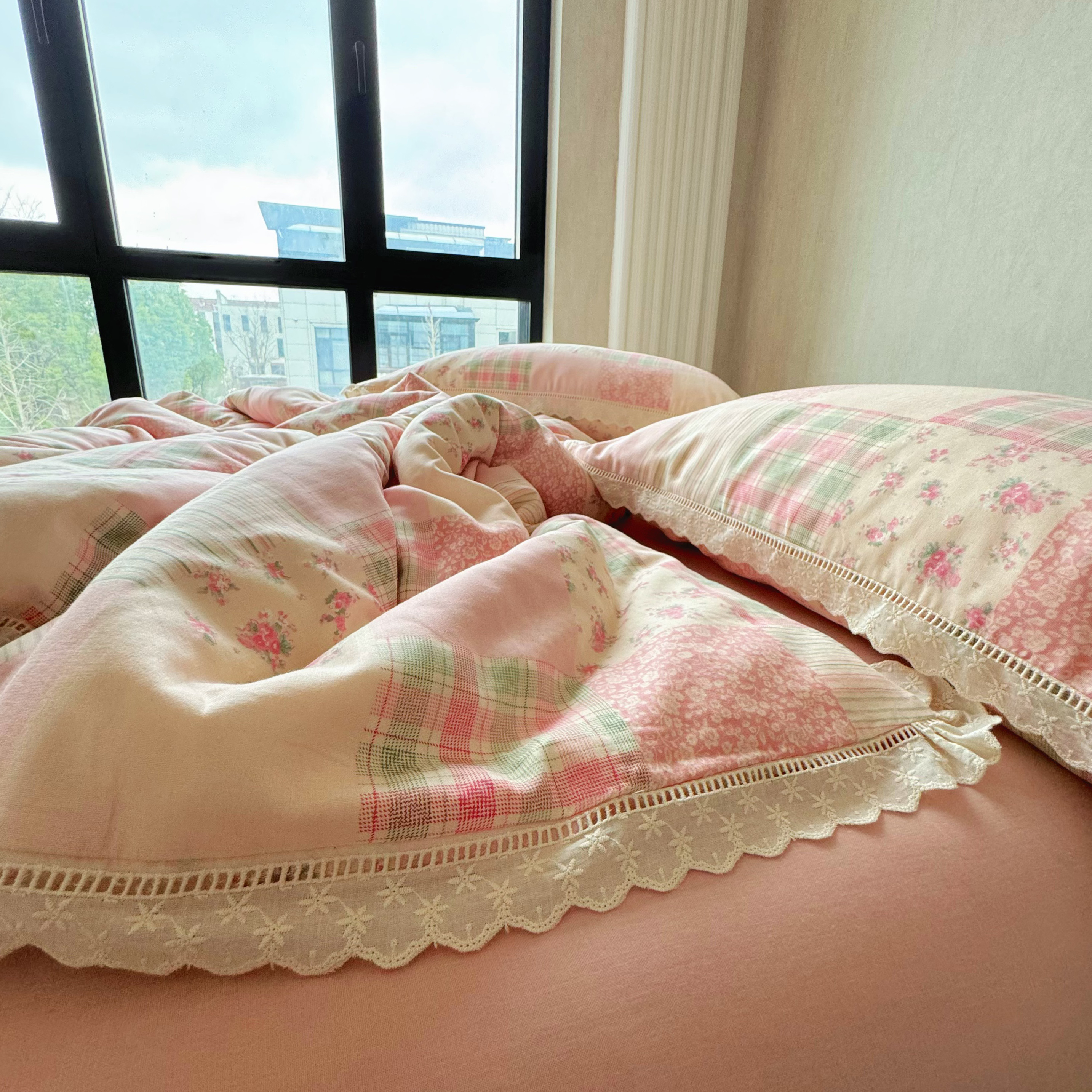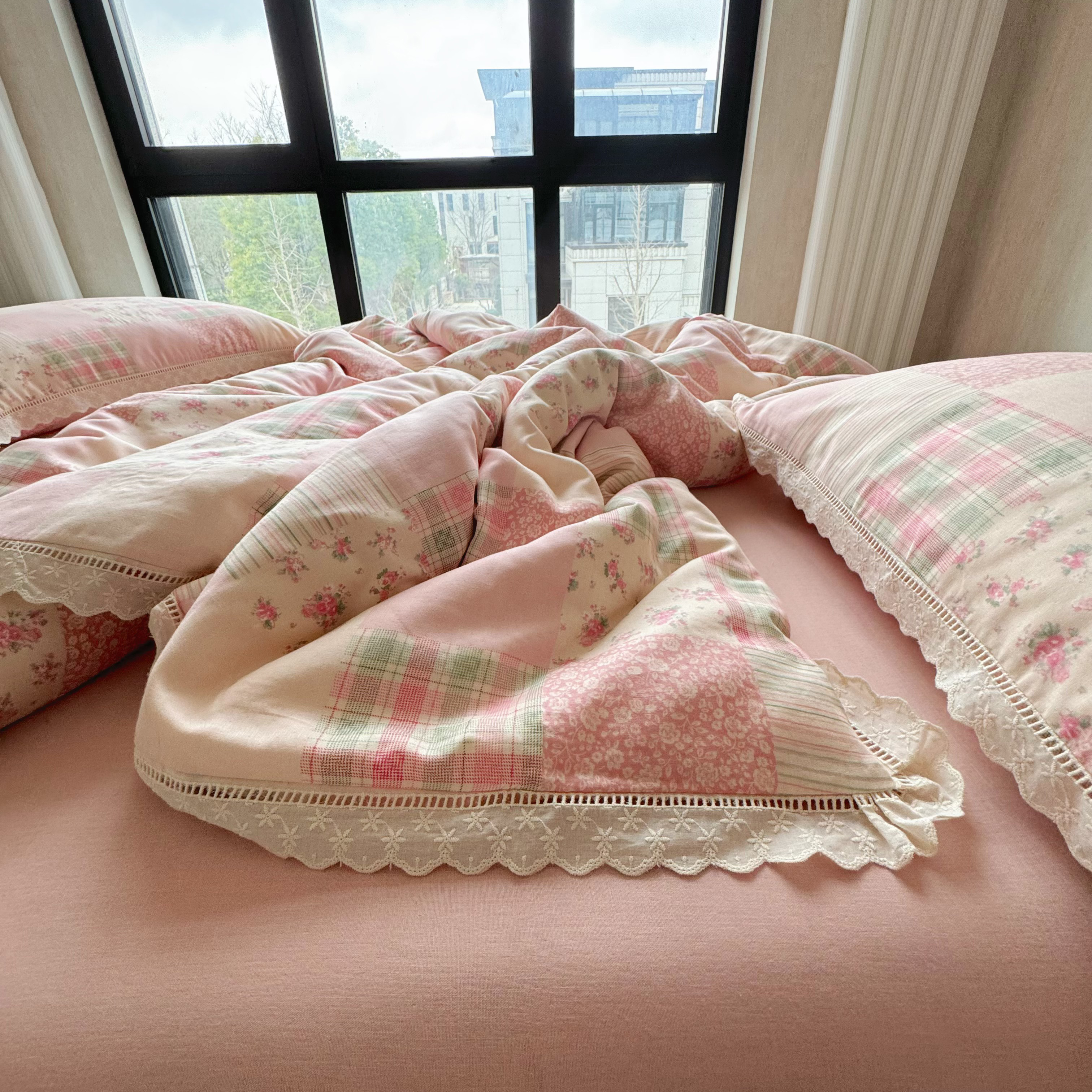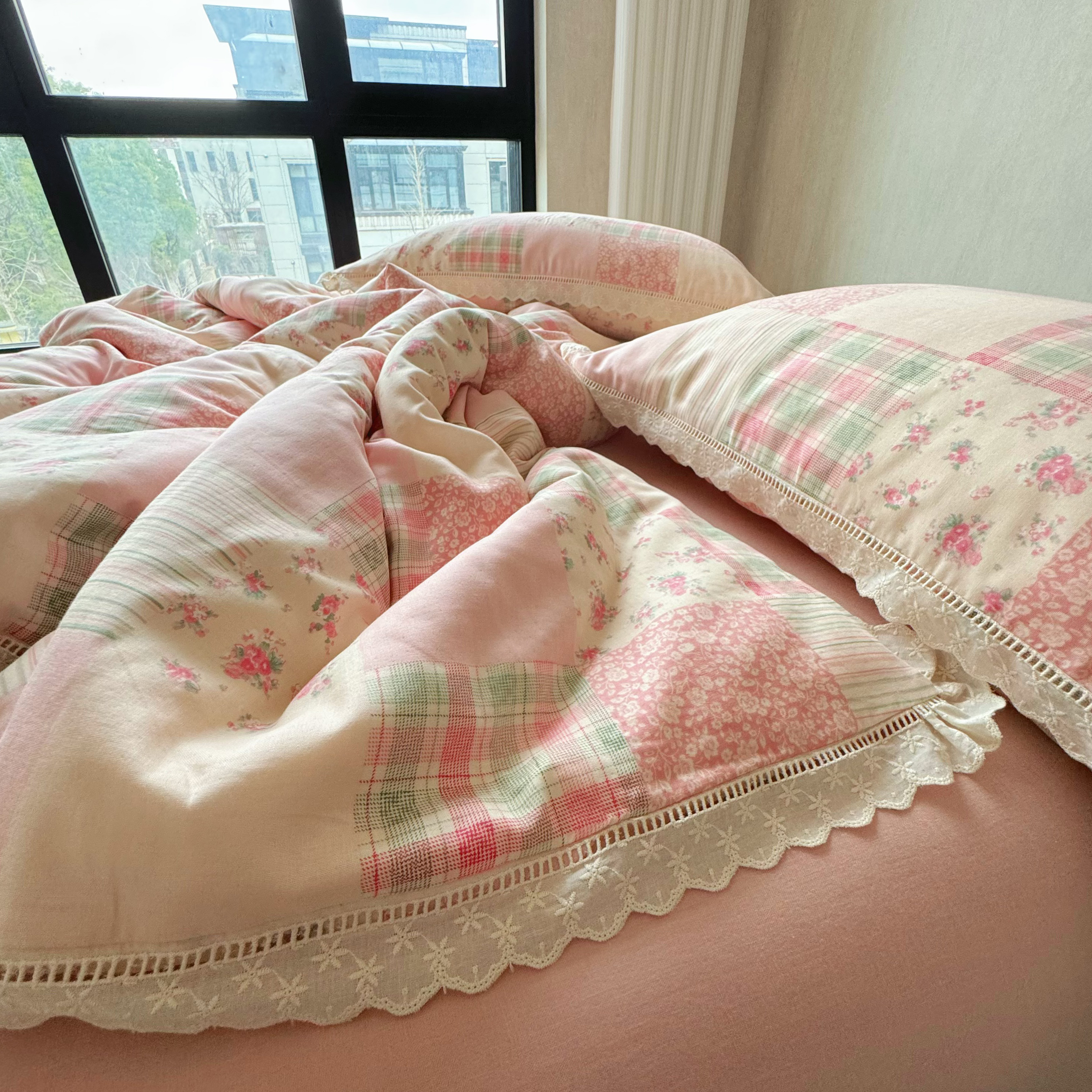 8+8 (花型持续更新中)2025新款全棉双层纱镂空花边/皱皱花边四件套 田野少女