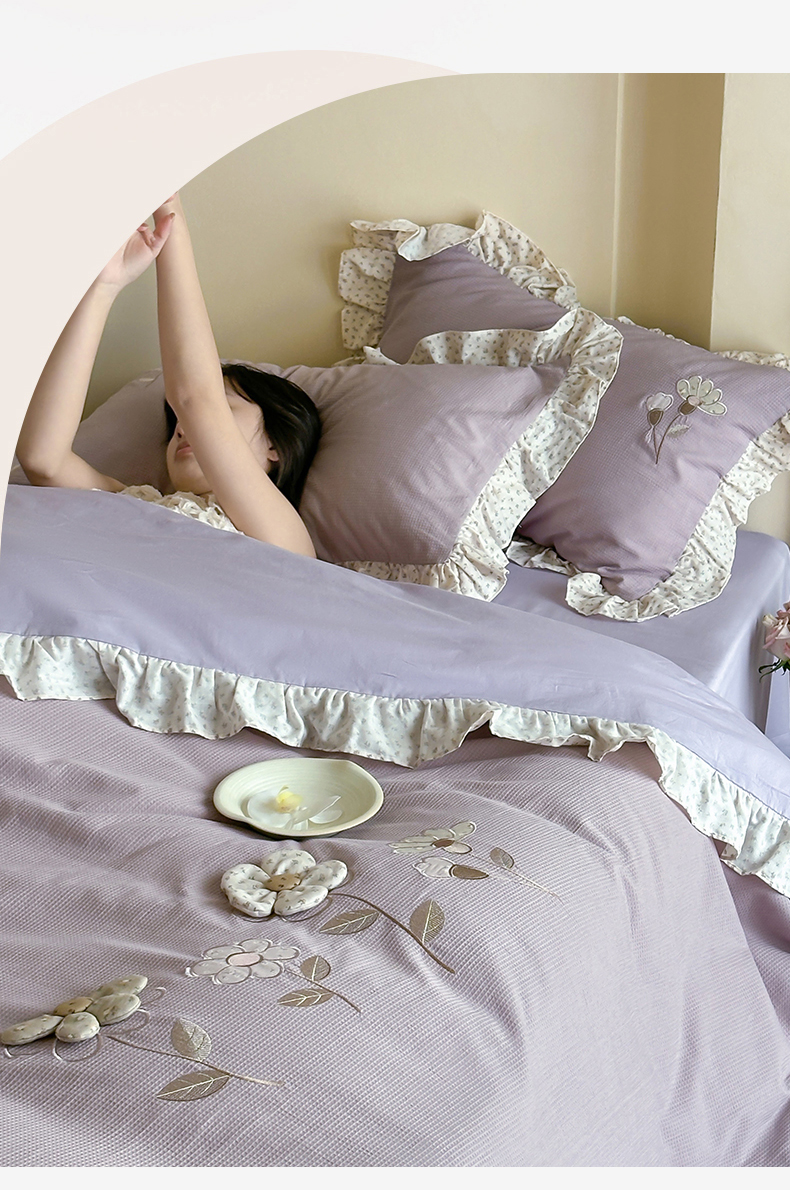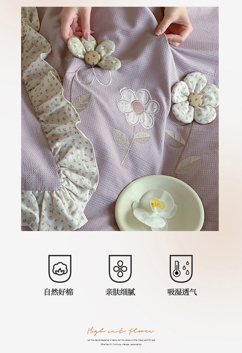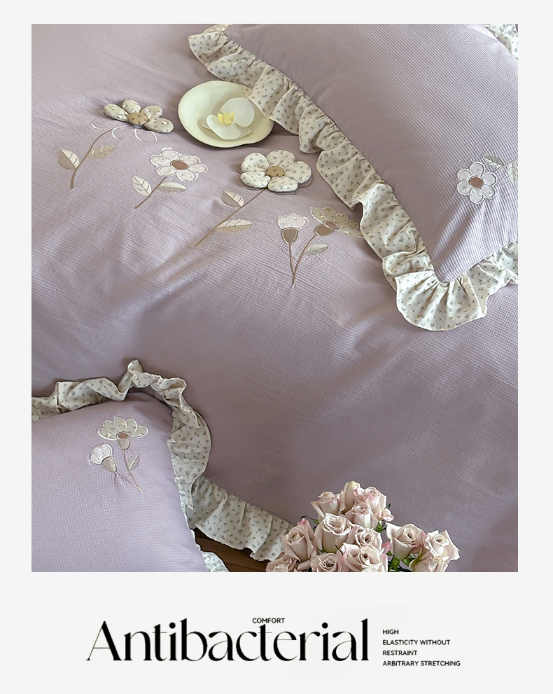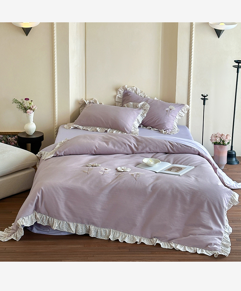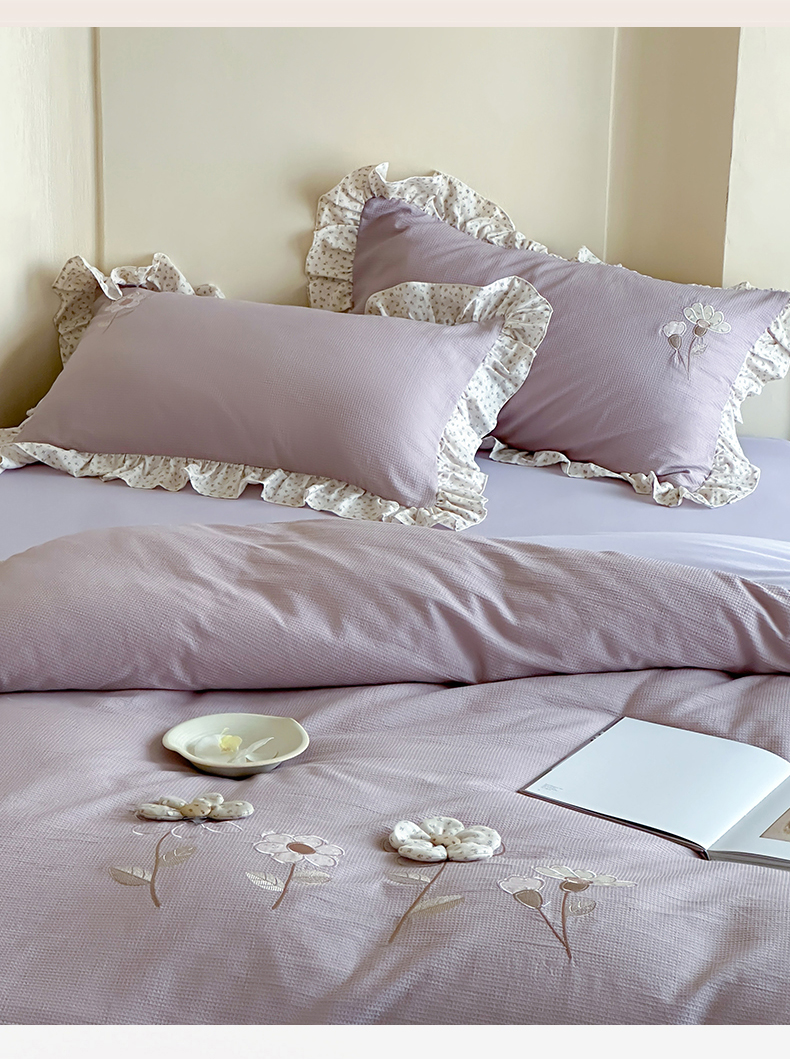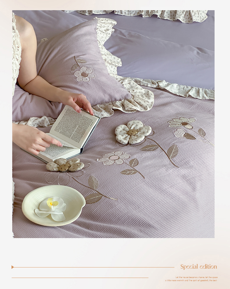 名品优仓 2025新款纯棉水洗棉双层纱提花手工花韩版花边四件套 微光花影一紫韵