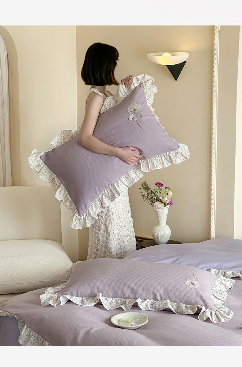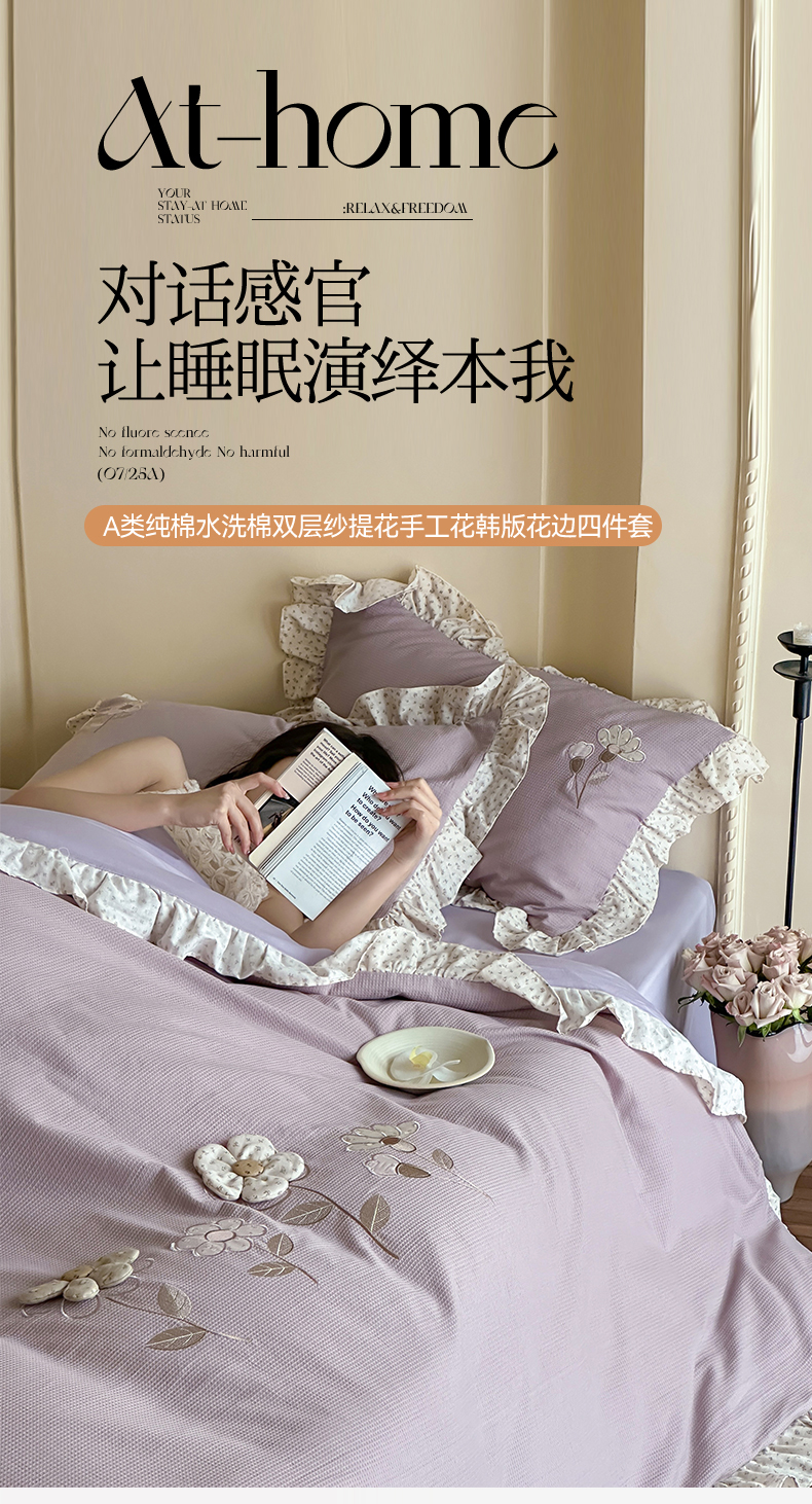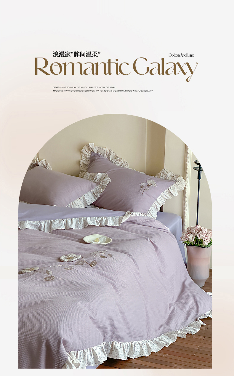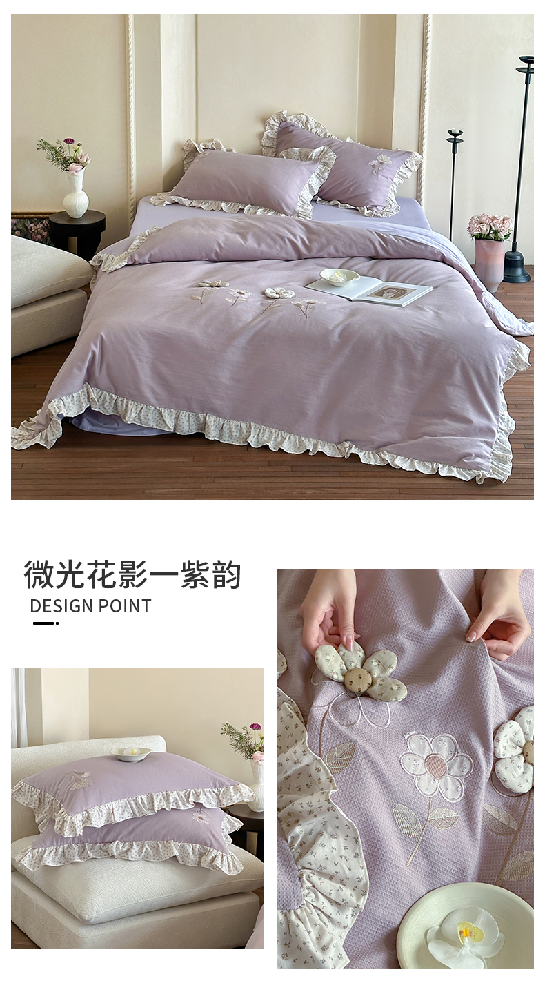 商品名称:名品优仓 2025新款纯棉水洗棉双层纱提花手工花韩版花边四件套 微光花影一紫韵
