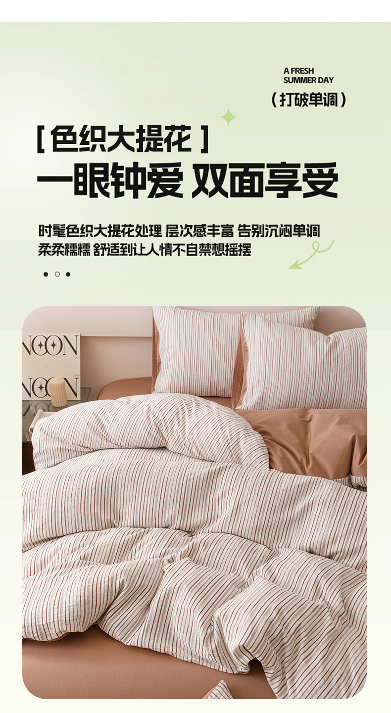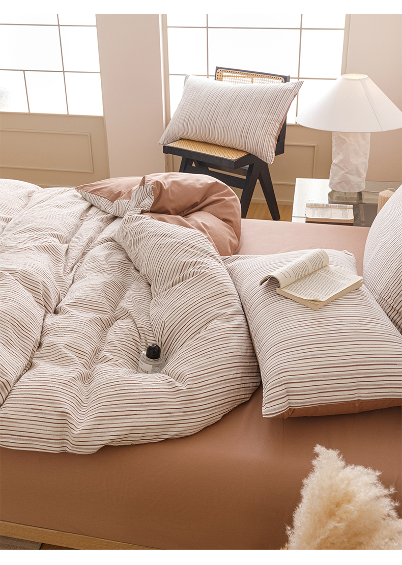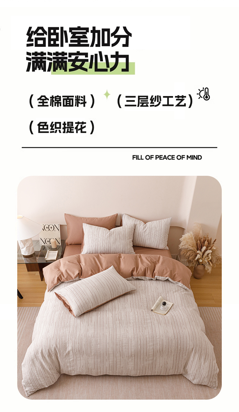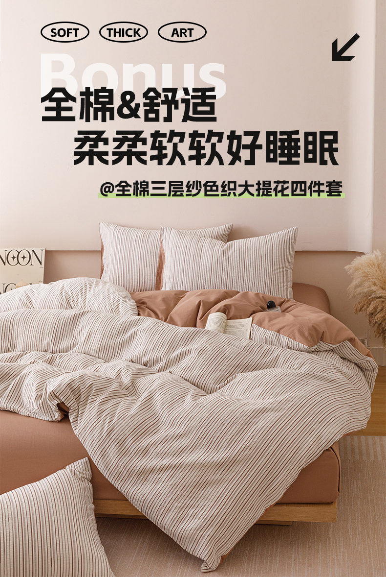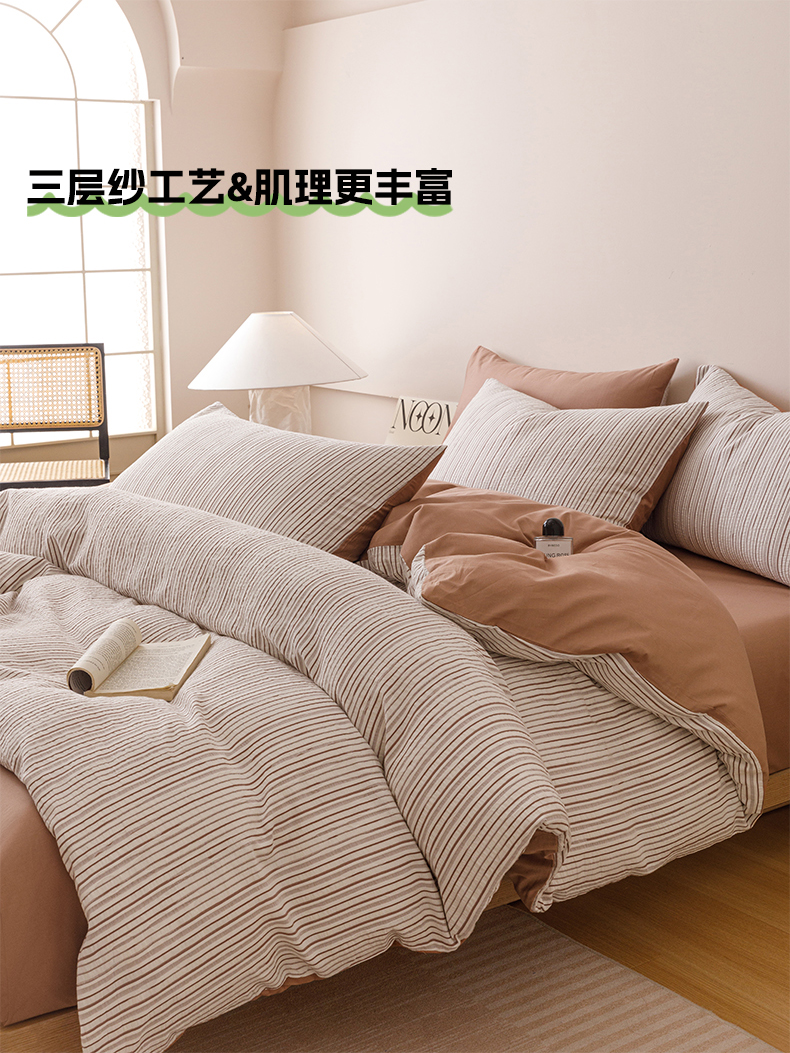 商品名称:忆生活家纺 2025新款全棉三层纱色织大提花条纹款四件套 初恋-奶咖色
