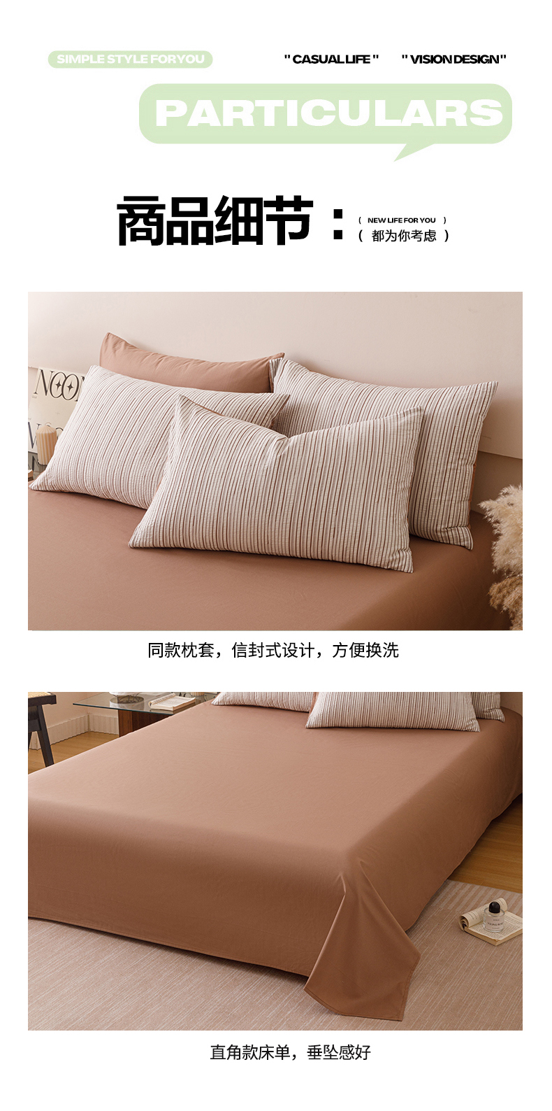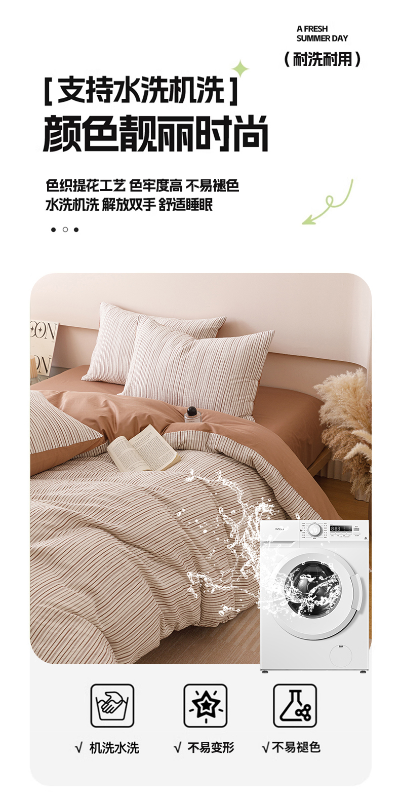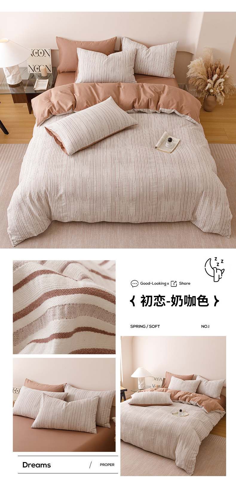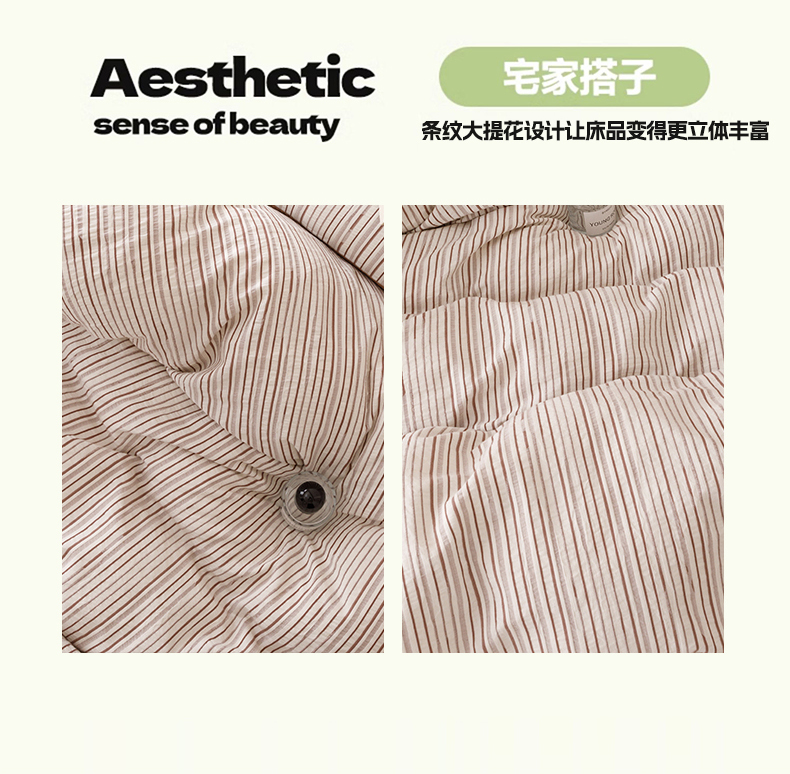 商品名称:忆生活家纺 2025新款全棉三层纱色织大提花条纹款四件套 初恋-奶咖色