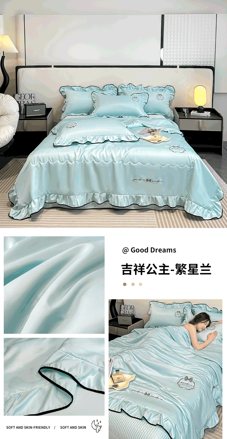商品名称:富米莱 2025新款韩版水洗真丝冰丝刺绣夏被夏凉被空调被床盖四件套 吉祥公主-繁星兰