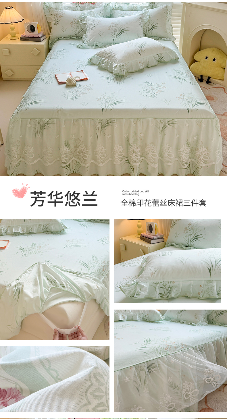 当前位置: 91家纺网 > 商品网购 > 床品套件 > 四件套 > 全棉普通四件套 > 宜凡家纺 2025新款全棉蕾丝花边床裙三件套 芳华悠兰