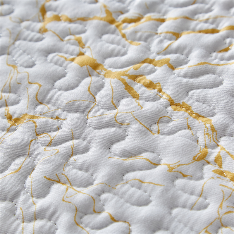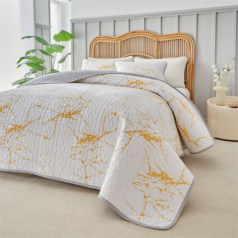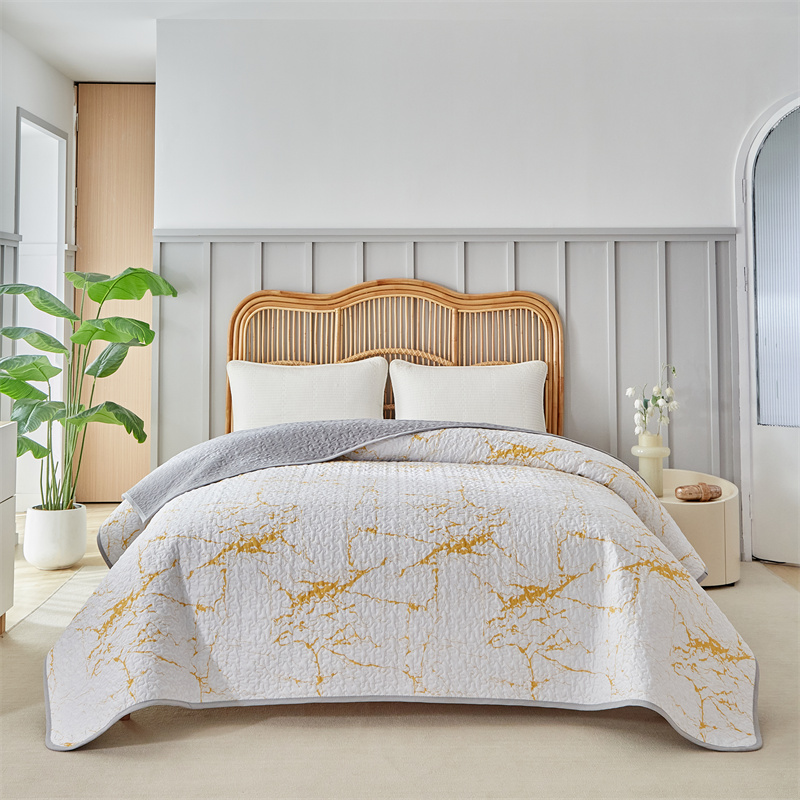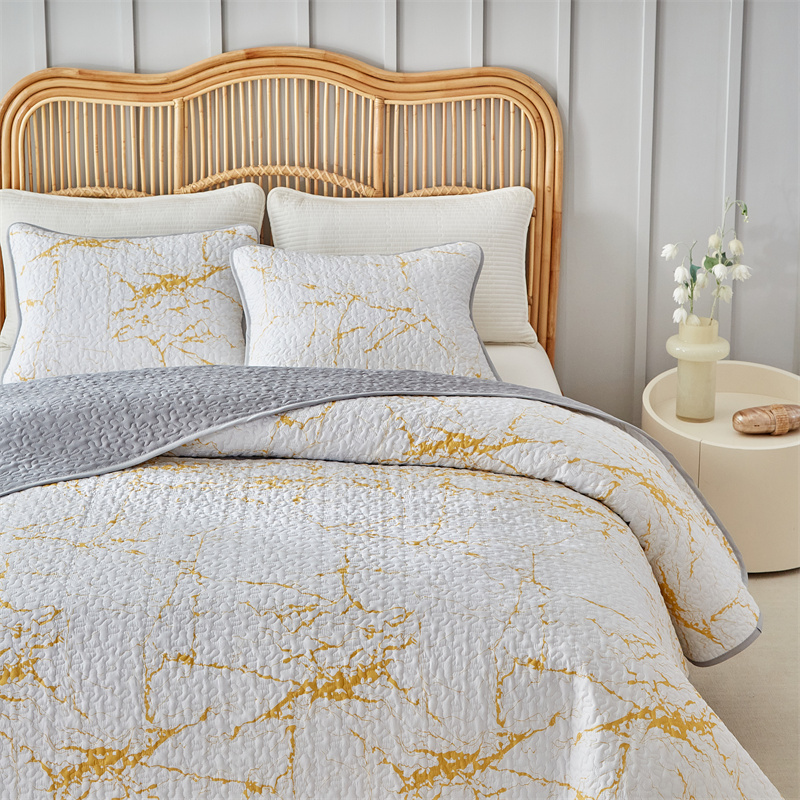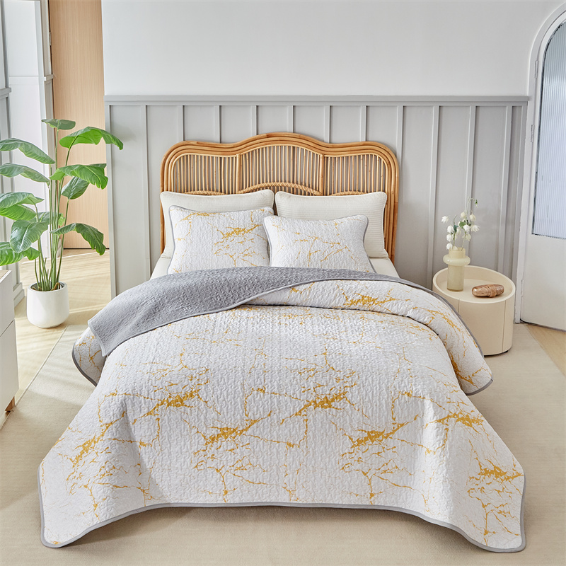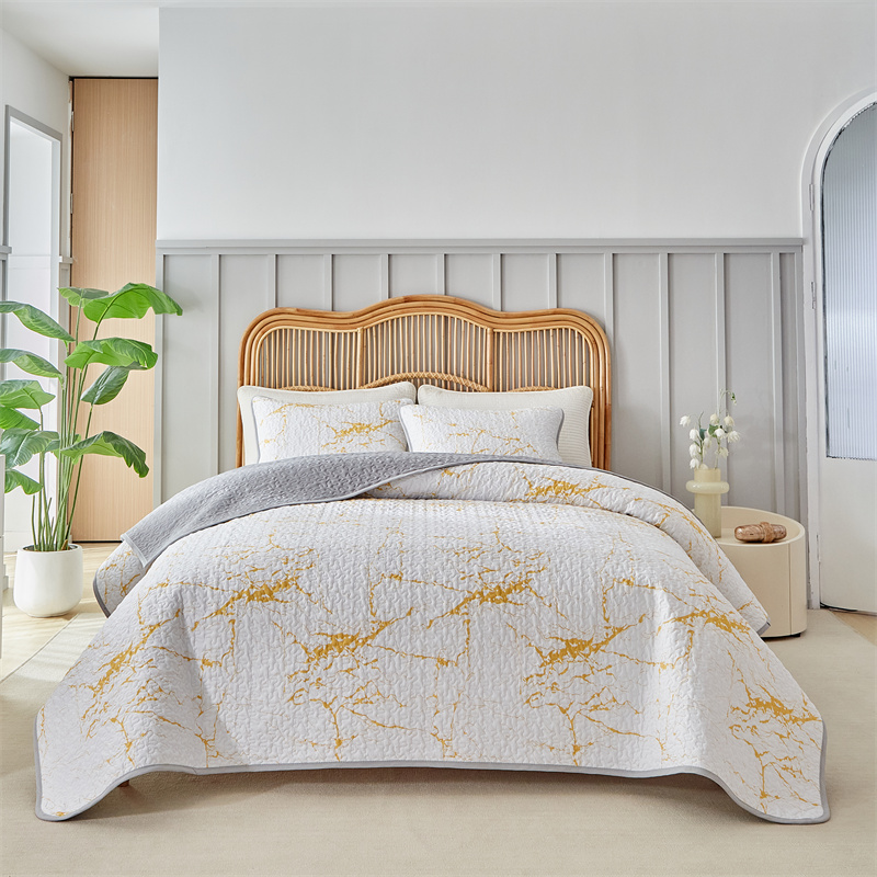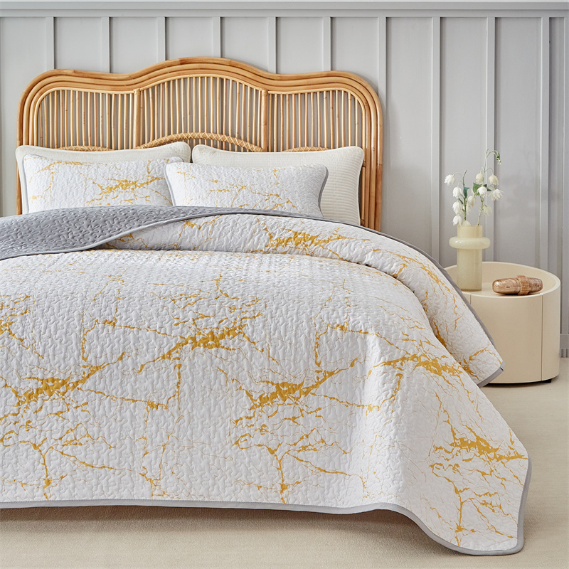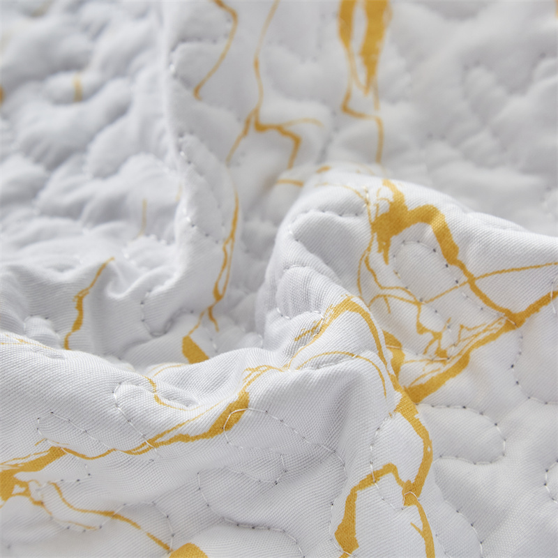 温宁家纺 2025新款跨境双面化纤水洗棉传统印花夹棉四季床盖 抽象黄白