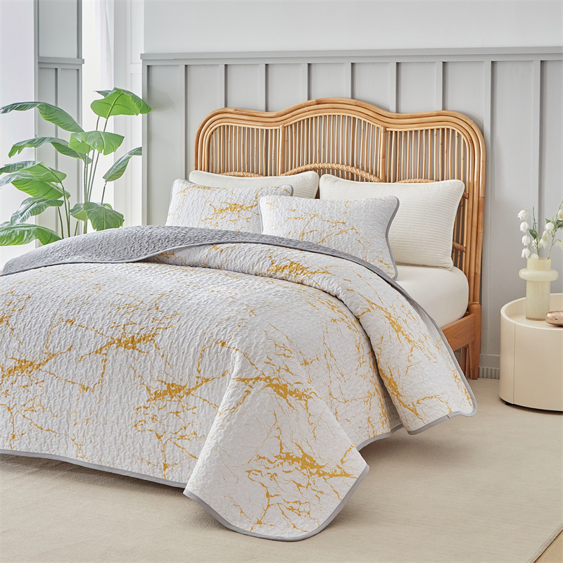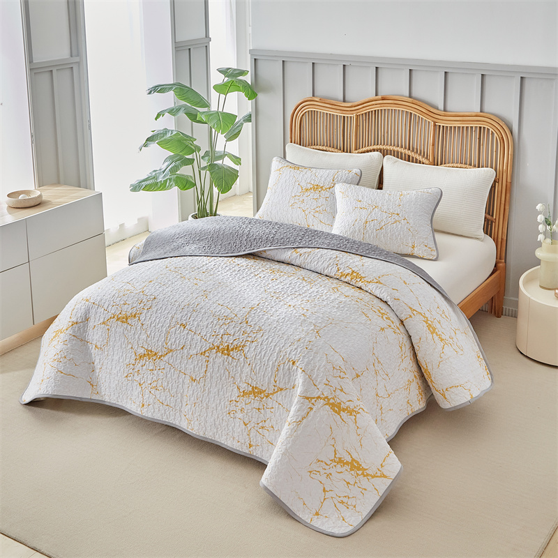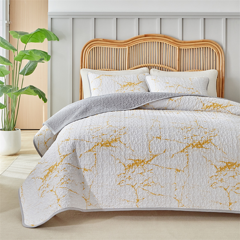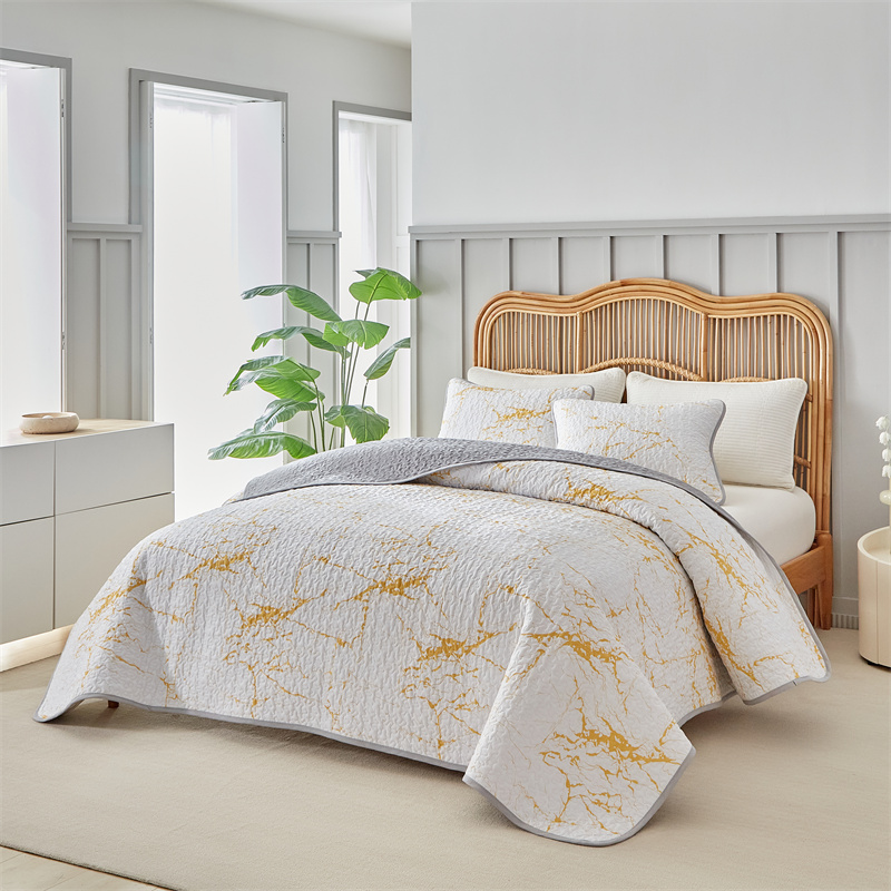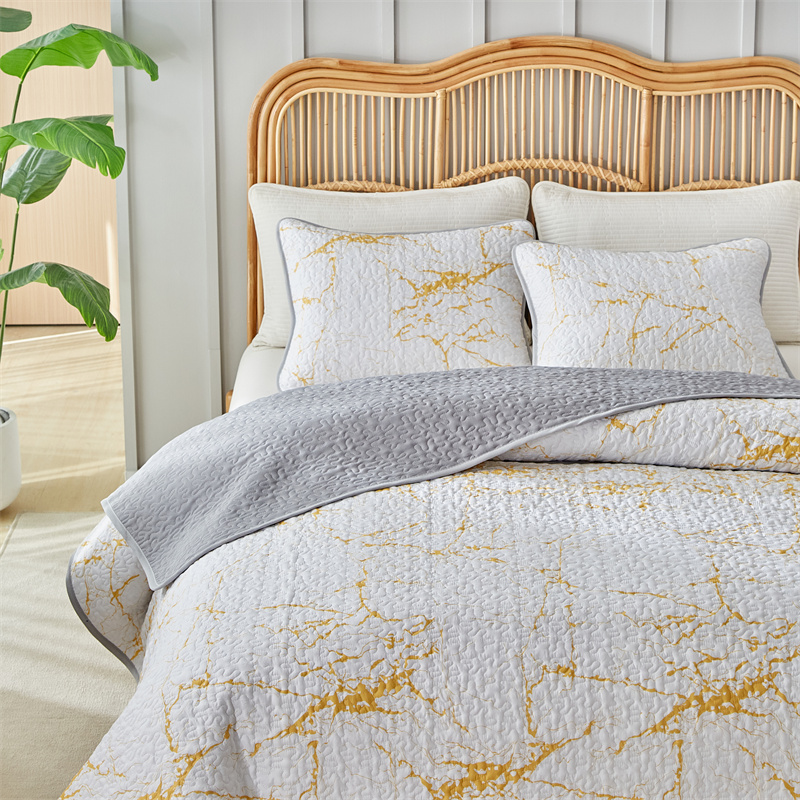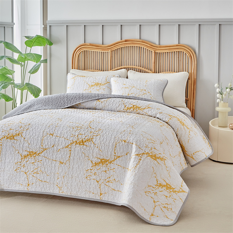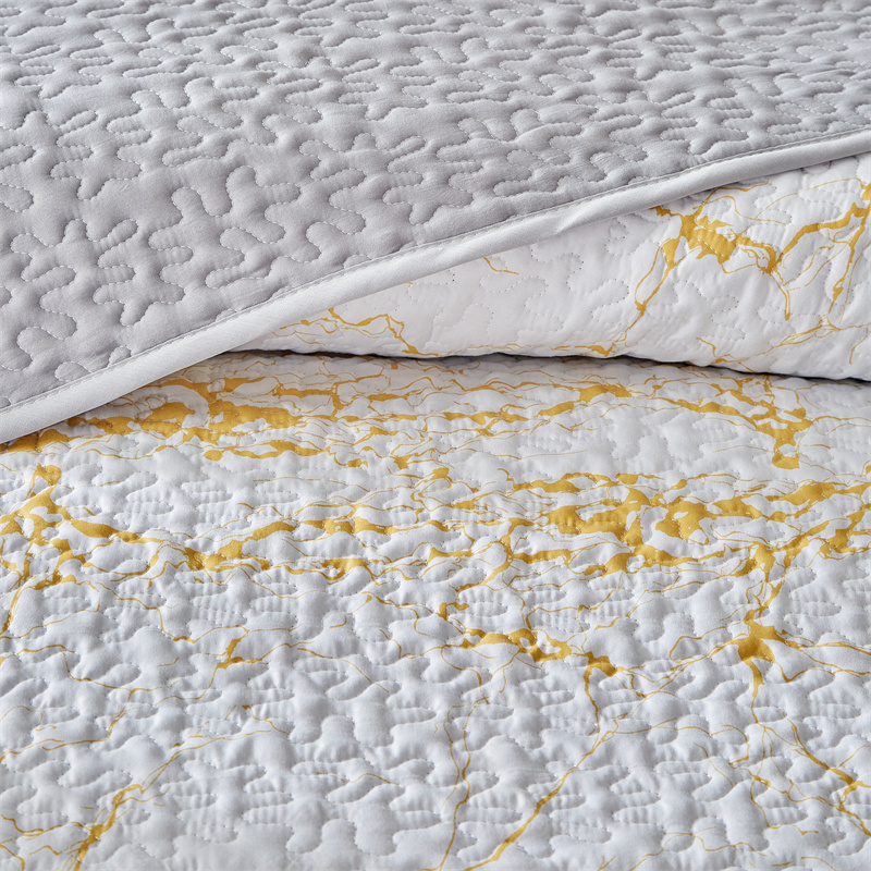 温宁家纺 2025新款跨境双面化纤水洗棉传统印花夹棉四季床盖 抽象黄白