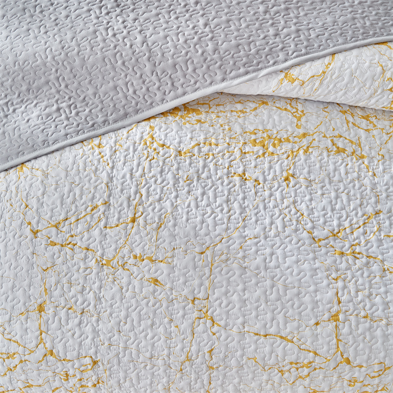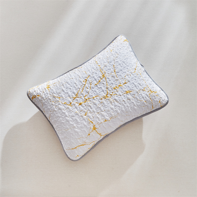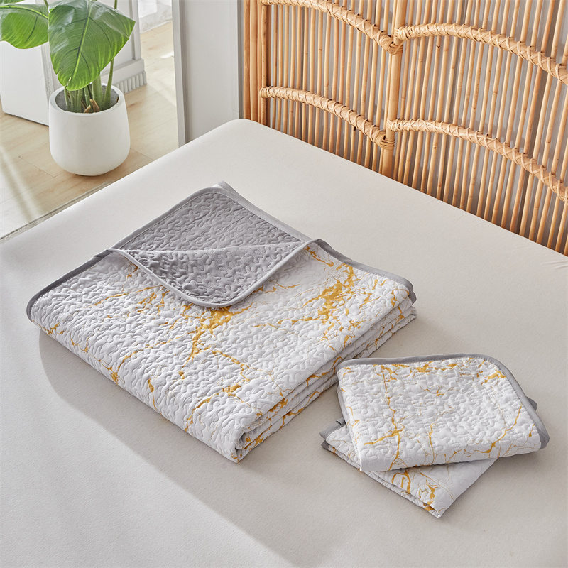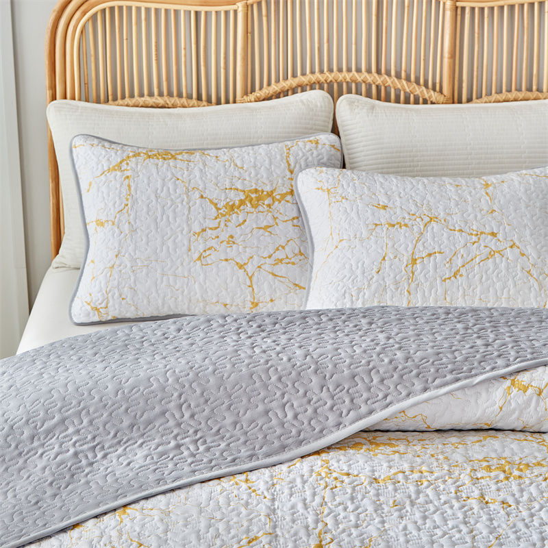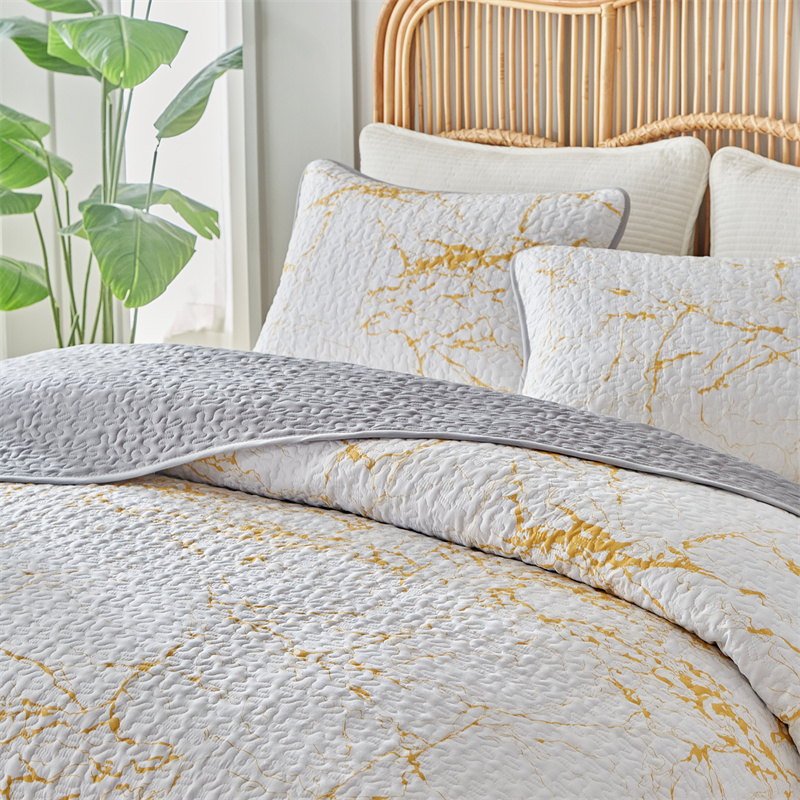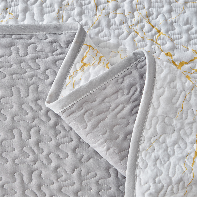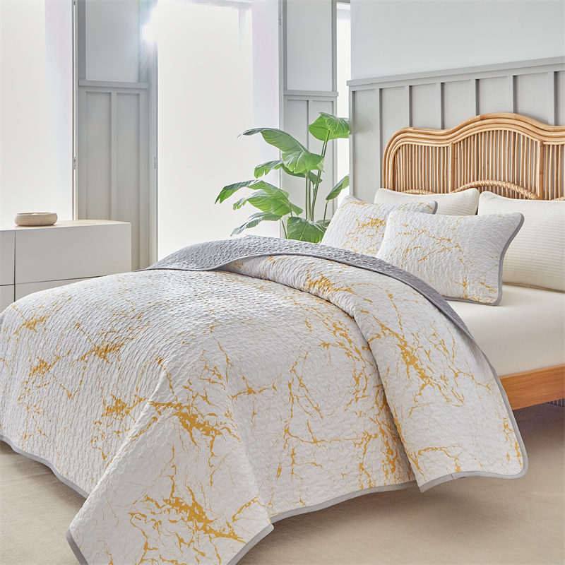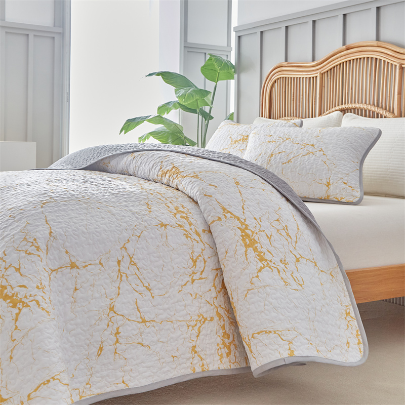 温宁家纺 2025新款跨境双面化纤水洗棉传统印花夹棉四季床盖 抽象黄白