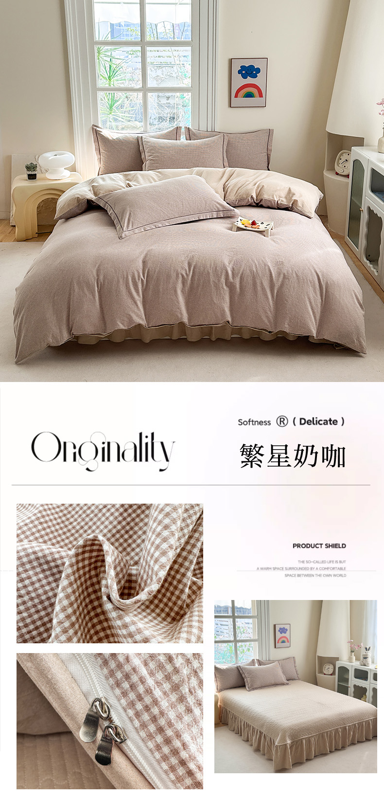 商品名称:金窝窝家纺 2025新款全棉色织水洗棉床盖四件套 繁星奶咖米格