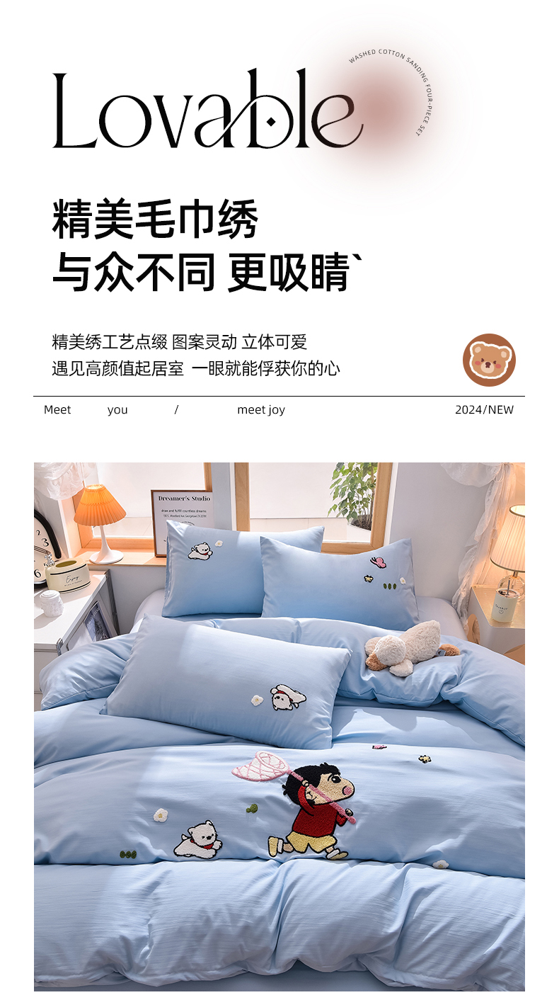 乐窝家纺仓储 2025新款云朵棉毛巾绣磨毛四件套 蜡笔小新