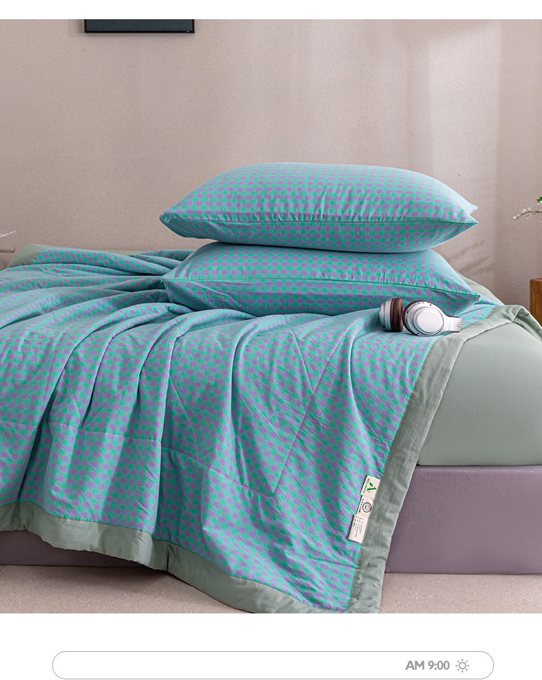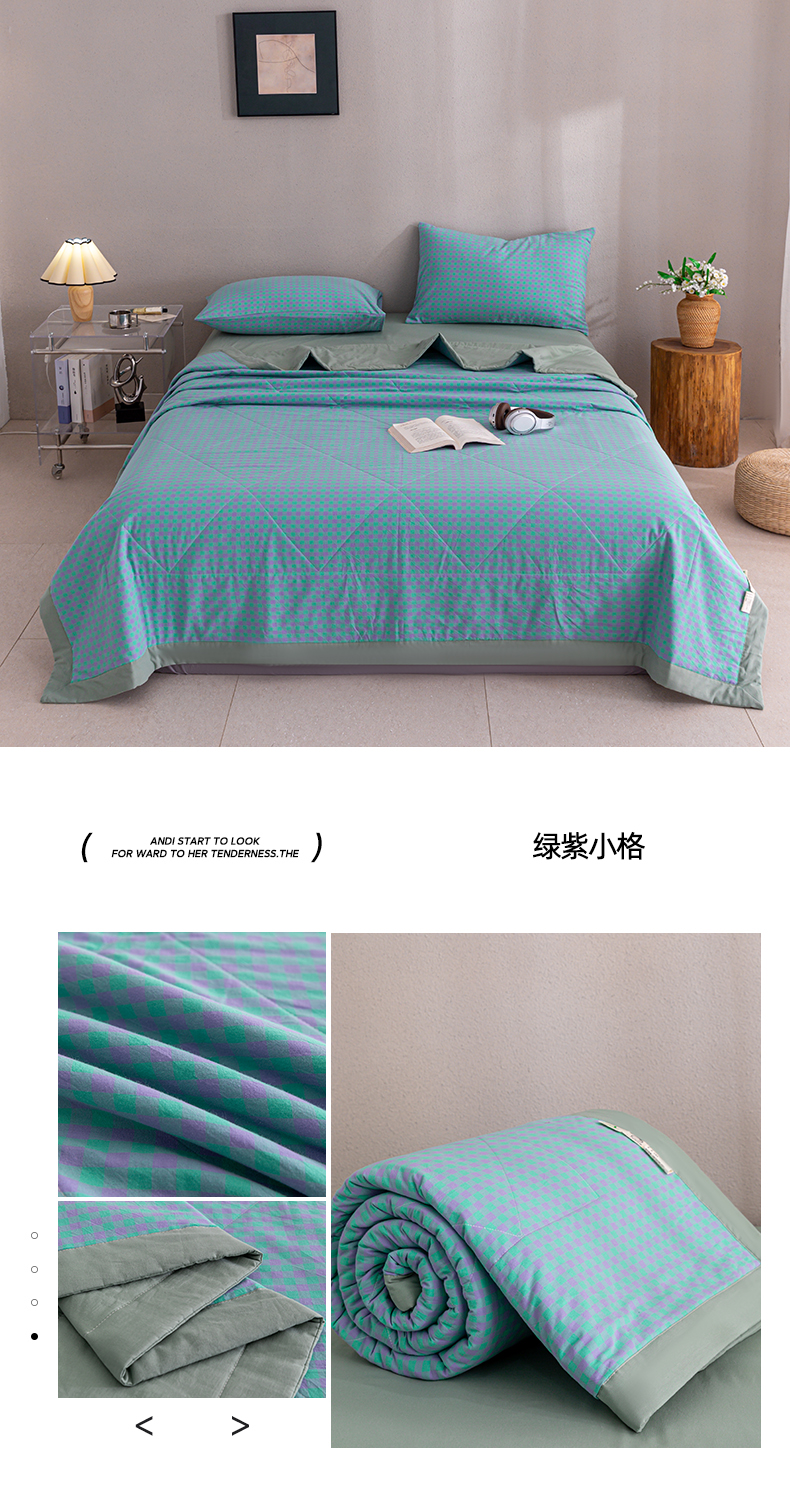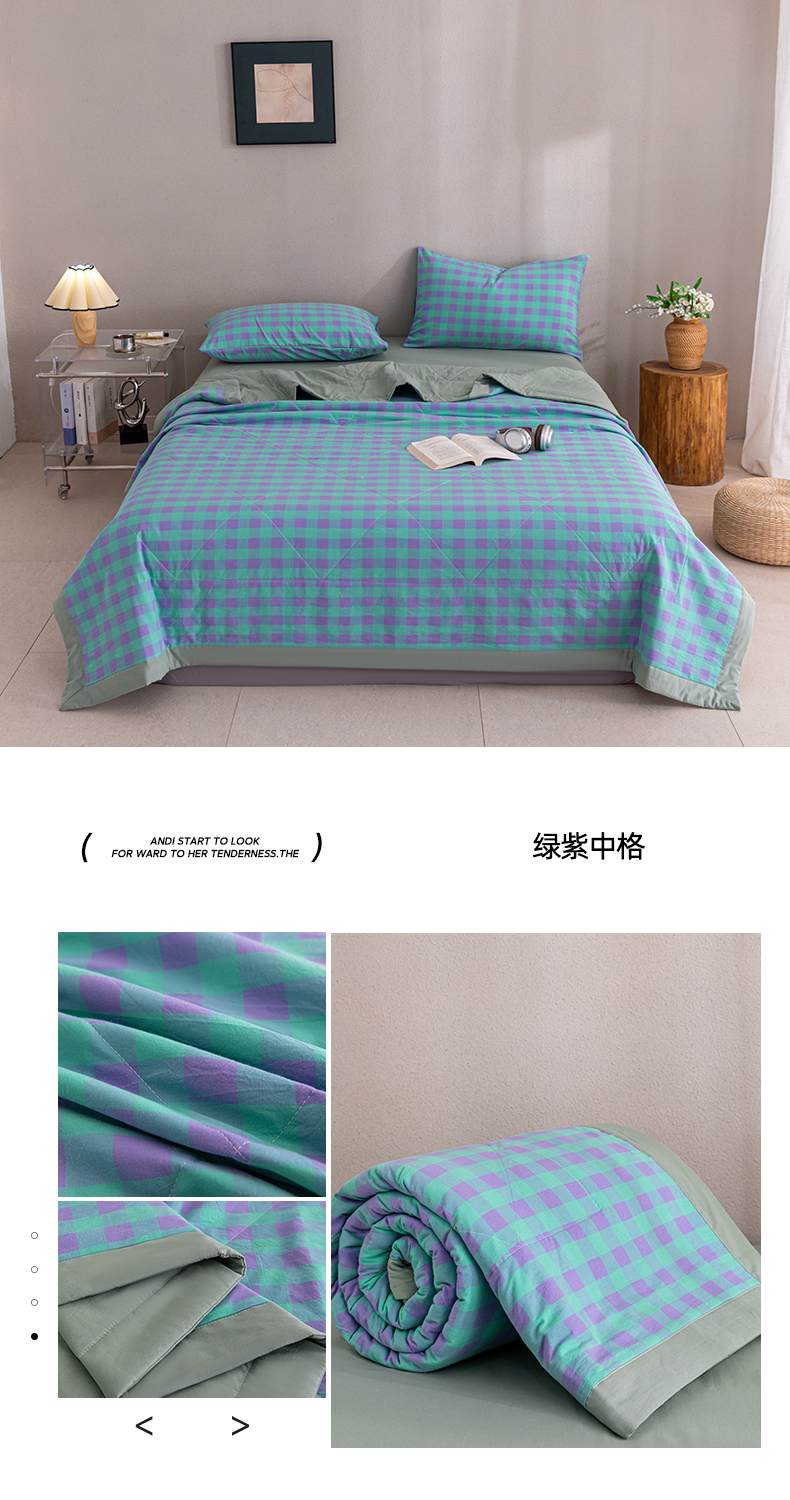 天瑜家纺 2025新款色织全棉水洗棉棉花夏被 绿紫小格