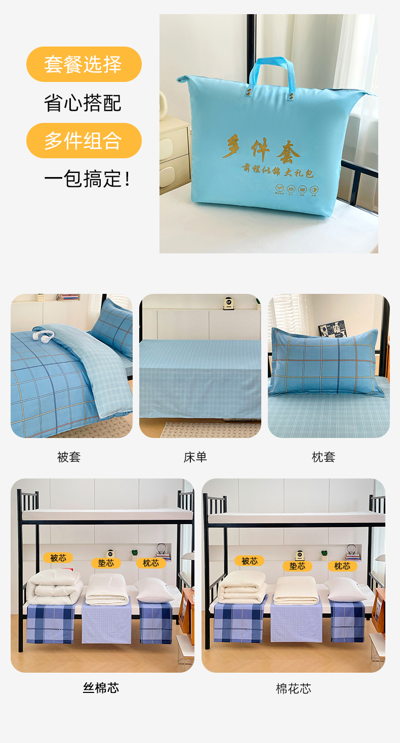 六件套:【三件套+4斤羽丝绒被子+4斤羽丝绒床垫(90*200)+枕芯】 | ¥150.00 |