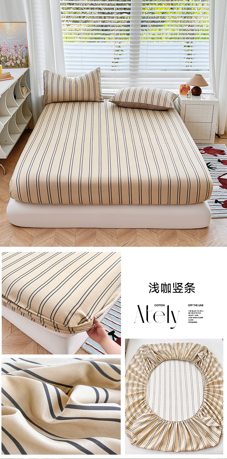 • 91家纺网 家纺一手货源 找家纺 赫然家纺 2026新款亲肤舒适活性印染水洗棉床笠系列床笠三件套(床笠+枕套) 浅咖竖条