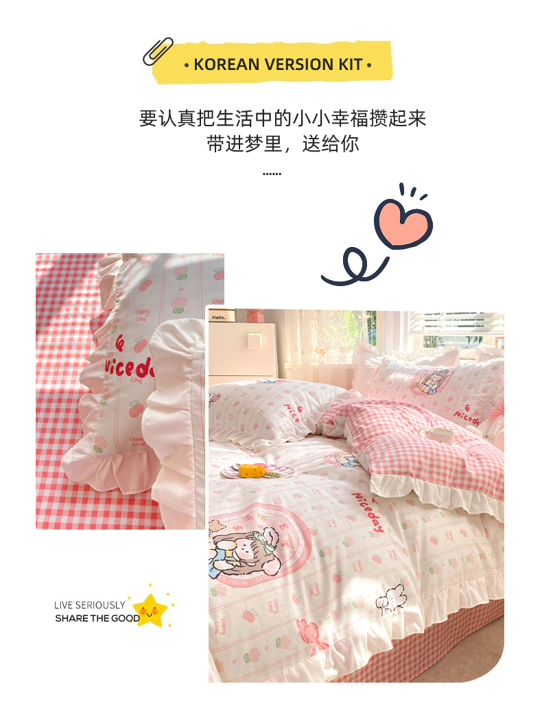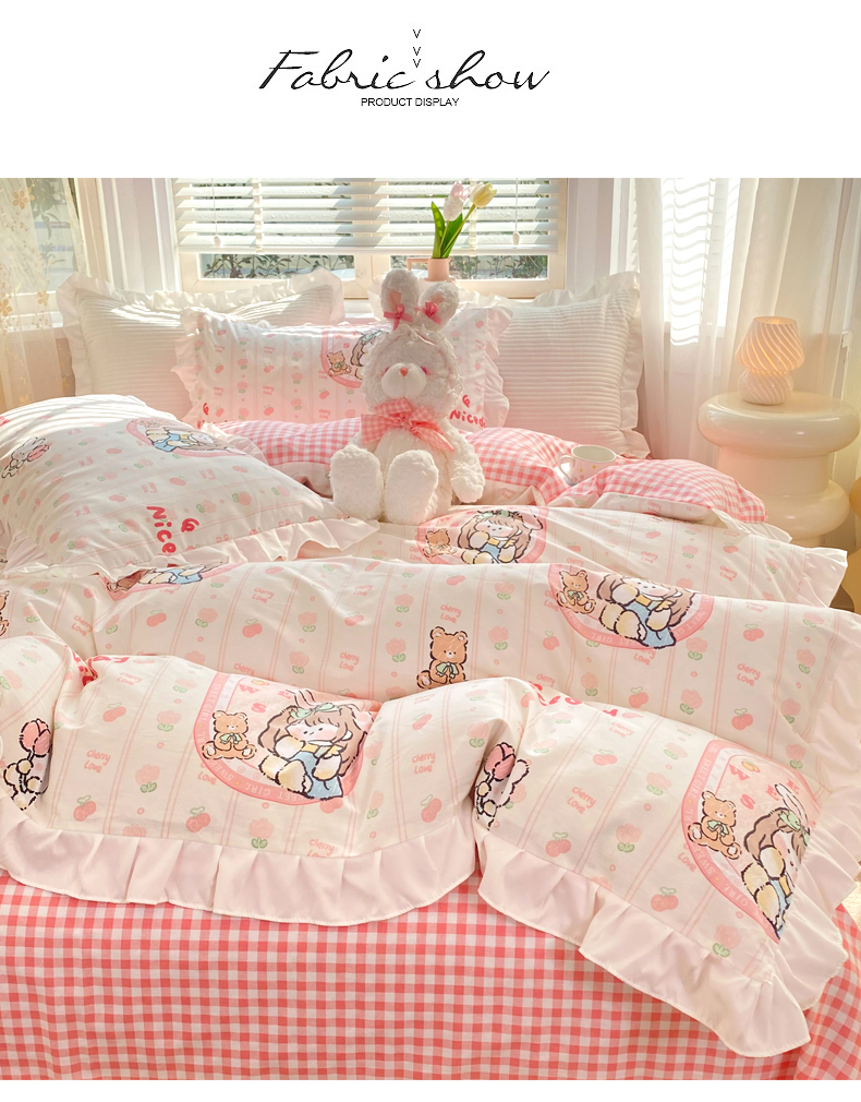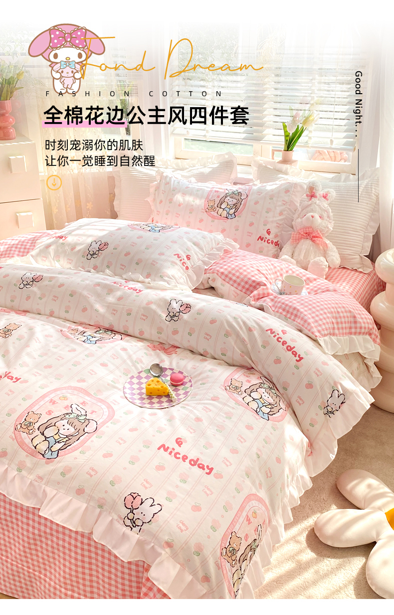 商品名称:玉元坊 2025春夏新款公主风全棉纯棉花边被套床单四件套 公主兔