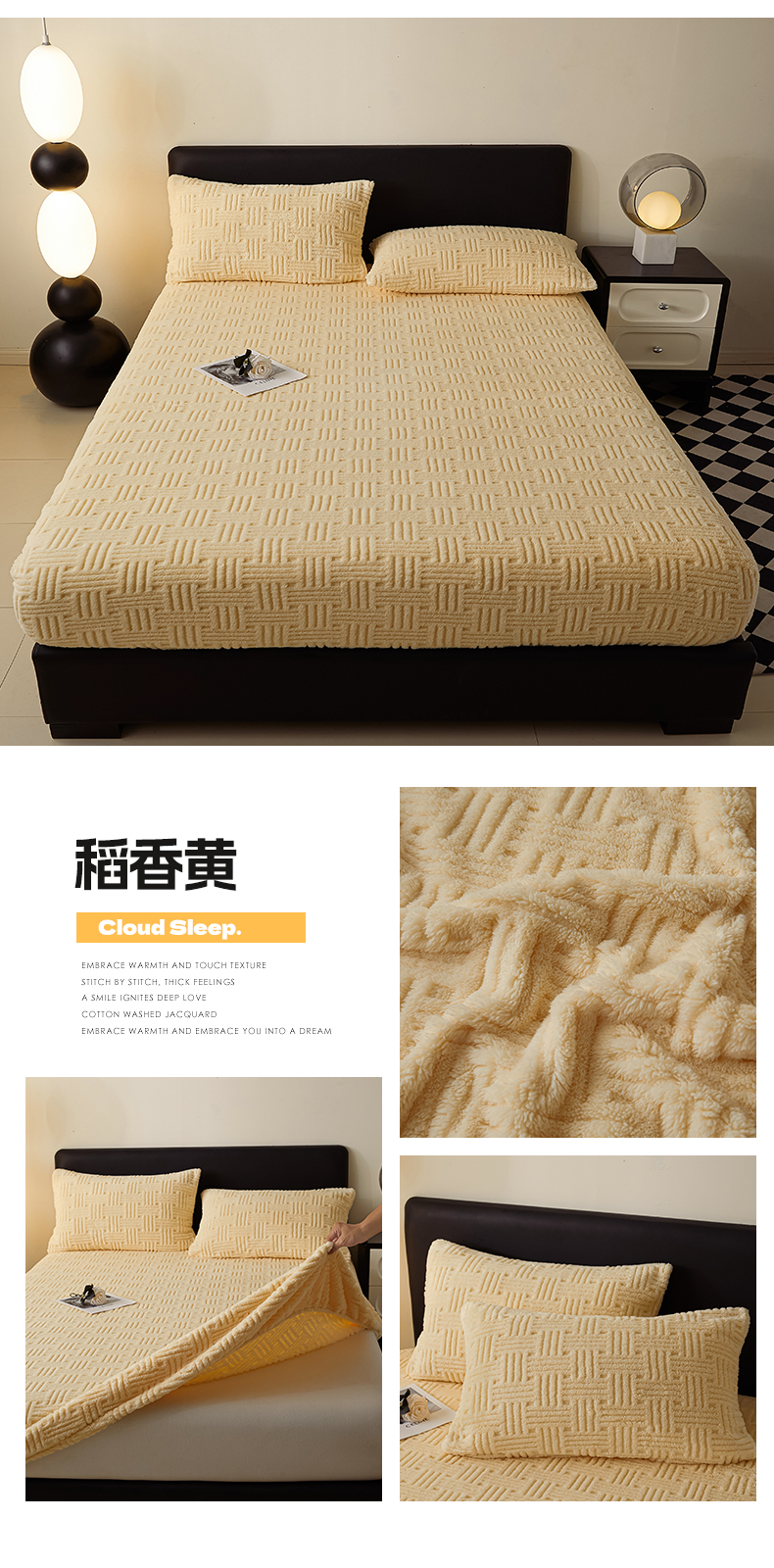 • 91家纺网 家纺一手货源 找家纺 欧邦2025新款提花舒棉绒塔芙绒床笠跨境-场景一 稻香黄