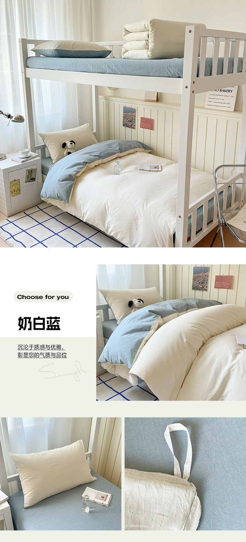 当前位置: 91家纺网 > 商品网购 > 床品套件 > 三件套 > 玖弘家居 2025新款全棉纯棉色织水洗棉学生宿舍三件套四件套上下铺三件套奶白蓝