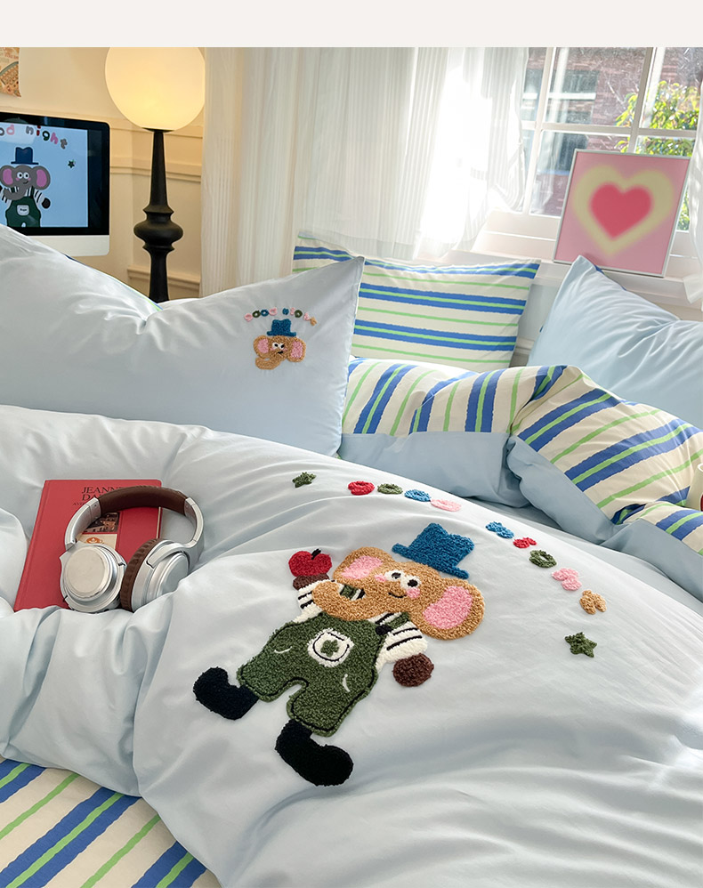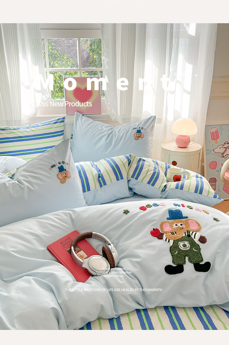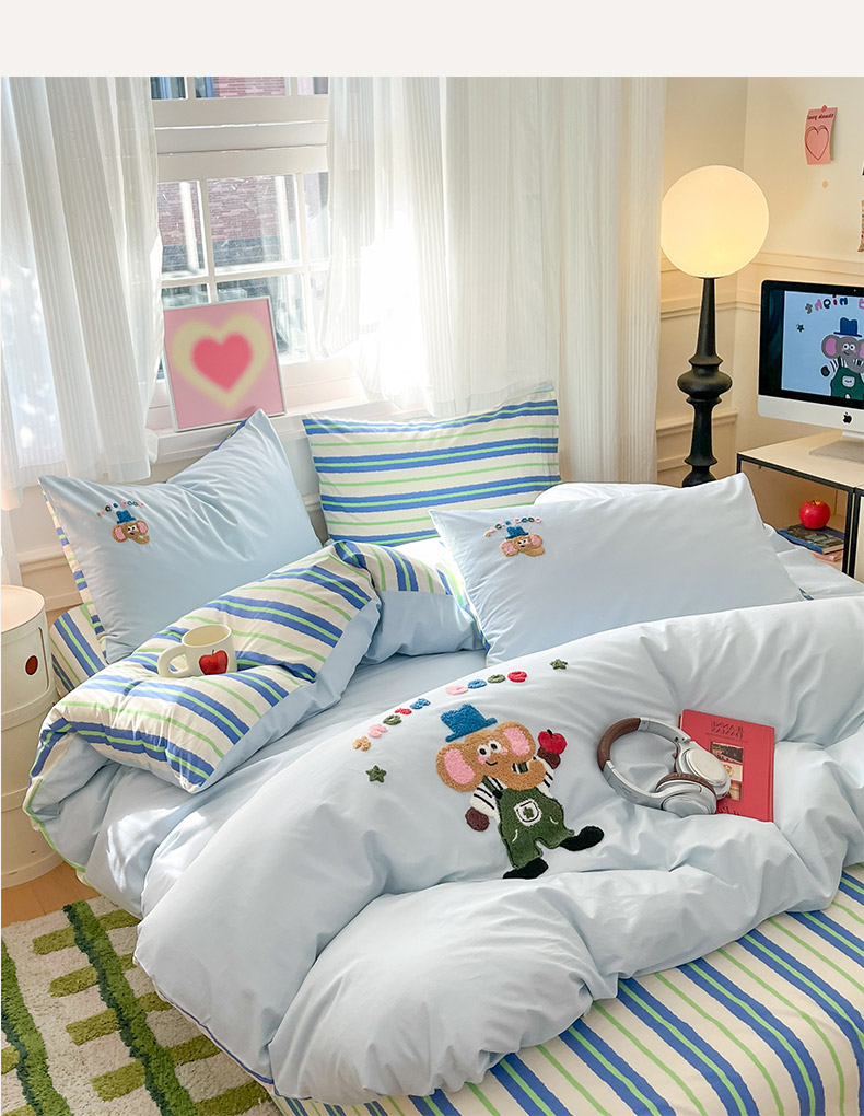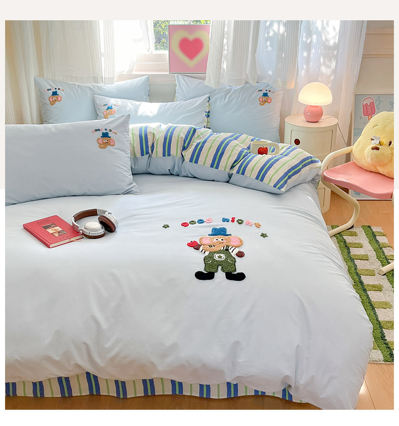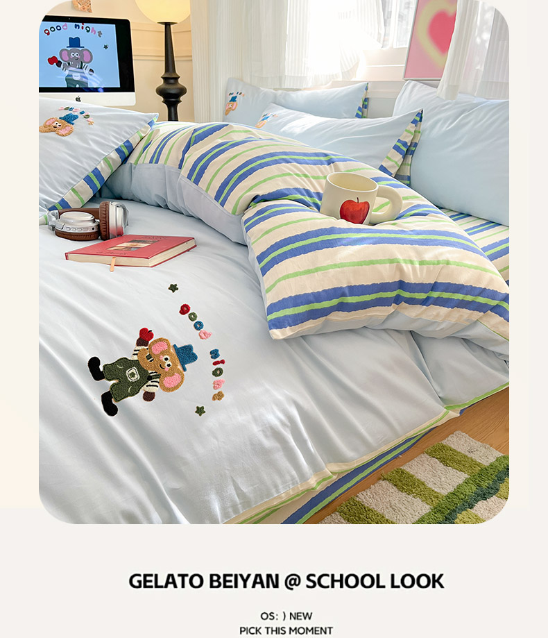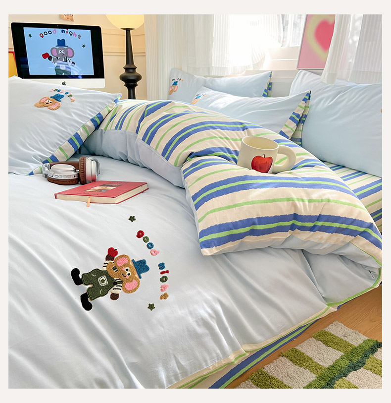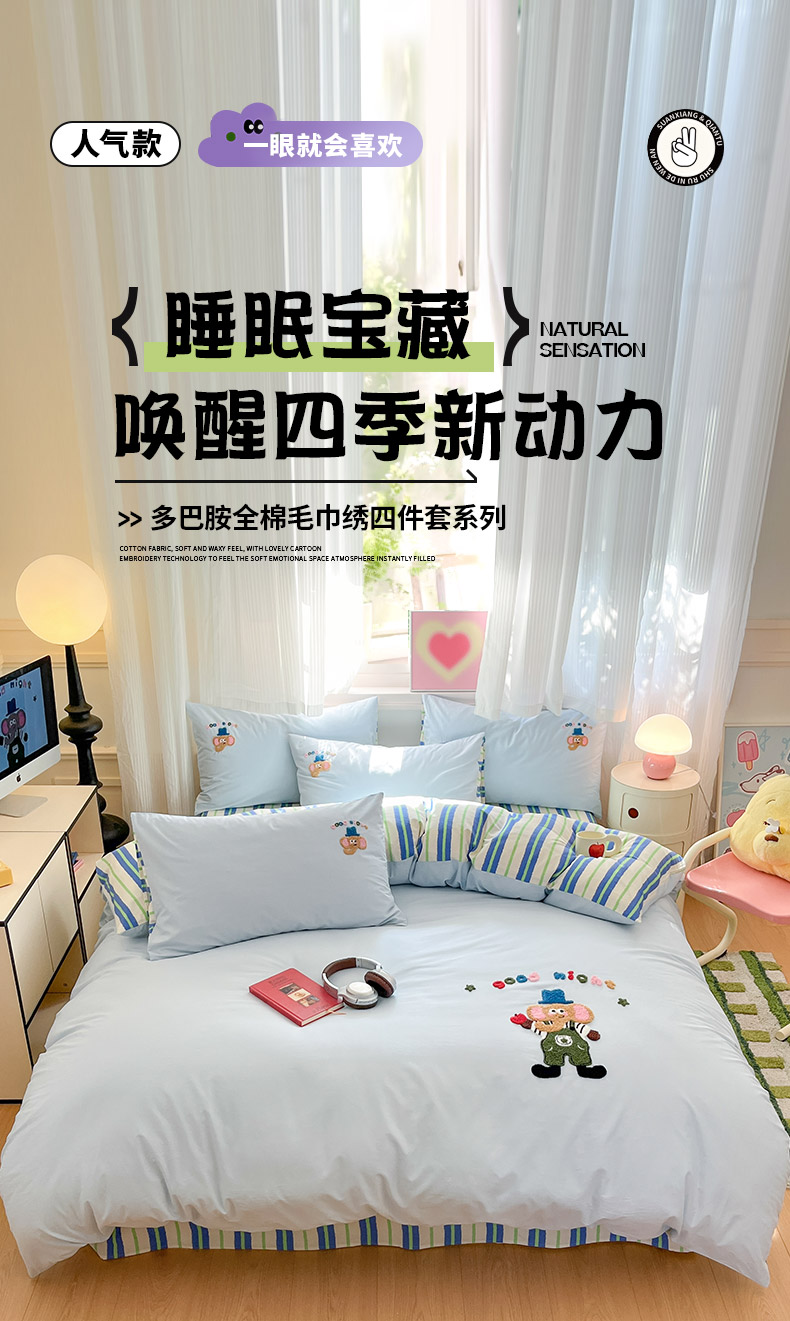 (总)泽西2025新品全棉套件条纹多巴胺卡通毛巾绣宿舍学生三件套纯棉四件套