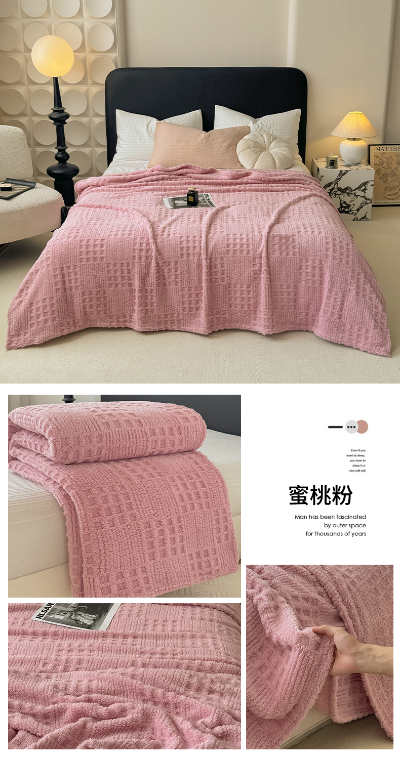 商品名称:穆琪2025新款高克重华夫格舒棉绒办公家用多功能毯子几何方块塔芙绒毛毯 蜜桃粉