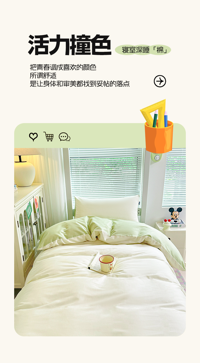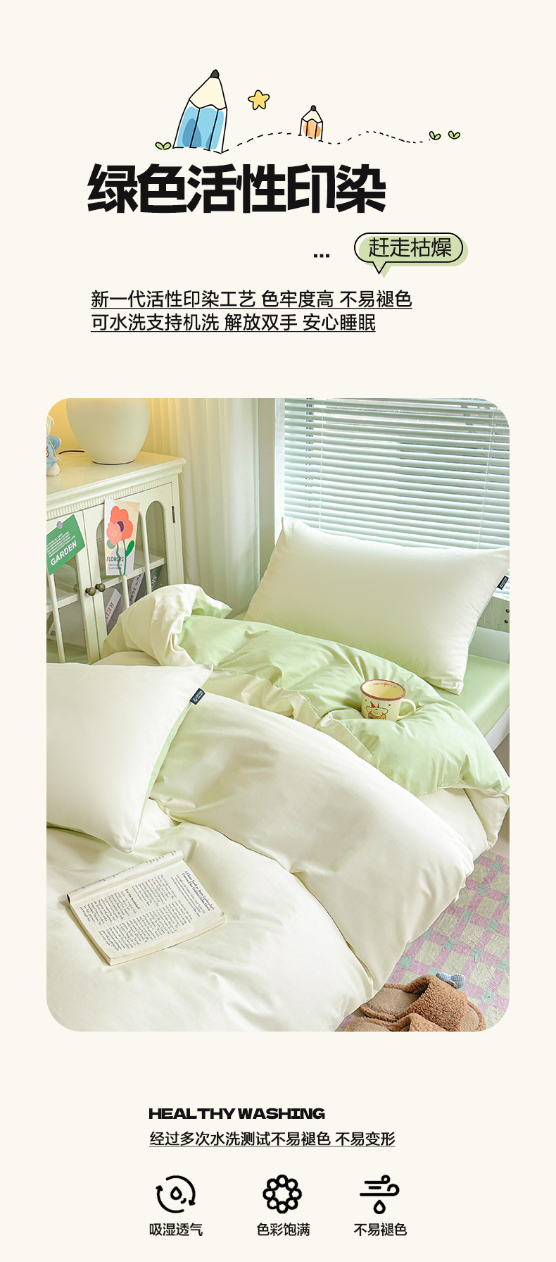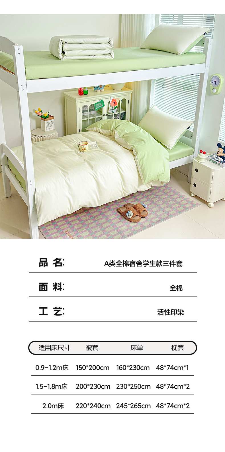 商品名称:麦田家纺 2025新款A类全棉学生宿舍四件套 奶昔白浅绿