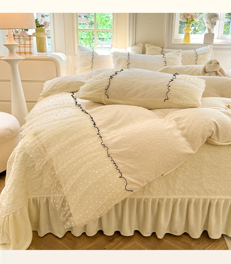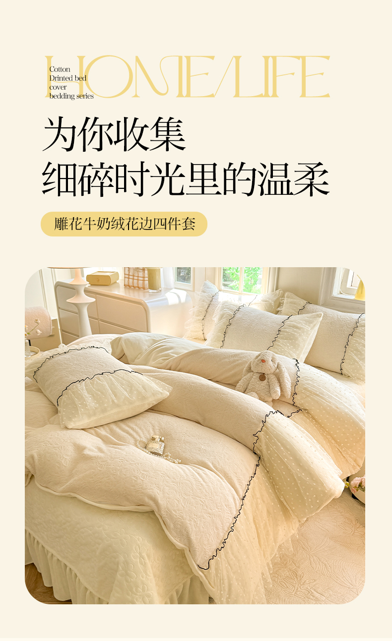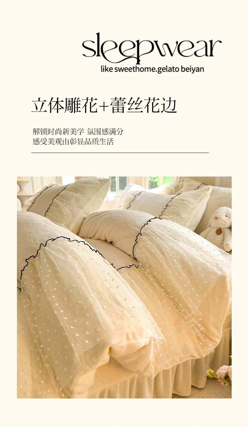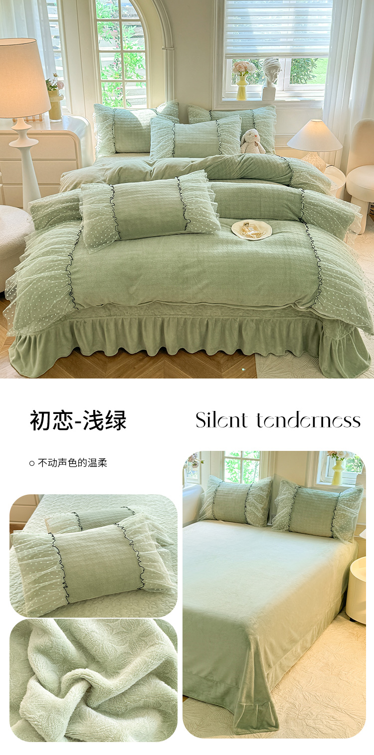 商品名称:唐人居 2025新款雕花牛奶绒花边四件套--初恋系列 初恋-浅绿