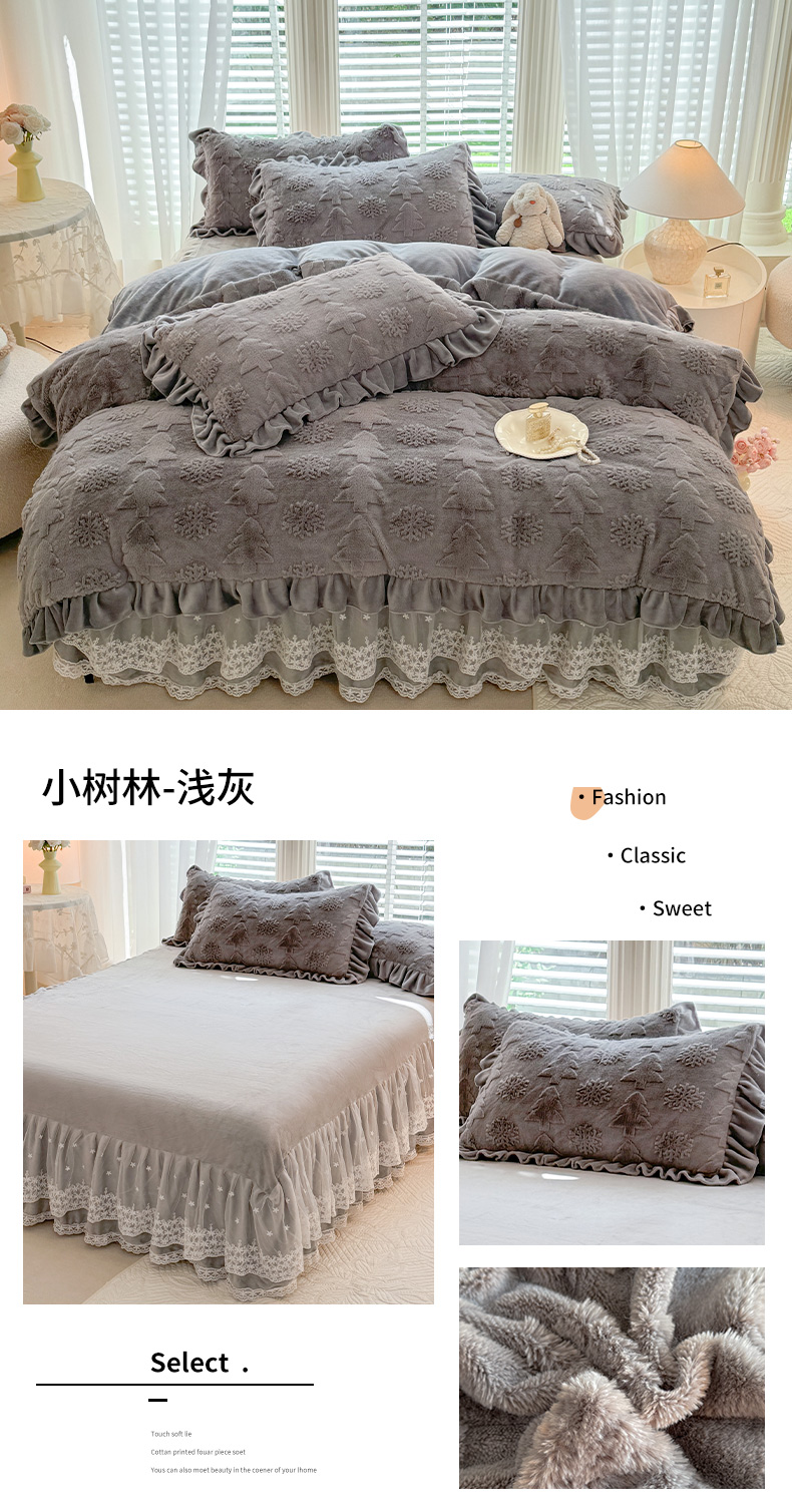 商品名称:唐人居 2025新款雕花花边兔毛绒床裙四件套 花儿朵朵-浅灰